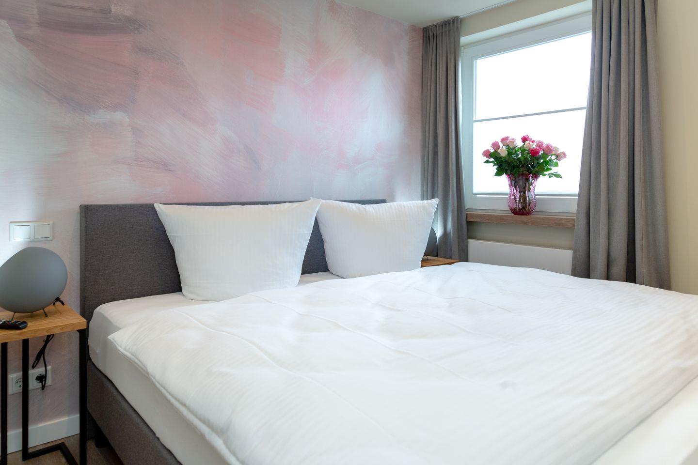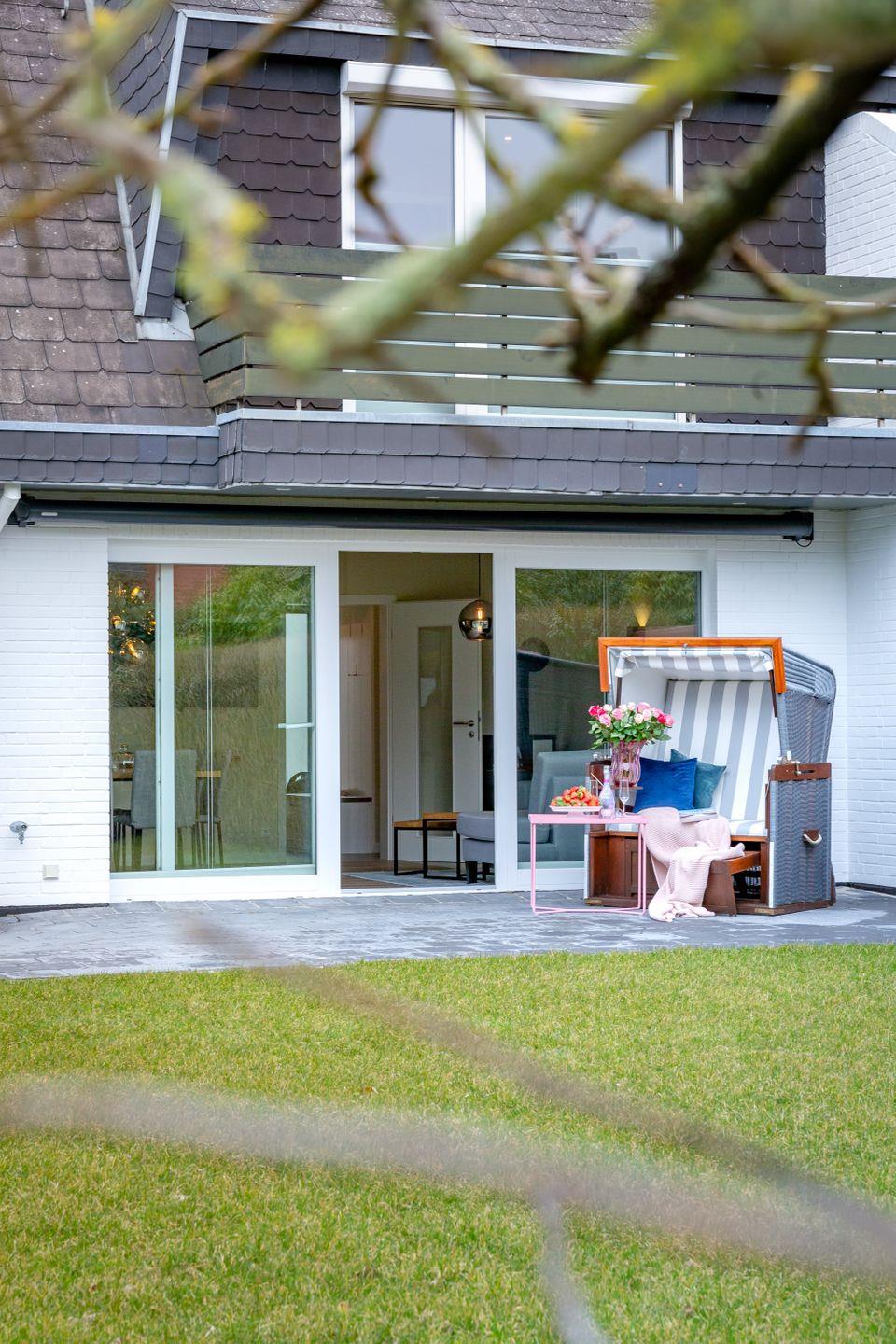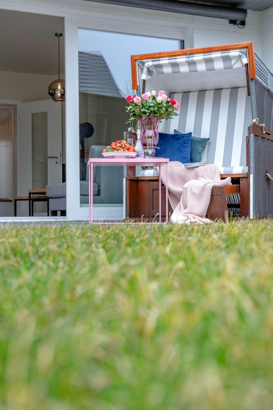 Vom Wohnzimmer aus gelangen Sie auf die großzügige Terrasse und in den Garten, wo Sie in privater Atmosphäre sonnige Stunden genießen können. Ihre Nachtruhe verbringen Sie in zwei gemütlichen Schlafzimmern, eines davon mit Balkon, auf dem Sie Ihren Kaffee am Morgen genießen können. Die Boxspringbetten sorgen für erholsamen Schlaf, während ausreichend Stauraum für Ihre Urlaubsgarderobe vorhanden ist.