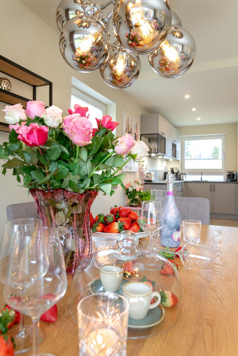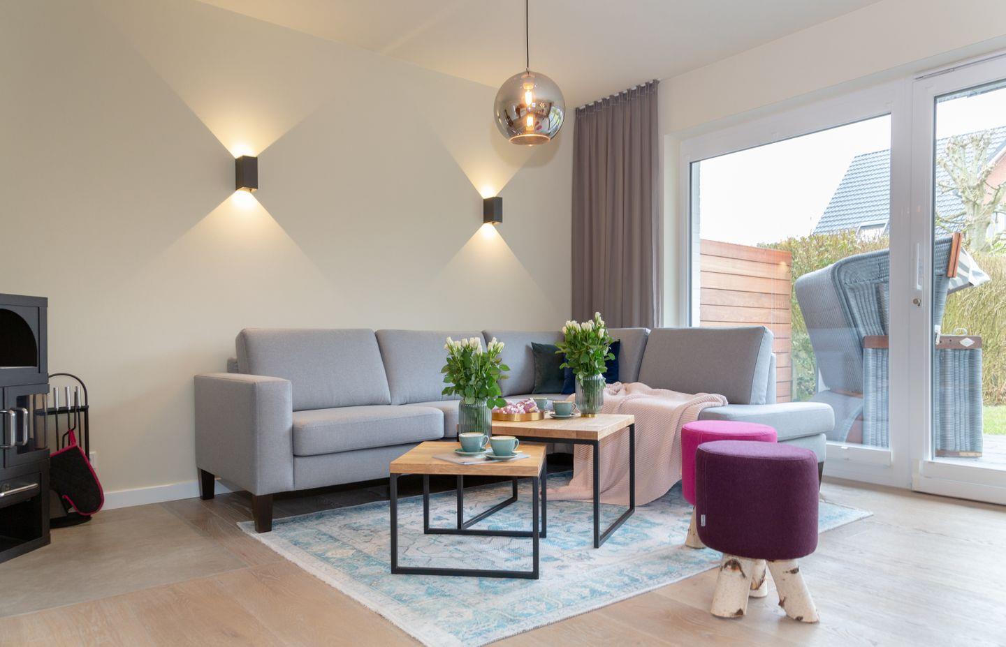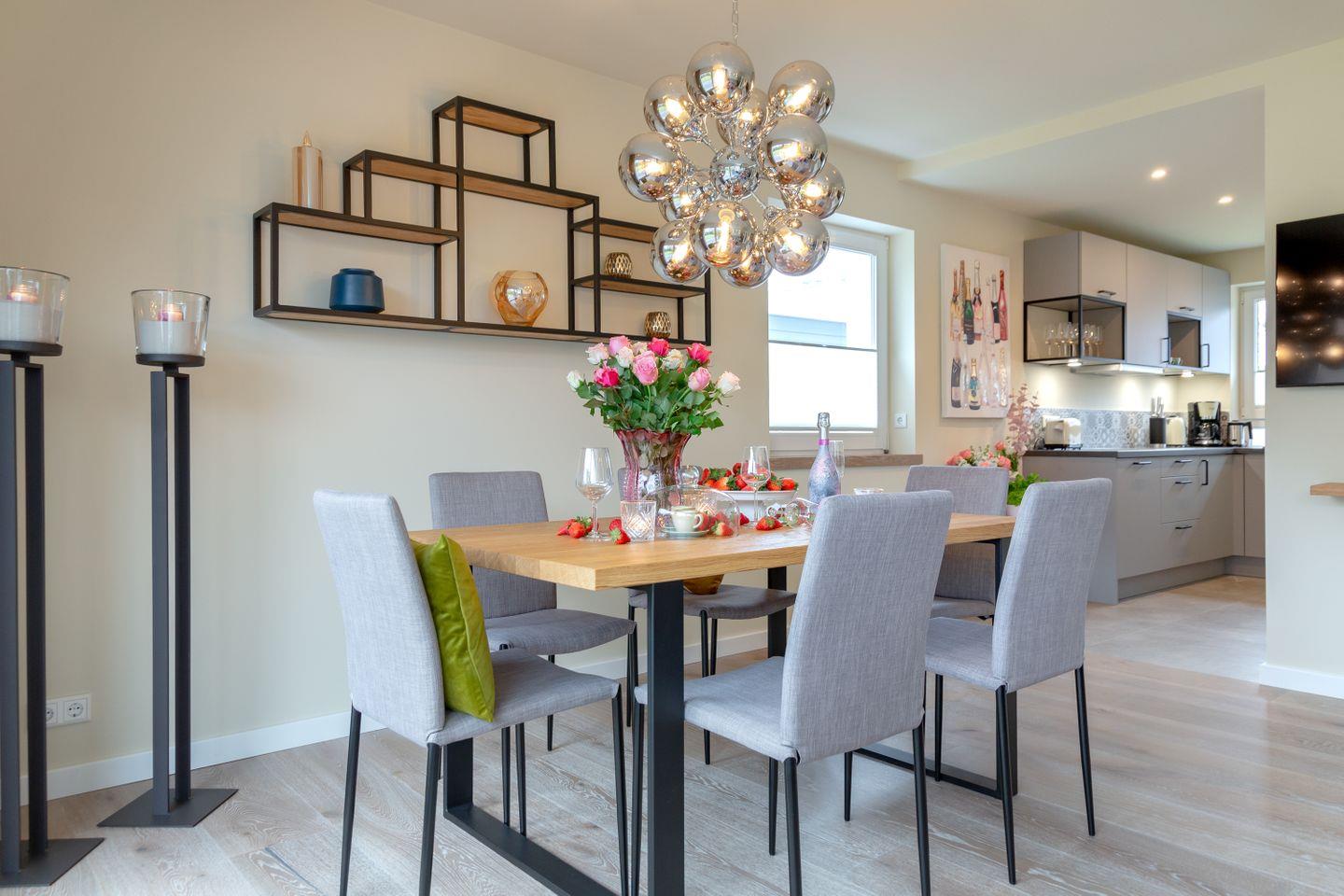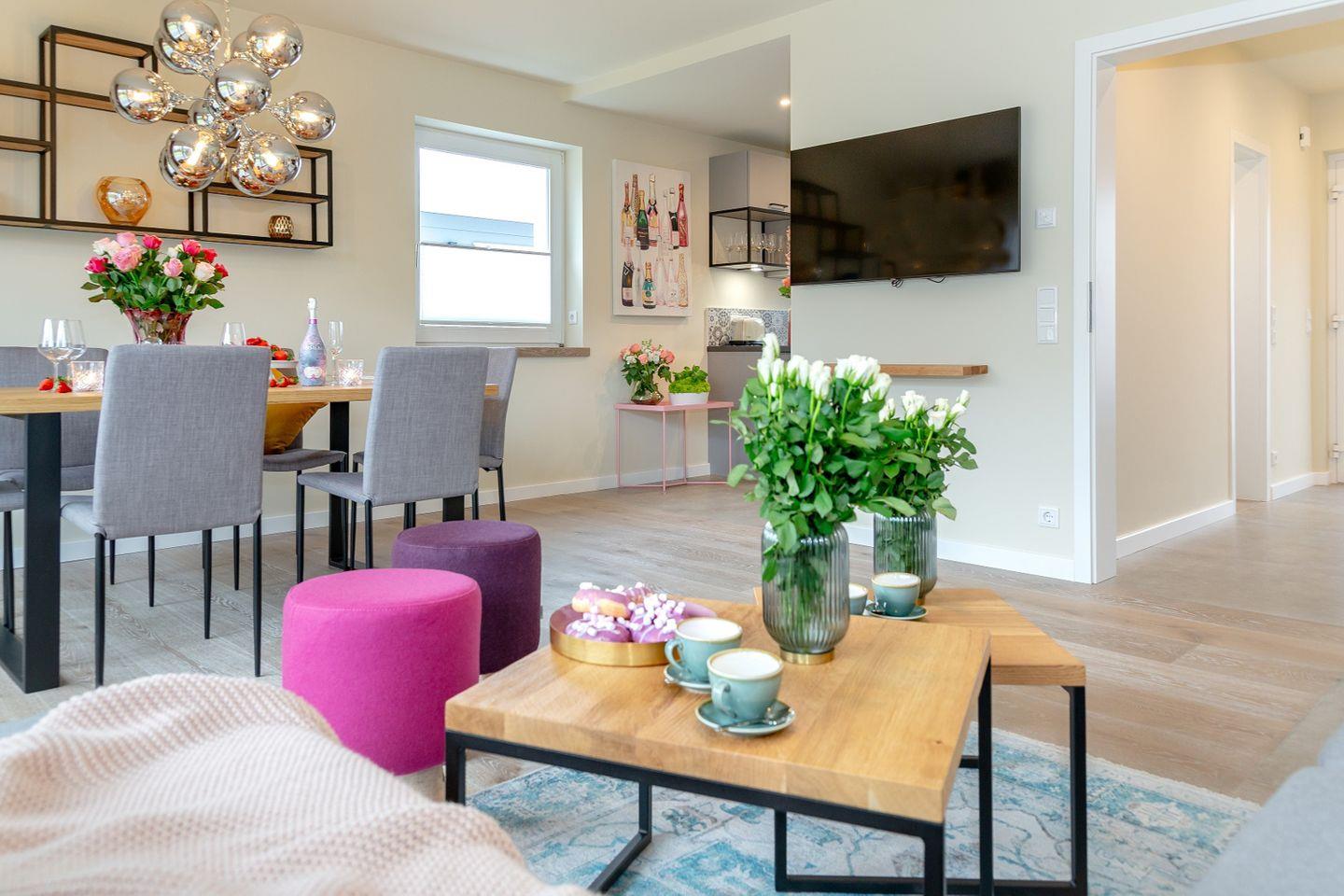 Das helle Wohnzimmer, ausgestattet mit komfortablen Polstermöbeln und edlen Holzfußböden, lädt zum Entspannen ein. Die offene Küche mit angrenzendem Essbereich bietet den perfekten Rahmen für gesellige Stunden mit Freunden und Familie. Dank der hochwertigen Ausstattung können Sie sich hier auch im Urlaub ganz nach Ihren Wünschen selbst versorgen und verwöhnen.
