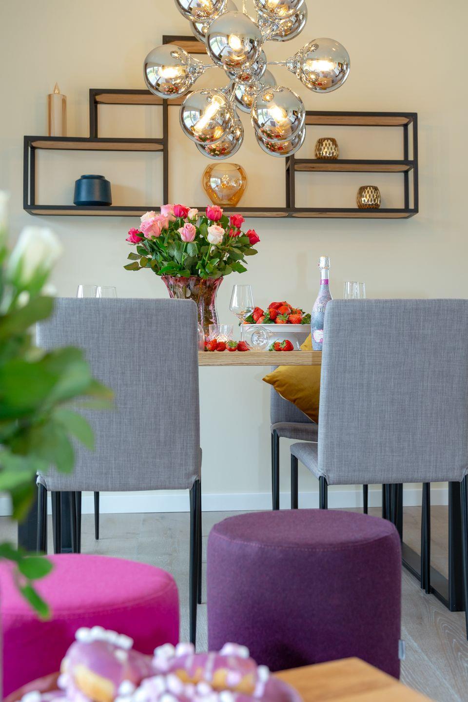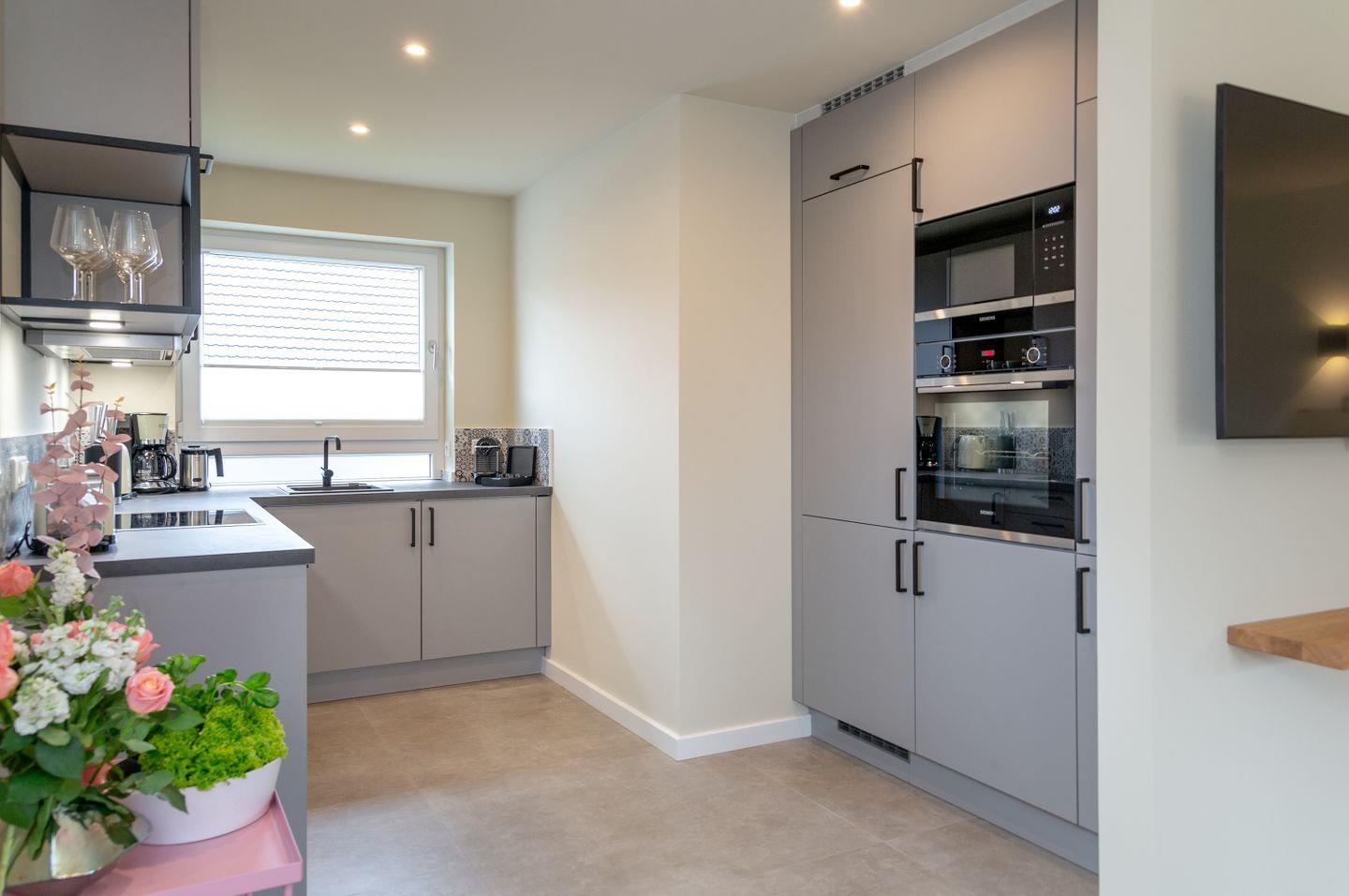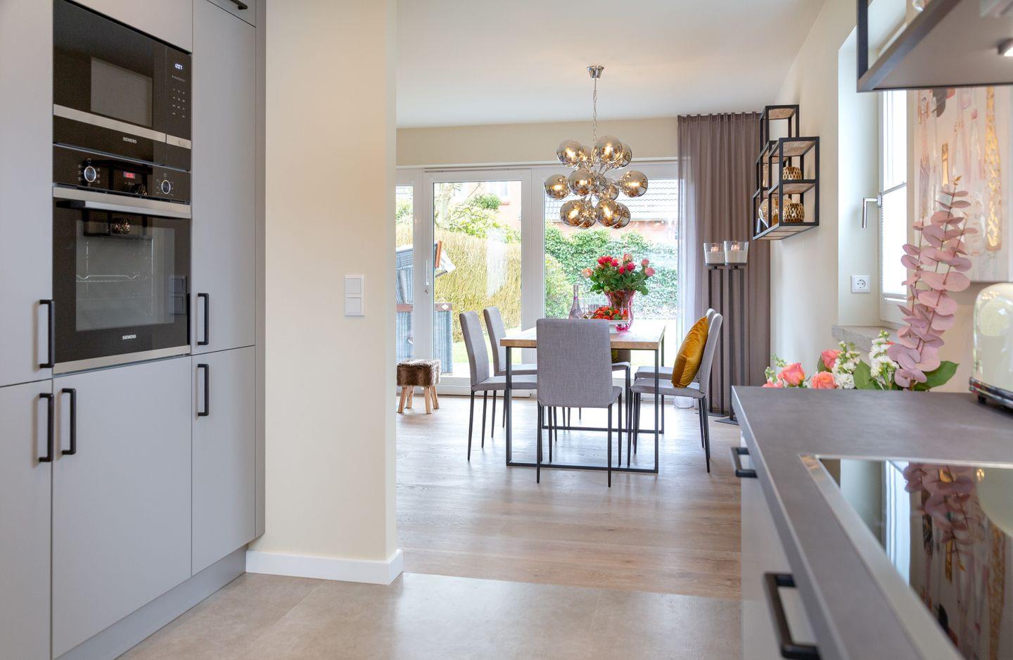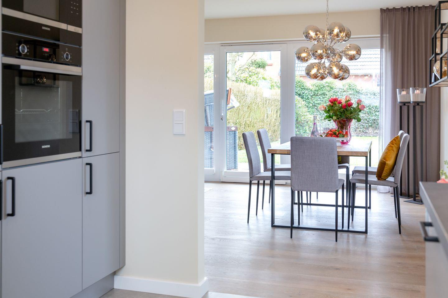 Das helle Wohnzimmer, ausgestattet mit komfortablen Polstermöbeln und edlen Holzfußböden, lädt zum Entspannen ein. Die offene Küche mit angrenzendem Essbereich bietet den perfekten Rahmen für gesellige Stunden mit Freunden und Familie. Dank der hochwertigen Ausstattung können Sie sich hier auch im Urlaub ganz nach Ihren Wünschen selbst versorgen und verwöhnen.
