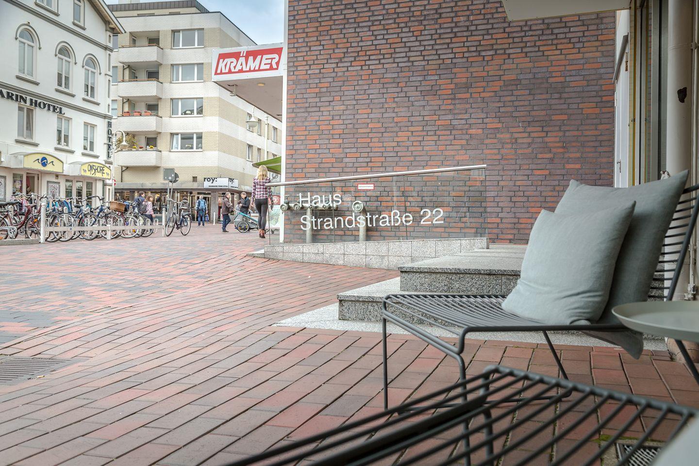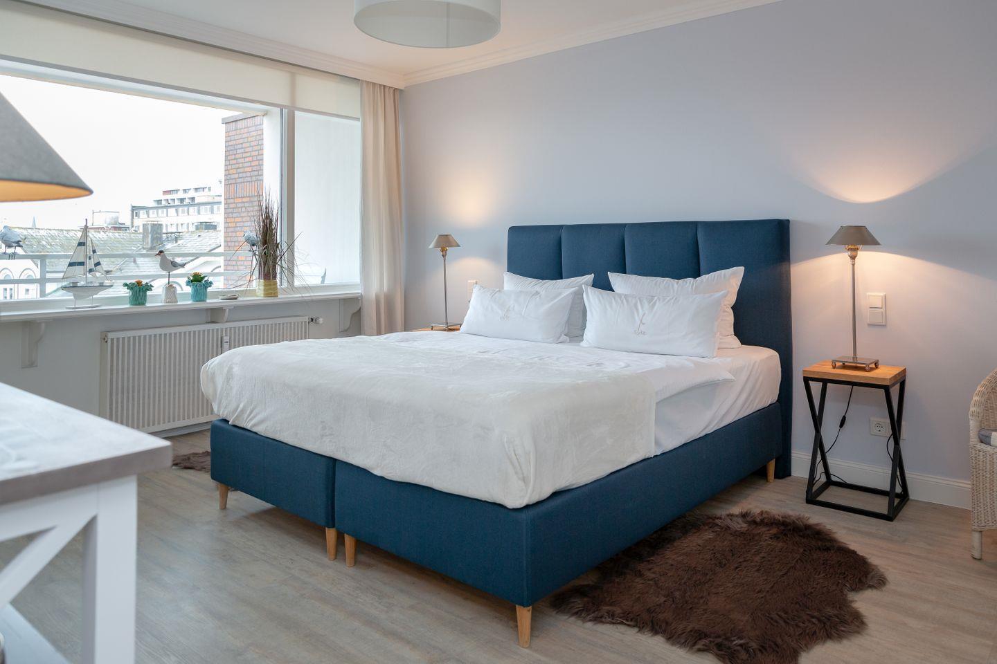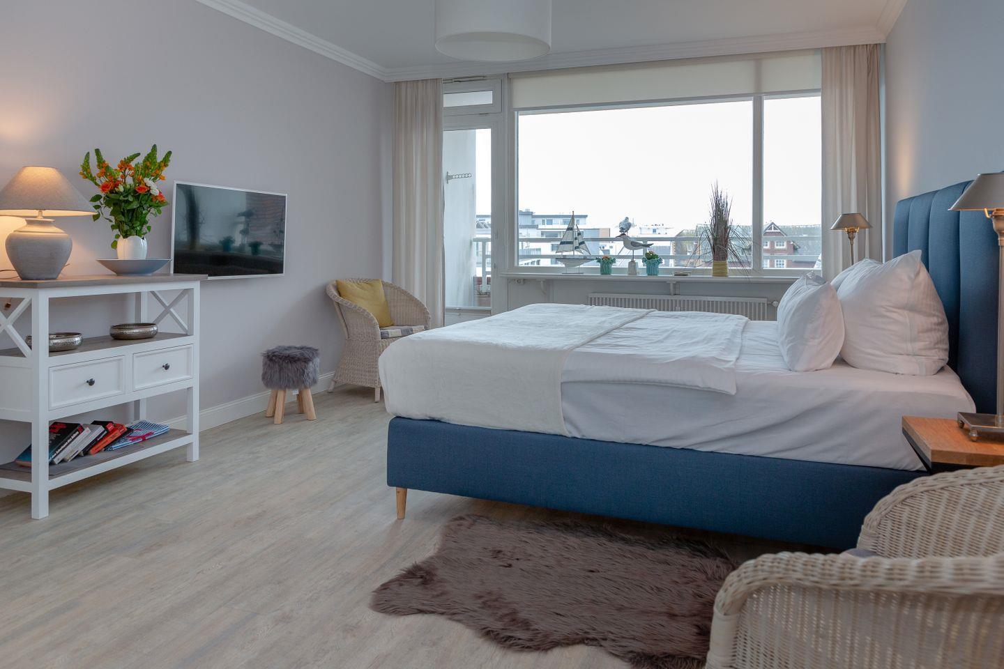 Sie befindet sich in der vierten Etage, welche aber über einen Aufzug mühelos zu erreichen ist. Das geschmackvoll eingerichtete Wohnzimmer umfasst eine offene Küche mit Essbereich, sowie eine gemütliche Sitzlandschaft mit großem Flachbildfernseher und dem Zugang zu dem größeren der beiden Balkone. Die modern ausgestattete Küche mit Durchreiche zum Essbereich bietet alles, was man zum Kochen benötigt. Das großzügige Schlafzimmer verfügt über ein hochwertiges Boxspringbett sowie Zugang zum kleineren Balkon und zum komfortablen Duschbad en Suite. Zusätzlich ist ein Gäste-WC vorhanden. Die beiden südlich ausgerichteten Balkone mit Blick über die Dächer von Westerland bieten ausreichend Platz zum Verweilen und Sonnenbaden. Entsprechendes Mobiliar ist vorhanden. Ein Stellplatz steht Ihnen in einer Parkgarage ganz in der Nähe zur Verfügung. Ihr Fahrzeug sollte allerdings eine Höhe von 1,80m nicht überschreiten.