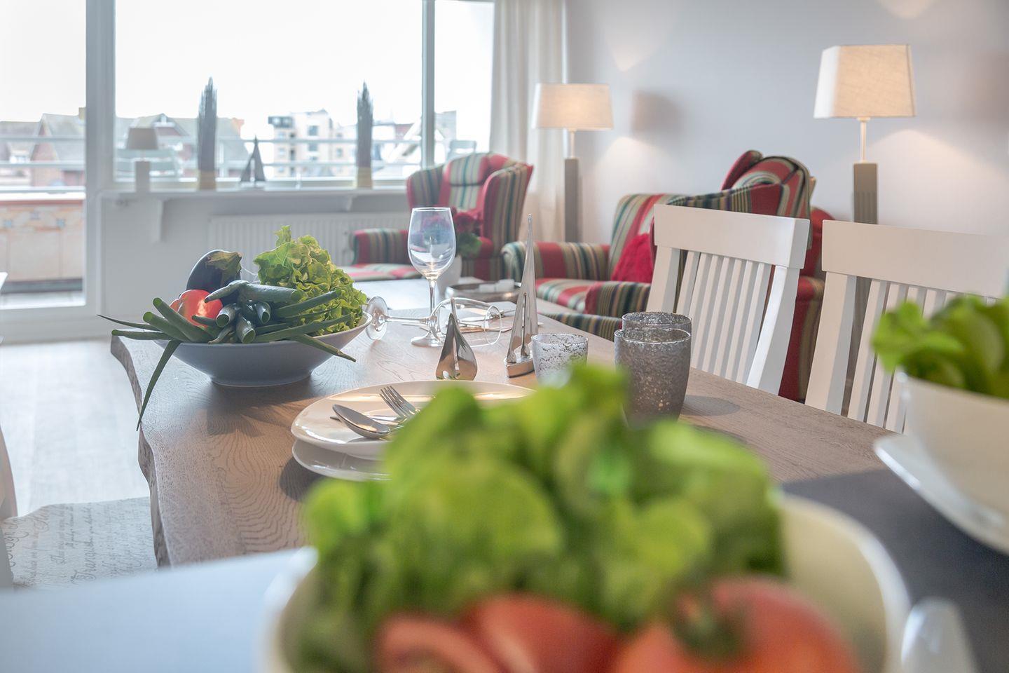 Die Ferienwohnung Möwennest in Westerland bietet auf 68 m² ruhigen Komfort für zwei Personen mit zwei Balkonen und Tiefgaragenstellplatz.