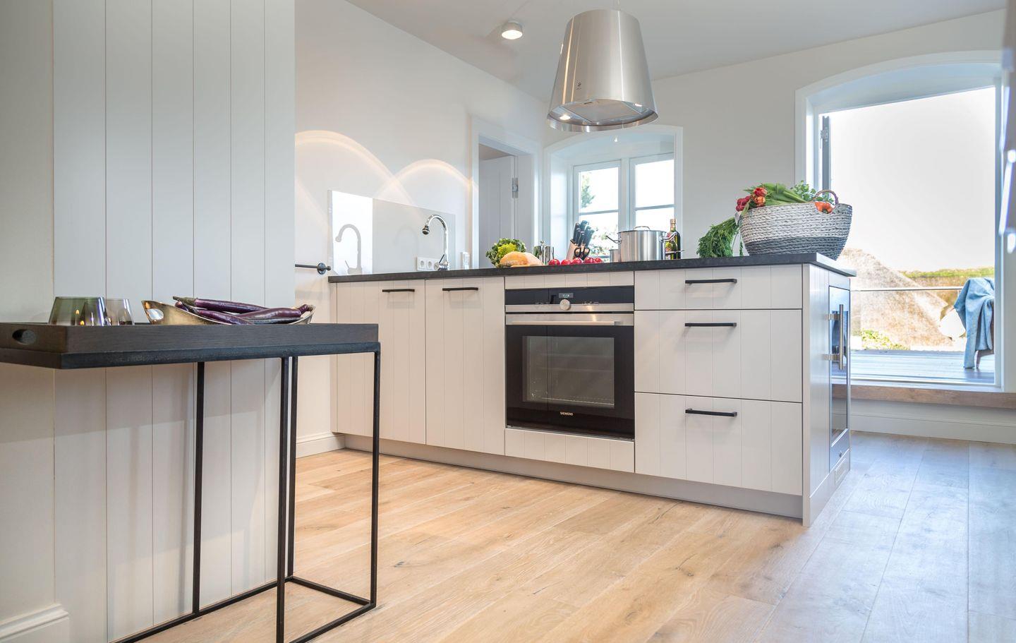 Die Küche ist offen zum Wohnzimmer gestaltet und vollumfänglich ausgestattet. Hier finden Sie alles, was Sie für einen gelungenen Aufenthalt benötigen: Von der Spülmaschine über die moderne Induktionsplatte bis hin zu einer Nespresso-E Kaffeemaschine – Sie können Ihrer Kreativität beim Kochen freien Lauf lassen. Außerdem stehen Ihnen Geschirr und Besteck, Küchengeräte wie Toaster und Wasserkocher sowie ein Kühlschrank mit Gefrierfach zur Verfügung.