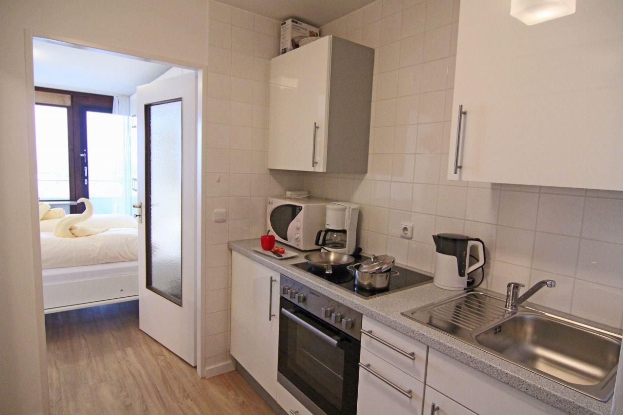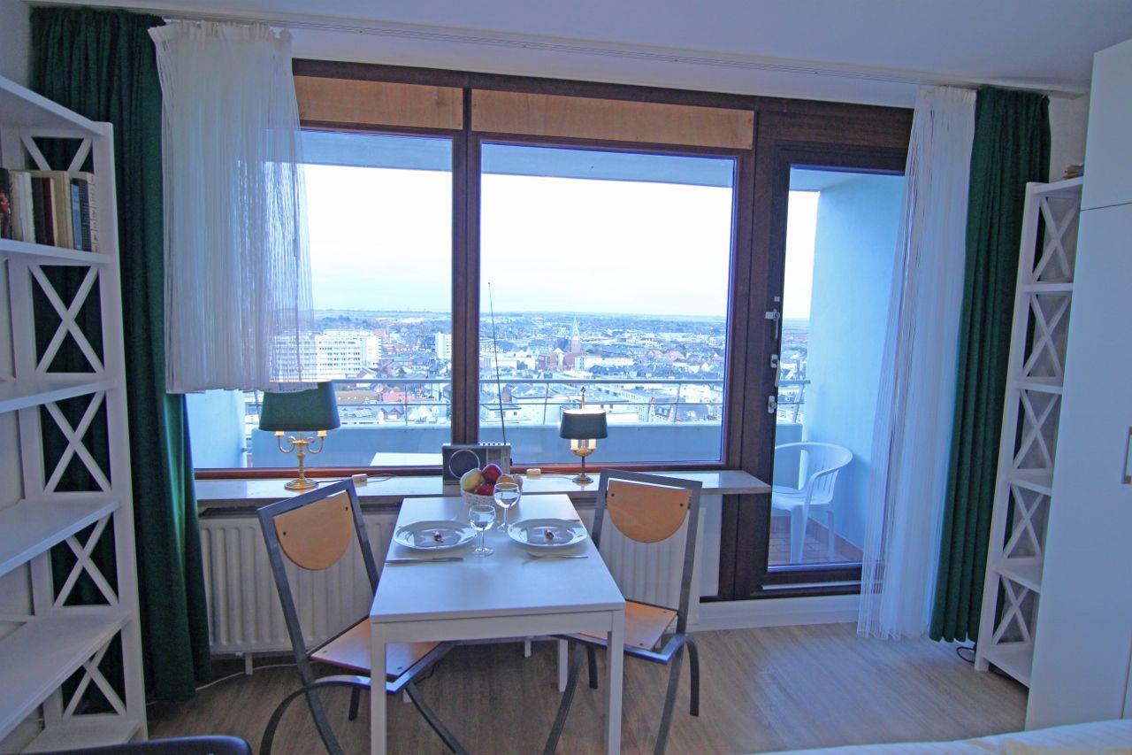 Willkommen im Appartement "Binnenkiker"! Diese Ferienwohnung ist ein stiller Star im Sortiment: Gelegen im 13. Stock des Westerländer Kurzentrums bietet sie einen unglaublichen Blick über ganz Westerland bis aufs Wattenmeer und wer möchte, kann den Sonnenaufgang vom Bett aus verfolgen. Der kleinen Balkon hat also eine Traumkulisse, nicht nur fürs Frühstück. Die Ferienwohnung ist 30 Quadratmeter groß. Selbstverständlich gibt es einen Fahrstuhl, aber Sportliche können natürlich gern auch das Treppenhaus für's Training nutzen.