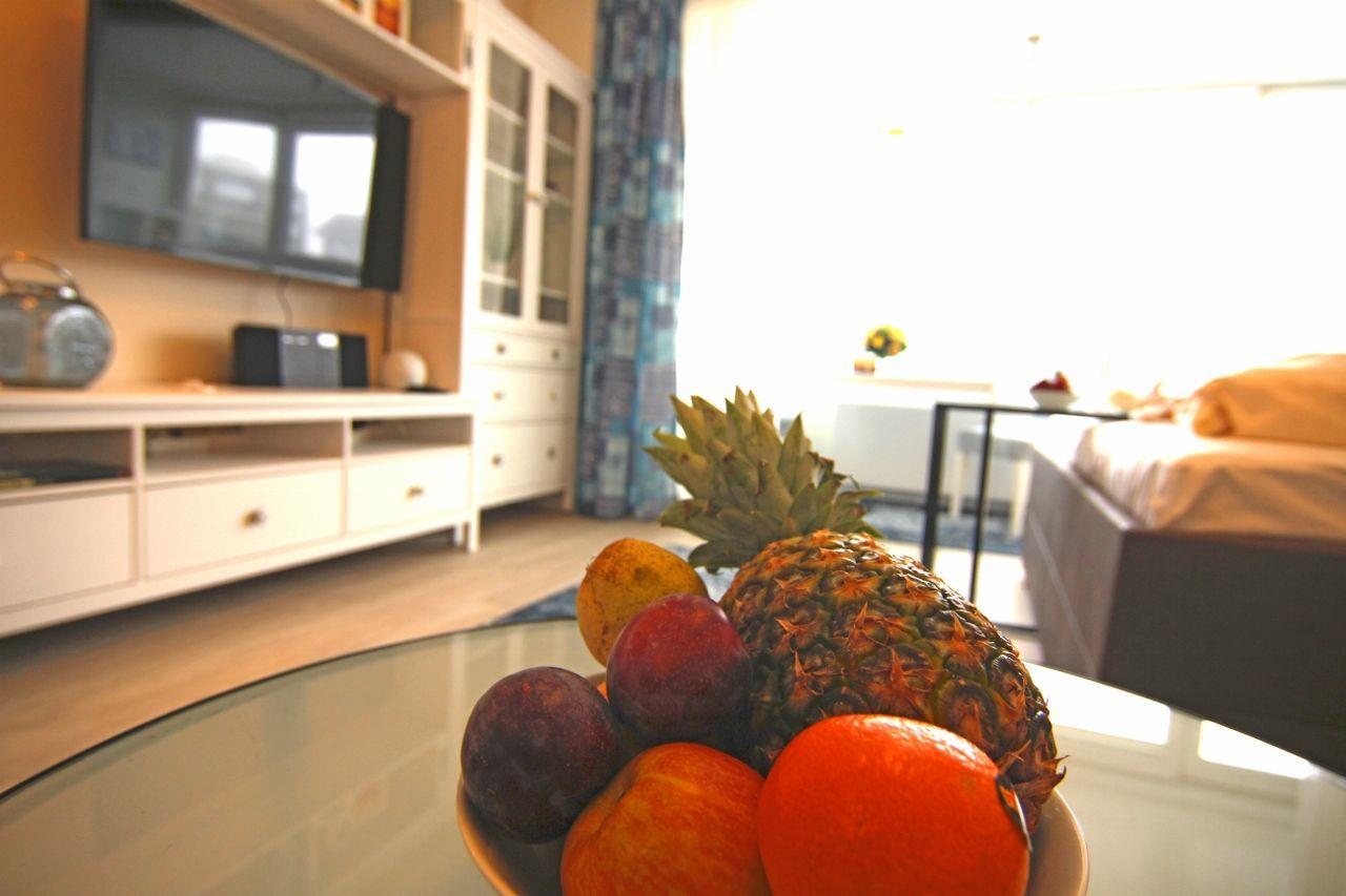 Willkommen im Wohlfühl-Appartement "Freya". Genießen Sie Ihren Urlaub direkt in Strand- und Zentrumsnähe. Freya bietet Platz für zwei Personen und liegt im dritten Stock, von wo Sie die Aussicht auf die Dünen und einen kleinen Meerblick genießen können. Die Wohnung wurde Anfang 2017 komplett renoviert und mit viel Liebe eingerichtet. Sie verfügt über ein modernes Boxspringbett und eine gemütliche Sofaecke, schwenkbaren Flat-Screen-Fernseher und HiFi-Anlage mit USB-Anschluss. Die gemütliche Essecke sowie ein Schreibtisch befinden sich direkt am großen Panoramafenster. WLAN steht kostenlos zur Verfügung. Freuen Sie sich auf eine zum Wohnbereich offene Küche und ein modernes, helles Duschbad. Münz-Waschmaschine und /-Trockner gibt es im Keller. Ihr Auto parkt kostenlos direkt am Haus. Ein Glas-Fahrstuhl ist vorhanden.