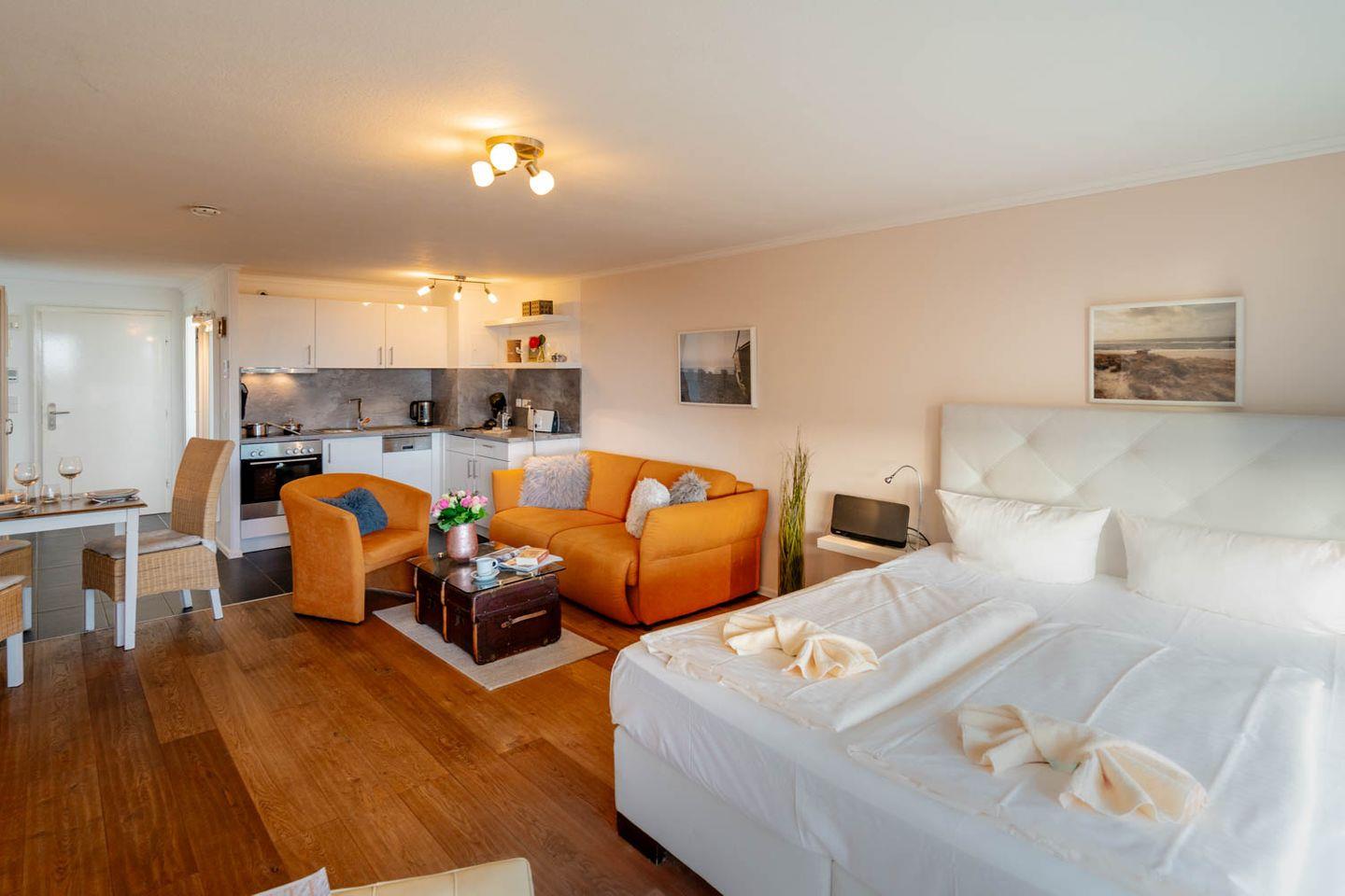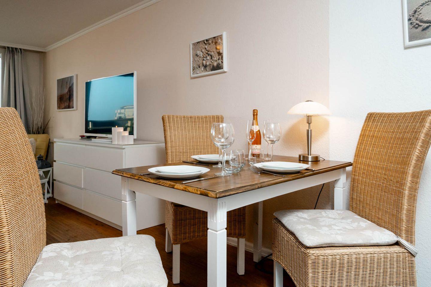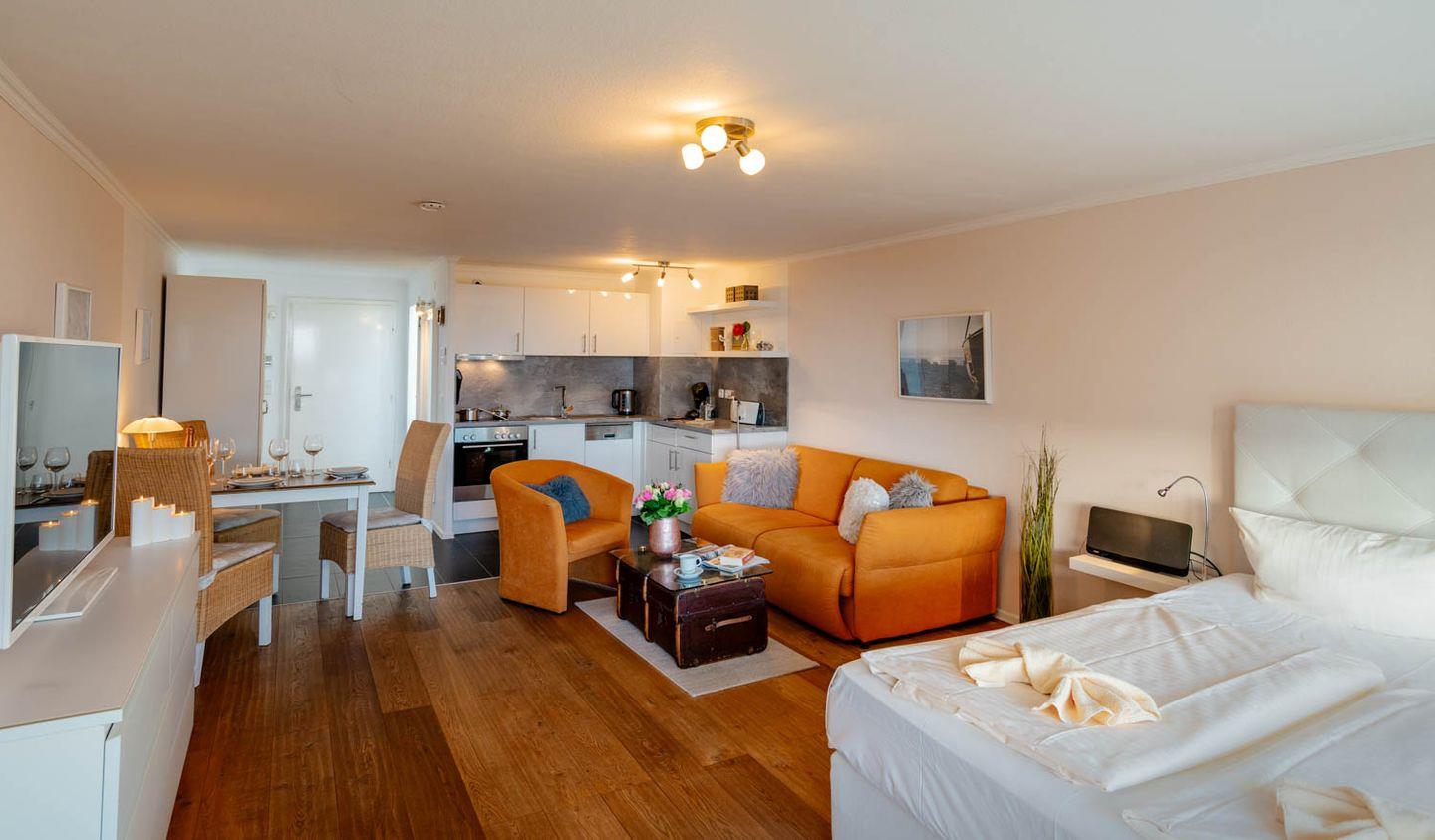 Willkommen im Appartement "Sternenlicht". Diese Ferienwohnung liegt direkt im Zentrum von Westerland, nah an den Füßgängerzonen Friedrichstraße und Strandstraße und im 4. Stock eines Wohnhauses - selbstverständlich mit Fahrstuhl. Zum Strand sind es nur fünf Minuten Fußweg, die Wohnung ist circa 40 Quadratmeter groß und ein kleiner Balkon mit Blick auf die "Alte Post" und die Stadtgalerie gehört auch noch dazu.