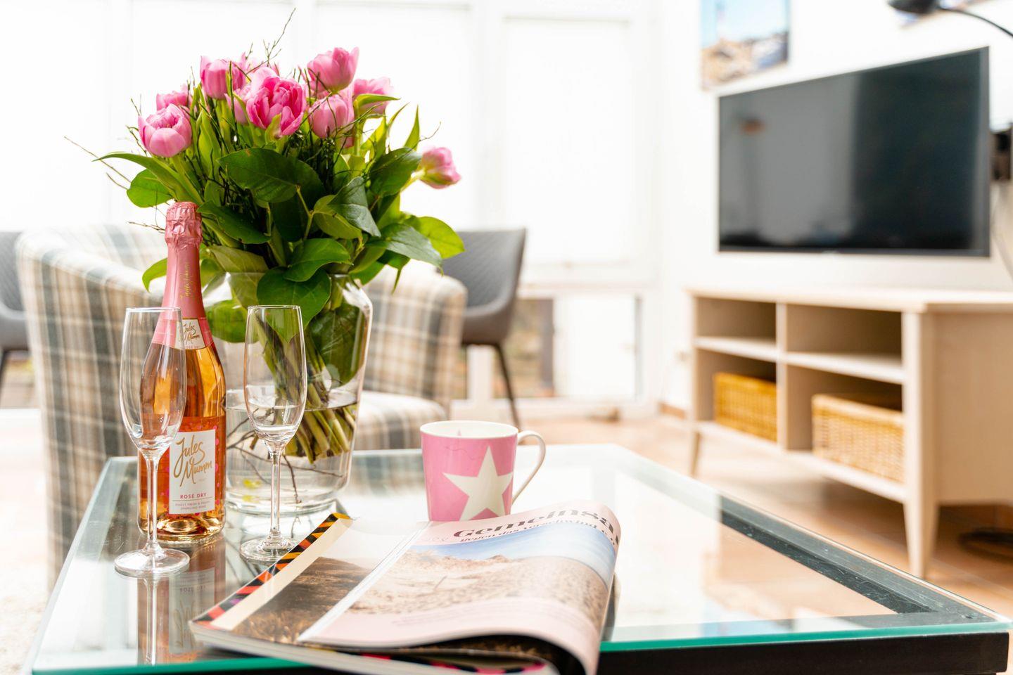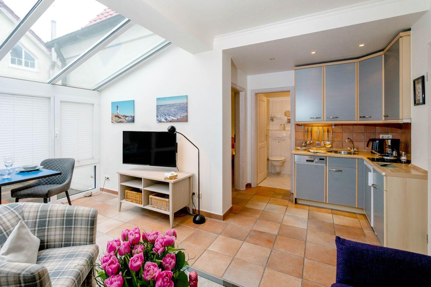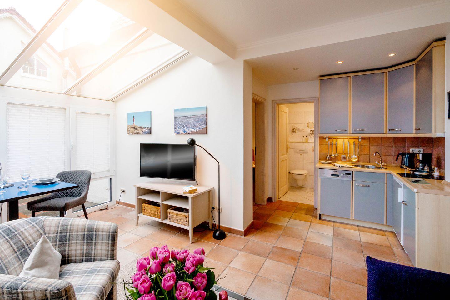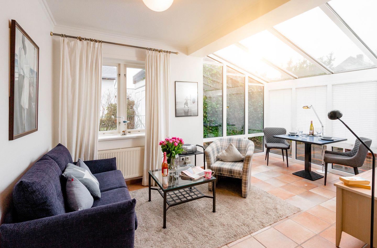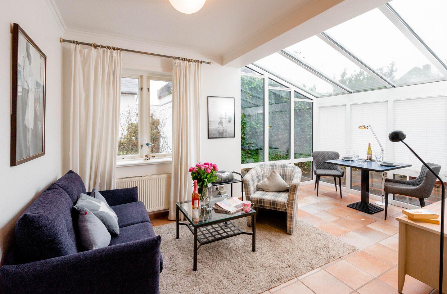 Helle, ebenerdige Ferienwohnung mit Wintergarten und Terrasse, nur fünf Minuten vom Strand in Westerland, Sylt entfernt.