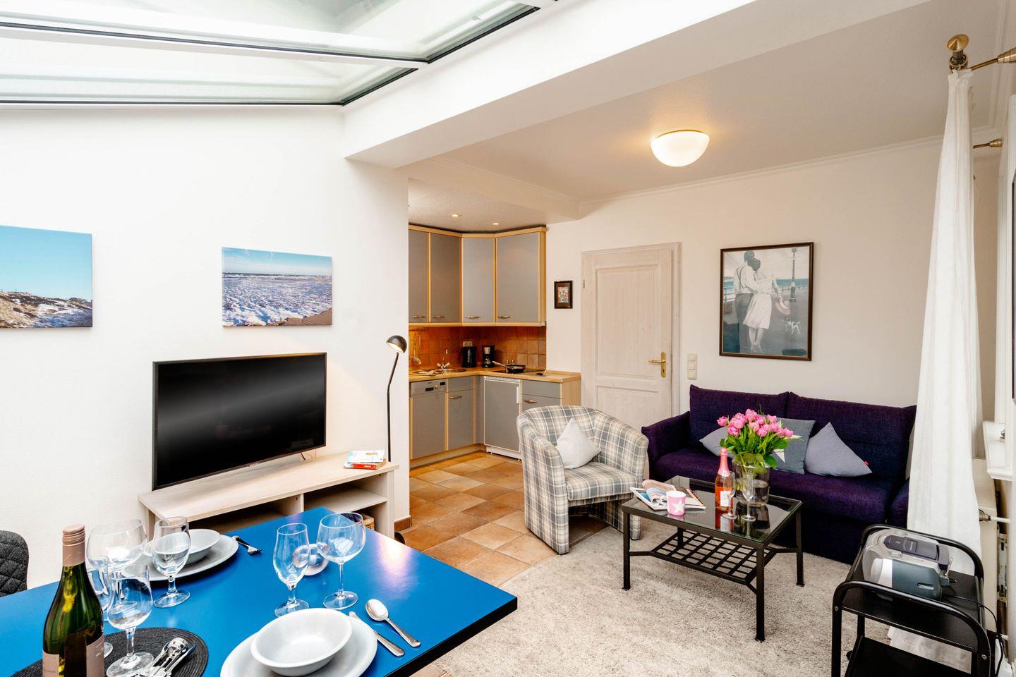 Die ebenerdige Westerländer 2-Zimmer-Ferienwohnung „Bootsmann“ besticht mit viel Licht durch ihren attraktiven Wintergarten und durch ihre Lage in einer ruhigen Seitenstraße. Von hier aus sind es nur fünf Minuten zum Strandübergang „Friesische“, wie ihn die Einheimischen verknappt nennen. Dieses Ferienappartement ist ungefähr 40 Quadratmeter groß und perfekt für zwei Personen, hat sogar eine Terrasse, sehr schönen Plavoizen-Boden und ein Schlafzimmer mit Doppelbett.