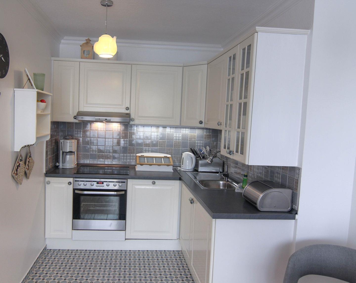 Die Wohnung hat einen Westbalkon, ein Schlafzimmer mit Doppelbett und ein Wohnzimmer mit Schlafcouch, sodass hier bis zu drei Personen untergebracht werden können. Sie ist in der Trendfarbe Beige gehalten, wurde vor Kurzem renoviert und detailverliebt neu ausgestattet. Hingucker: Der coole Couchtisch mit der Schiffsschraube als Standfuß. Und natürlich muss erwähnt werden, dass dieses Mehrparteienhaus allen Komfort bietet: Waschmaschine.