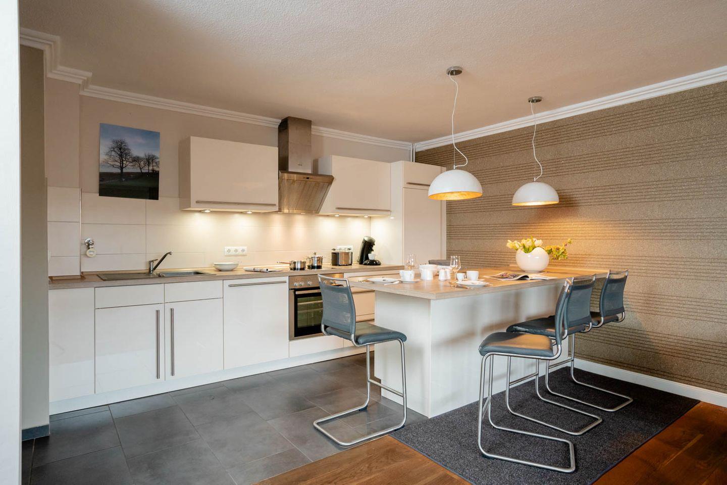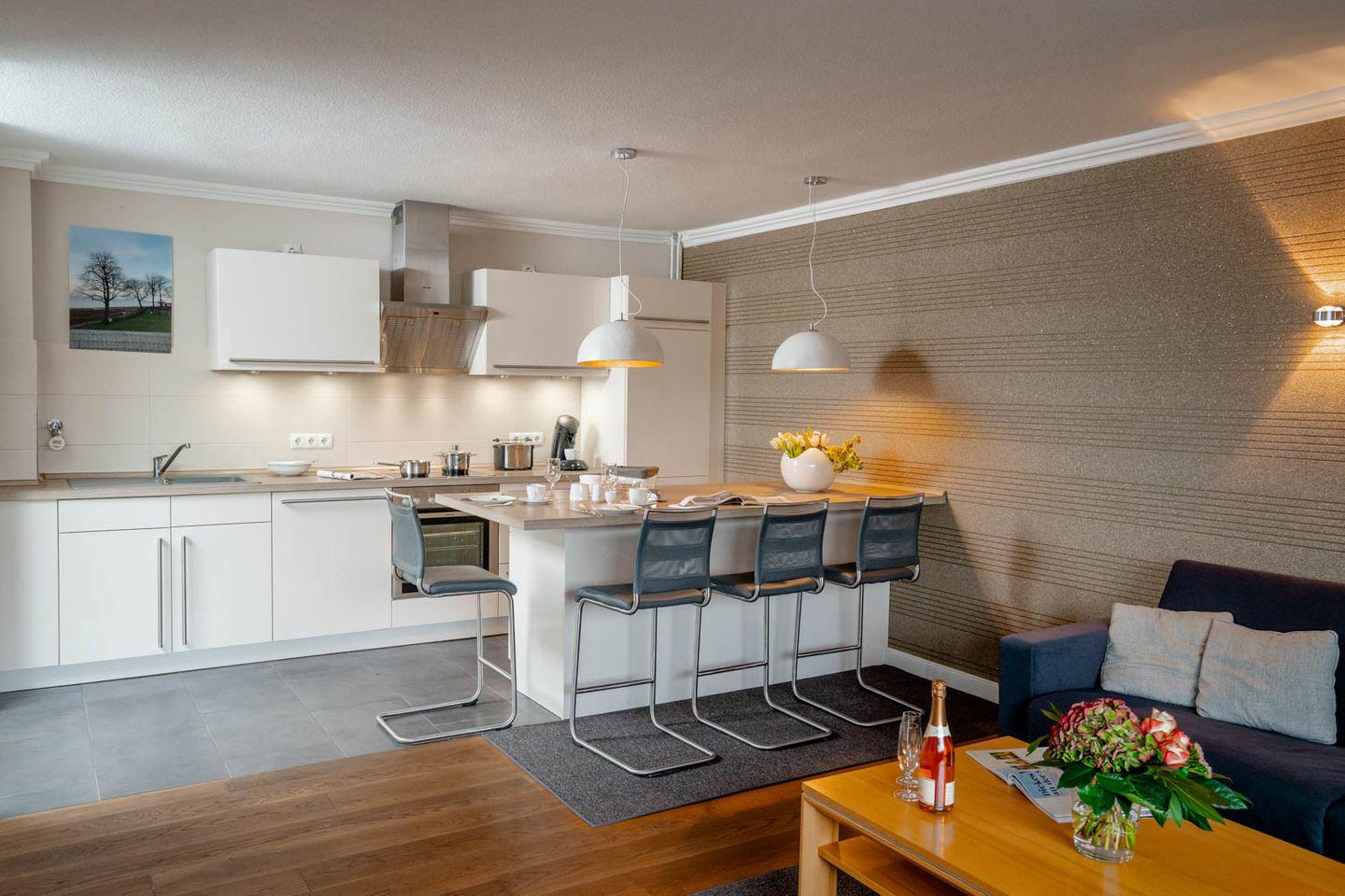 Moin Moin, Willkommen in "Strönholt". Diese mit vier Sternen ausgezeichnete Ferienwohnung ist definitiv ein "Wow"-Appartement: Die grundsanierte und sehr stylish eingerichtete 2-Zimmer-Wohnung liegt zentral im Herzen von Westerland in der Fußgängerzone und in einem Appartementhaus im dritten Stock, inklusive Fahrstuhl. Die Wohnfläche beträgt circa 60 Quadratmeter. Die großzügige Sitzecke und die coole offene Wohnküche sind echte Hingucker.