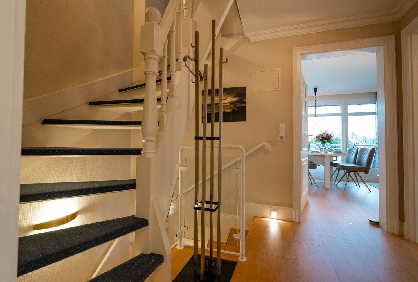 Moin Moin und Willkommen in "Hüs de Klöwen": Dieses moderne 4-Sterne-Ferienappartement gefällt auch anspruchsvollsten Urlaubern: Es liegt im ersten Stock einer Doppelhaushälfte und ertreckt sich attraktiv über zwei Ebenen. Die Lage ist ruhig und der Weststrand sowie das Zentrum in wenigen Fußminuten erreichbar. Die helle und in edlen Weiß- und Grautönen gehaltene Wohnung ist ungefähr 70 Quadratmeter groß, hat auch einen eigenen möblierten Balkon.