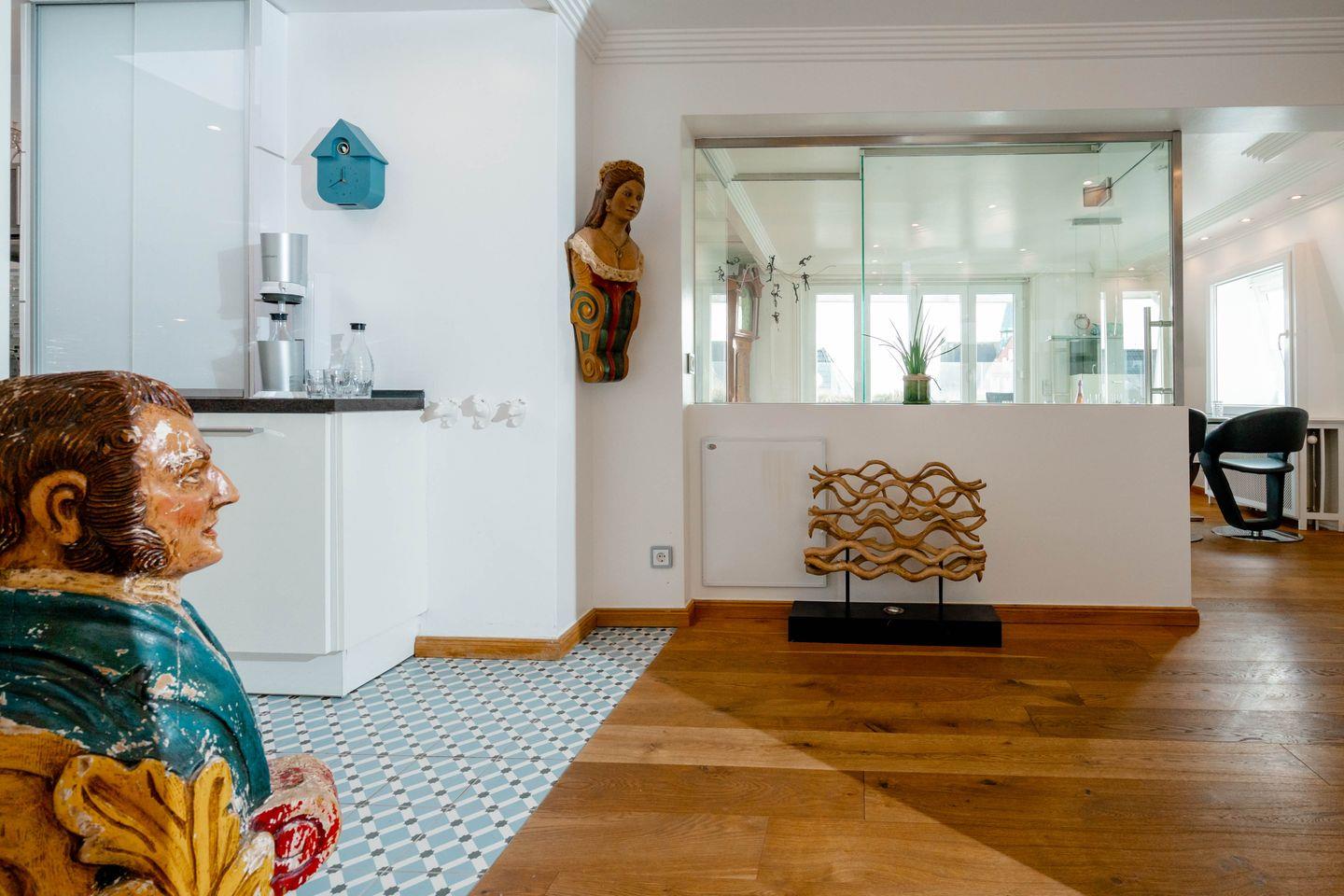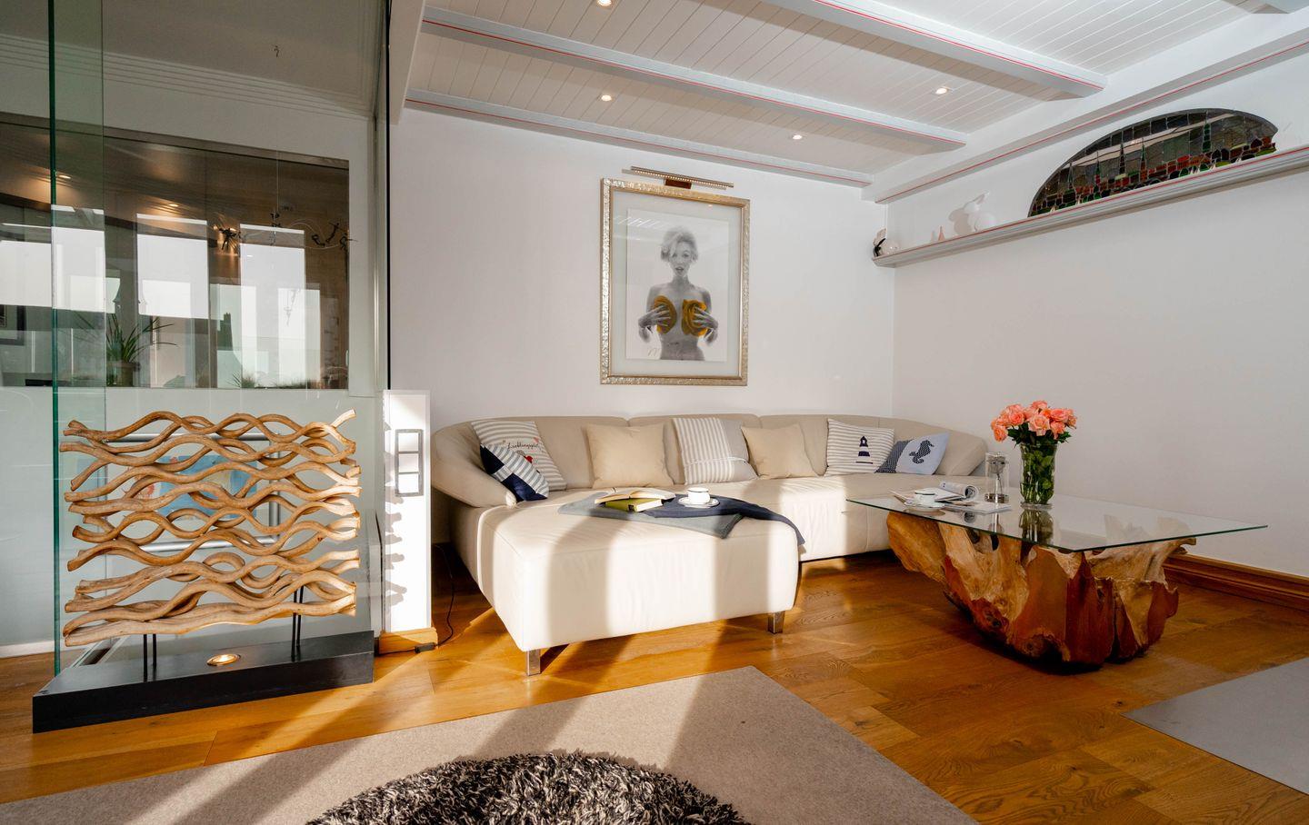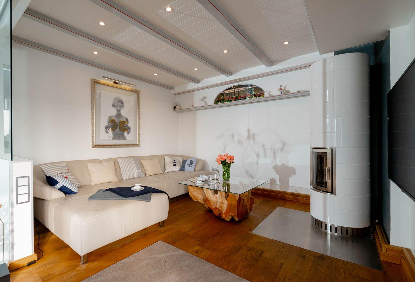 Moin, moin, dieser „Sommerwind“ ist etwas für Inselliebhaber, die das Außergewöhnliche suchen: ein 4-Zimmer-Ferienpenthouse für bis zu fünf Personen mit unglaublich vielen tollen Details. Da ist zunächst einmal die Lage: mitten in Westerland und doch etwas über den Dingen, mit kurzen Wegen zum Shopping, zu den Restaurants, Clubs und Supermärkten, zum Wochenmarkt, und wer ans Meer möchte, geht einfach nur einmal die Friedrichstraße „runter“ Richtung Westen. Drei Schlafzimmer, zwei Badezimmer, ein echter Kamin-Kachelofen und eine Dachterrasse nach Westen mit großartigem Blick über die Dächer der kleinen Inselhauptstadt sorgen für viel Flair in diesem Penthouse, das sich über zwei Ebenen zieht. Aber der Clou ist der wirklich besondere Einrichtungsstil dieses Objekts: Antiquitäten und Moderne, viel warmes Holz und strahlendes Weiß samt Glas verbinden sich mit raffinierten Einbauten und liebevoll ausgewählter Kunst zu einem attraktiven und sehr individuellen Mix. Müssen wir noch erwähnen,dass dieses Penthouse perfekt ausgestattet ist und sogar noch ein Außenparkplatz dazugehört.