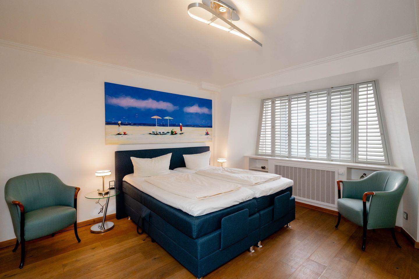 Das „Sommerwind“-Penthouse in Westerland ist ein Traum für Inselliebhaber. Mit vier Zimmern bietet es Platz für bis zu fünf Personen. Die zentrale Lage ermöglicht kurze Wege zu Shopping, Restaurants und dem Meer. Drei Schlafzimmer, zwei Badezimmer, ein Kamin-Kachelofen und eine Dachterrasse mit Westblick über die Inselhauptstadt sorgen für Flair. Der Einrichtungsstil verbindet Antiquitäten mit Moderne, warmem Holz und strahlendem Weiß. Perfekt ausgestattet inklusive Außenparkplatz.