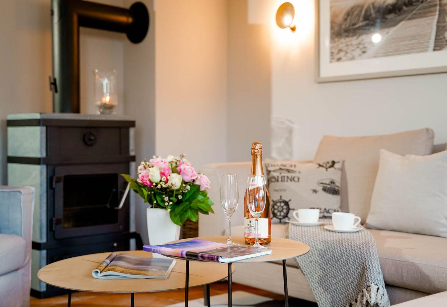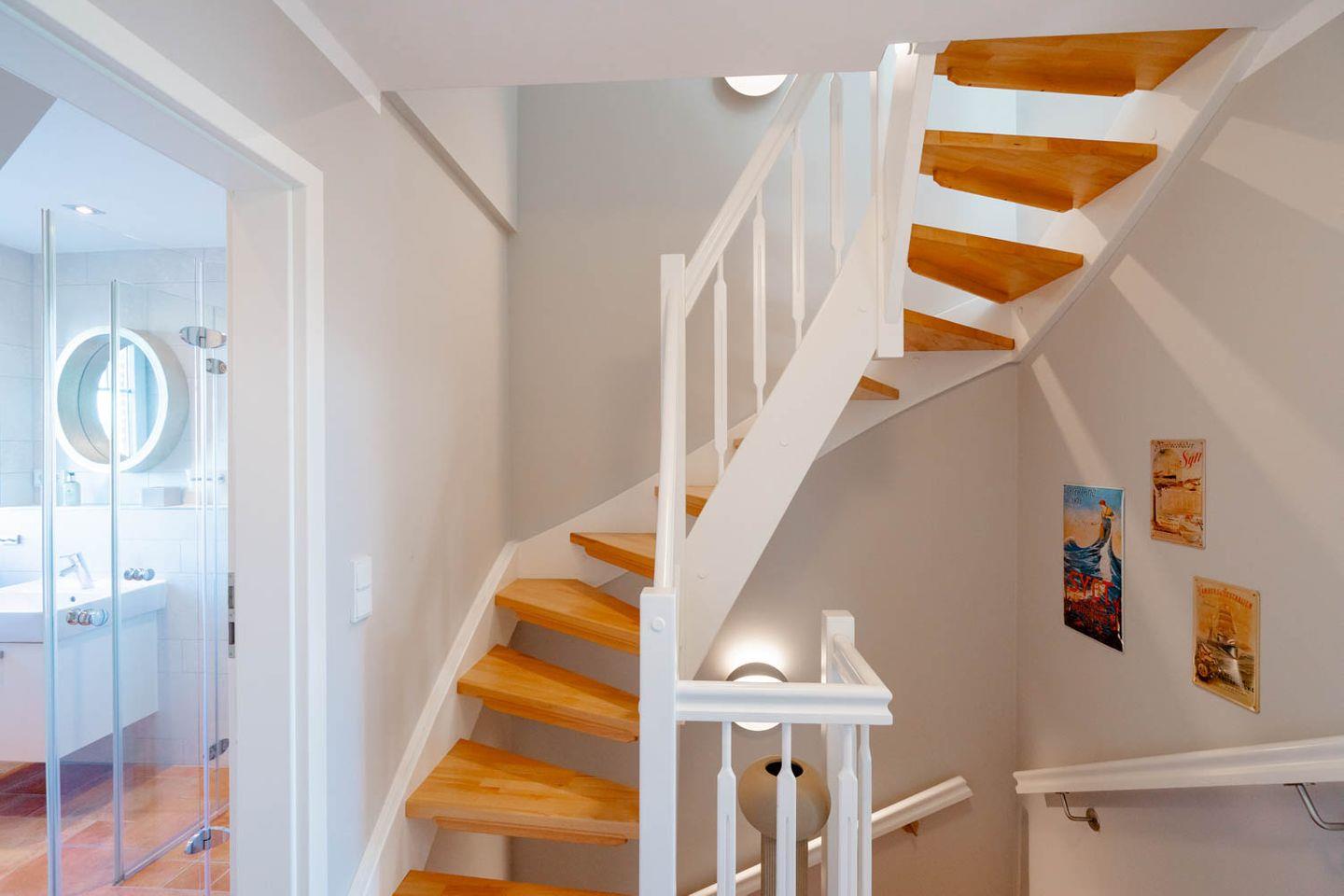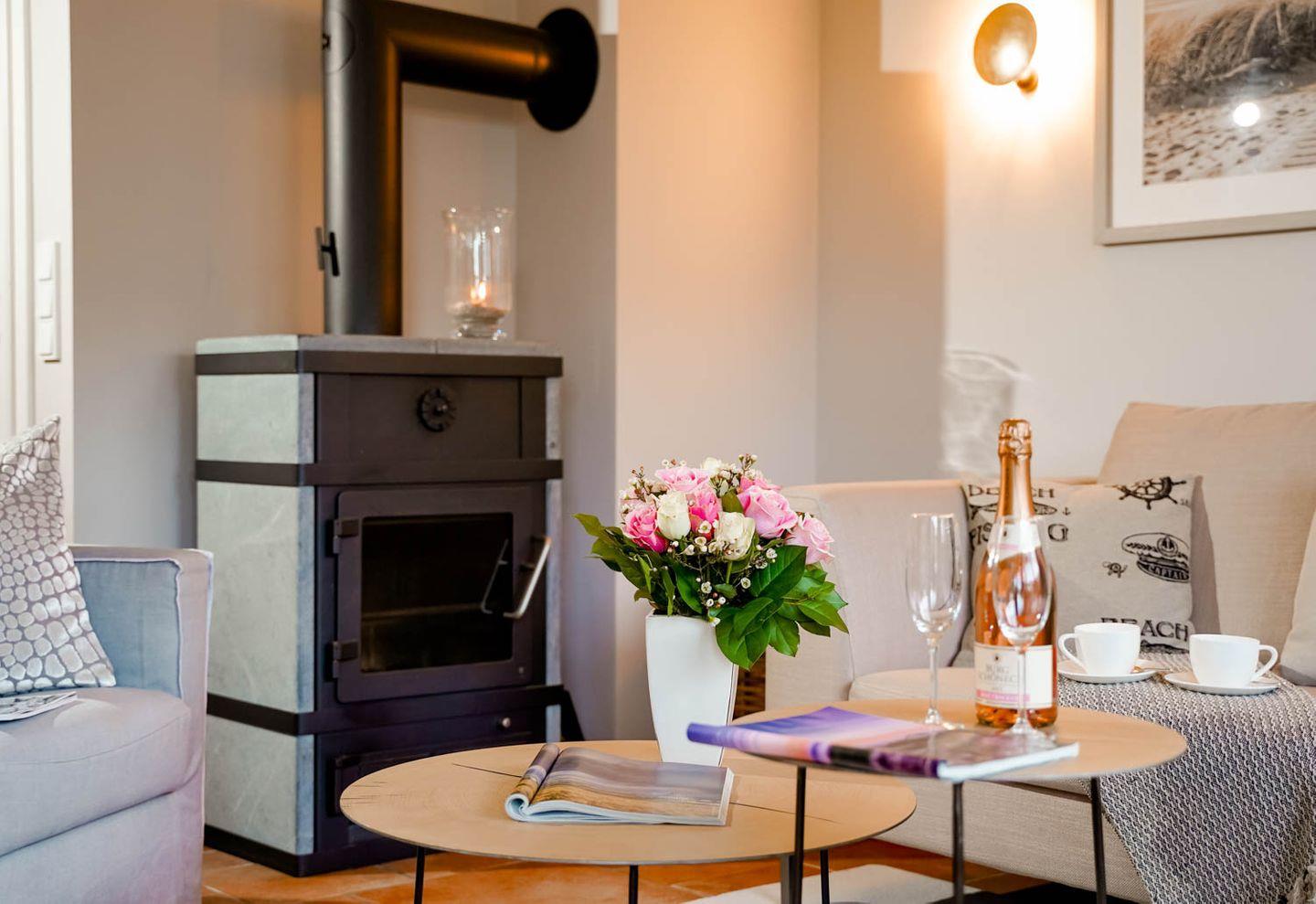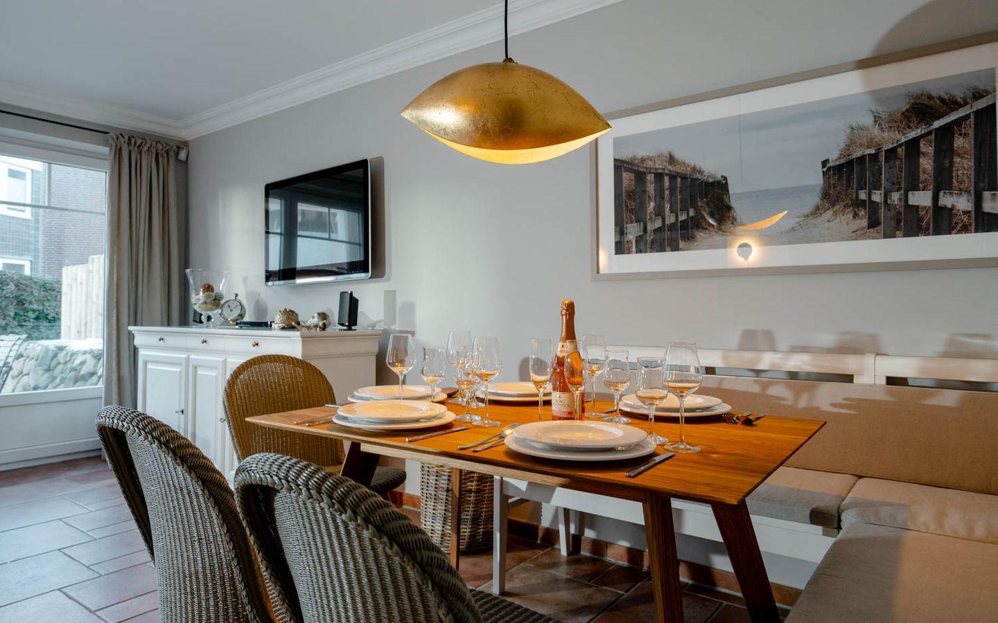 Moin und herzlich willkommen, sagt Ekke 1, diese 100 Quadratmeter große 4-Zimmer-Ferienwohnung, die sich über Erd-, Ober- und Dachgeschoss erstreckt, in einer kleinen Ferienwohnanlage im ruhigeren nördlichen Teil von Westerland liegt. Ein Gartenanteil und eine eigene Terrasse mit Möbeln und Strandkorb gehören dazu, ein hauseigener Parkplatz und ein Minibalkon im Obergeschoss, der tatsächlich Meerblick hat. Und auch die inneren Werte von „Ekke 1“ können sich sehen lassen mit zwei Bädern, eines davon inklusive Waschmaschine/Trockner, und drei Schlafzimmern mit zwei Doppel- und zwei Einzelbetten sowie einem Kinderbett. Das im Landhausstil eingerichtete Wohnzimmer hat sogar einen der typischen nordischen Kaminöfen und eine Fußbodenheizung, die Einrichtung ist sommerlich licht und freundlich. Dass die edle Küche mit Mikrowelle, Cerankochfeld, Cappuccino-Maschine und Backofen voll ausgestattet ist, passt zum perfekten Stil des Hauses. Die Lage der Wohnung ist ruhig und trotzdem strandnah, zu Fuß braucht man von hier aus nur gute fünf Minuten bis an den Strand, bis zur Innenstadt sind‘s höchstens zehn, ein Bäcker findet sich ganz in der Nähe.