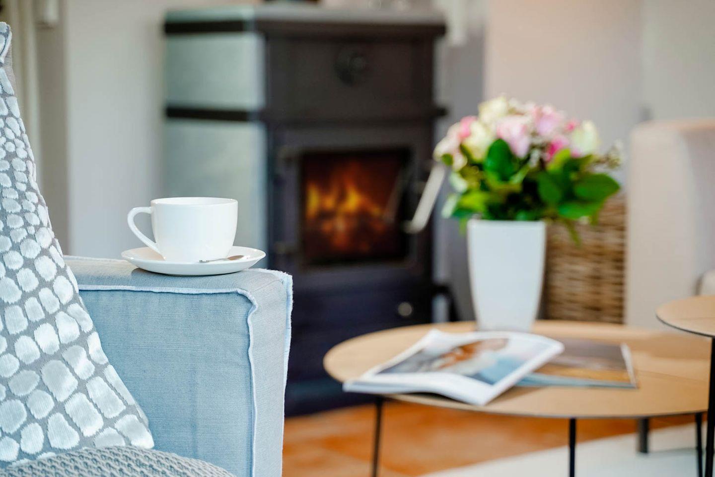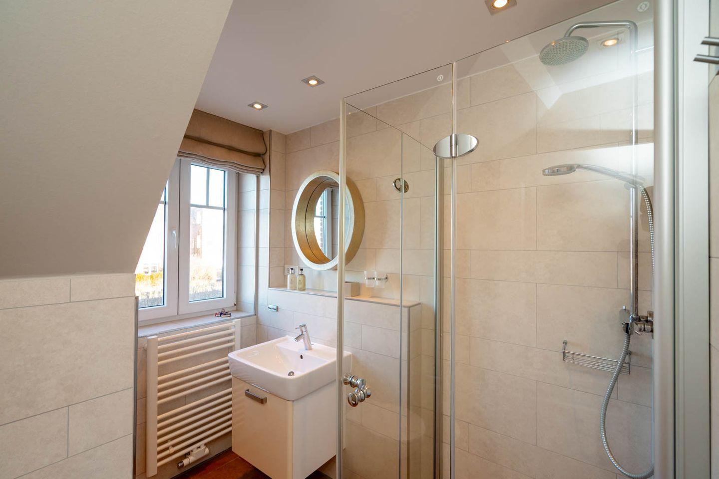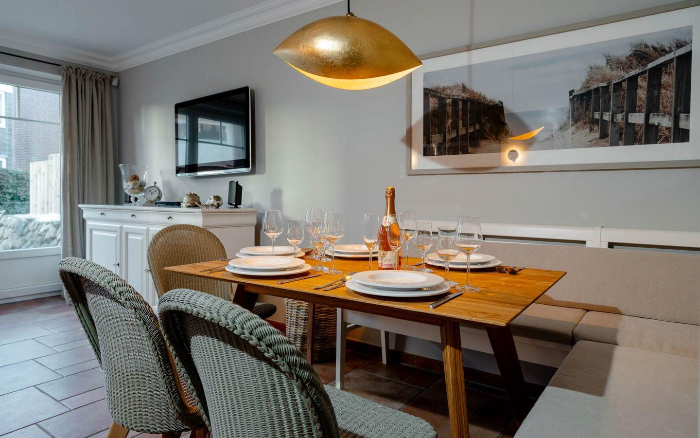 Moin und herzlich willkommen, sagt Ekke 1, diese 100 Quadratmeter große 4-Zimmer-Ferienwohnung, die sich über Erd-, Ober- und Dachgeschoss erstreckt, in einer kleinen Ferienwohnanlage im ruhigeren nördlichen Teil von Westerland liegt. Ein Gartenanteil und eine eigene Terrasse mit Möbeln und Strandkorb gehören dazu, ein hauseigener Parkplatz und ein Minibalkon im Obergeschoss, der tatsächlich Meerblick hat. Und auch die inneren Werte von „Ekke 1“ können sich sehen lassen mit zwei Bädern, eines davon inklusive Waschmaschine/Trockner, und drei Schlafzimmern mit zwei Doppel- und zwei Einzelbetten sowie einem Kinderbett. Das im Landhausstil eingerichtete Wohnzimmer hat sogar einen der typischen nordischen Kaminöfen und eine Fußbodenheizung, die Einrichtung ist sommerlich licht und freundlich. Dass die edle Küche mit Mikrowelle, Cerankochfeld, Cappuccino-Maschine und Backofen voll ausgestattet ist, passt zum perfekten Stil des Hauses. Die Lage der Wohnung ist ruhig und trotzdem strandnah, zu Fuß braucht man von hier aus nur gute fünf Minuten bis an den Strand, bis zur Innenstadt sind‘s höchstens zehn, ein Bäcker findet sich ganz in der Nähe.