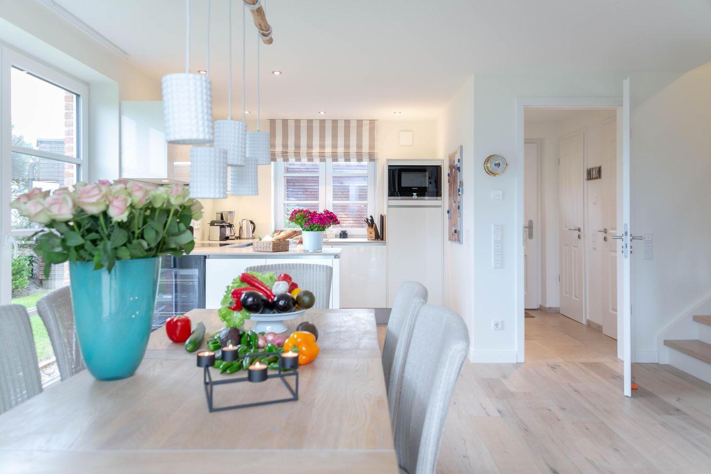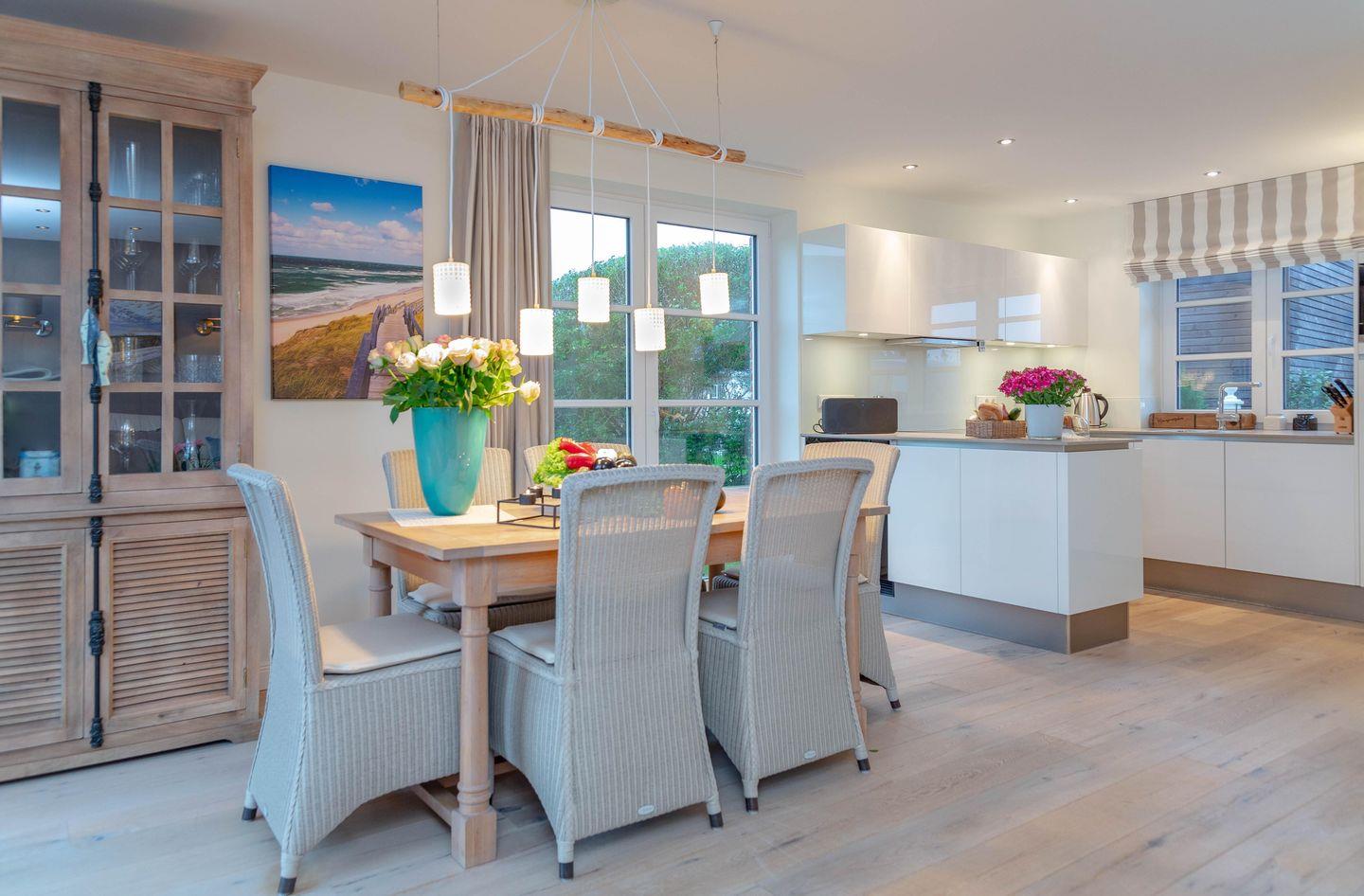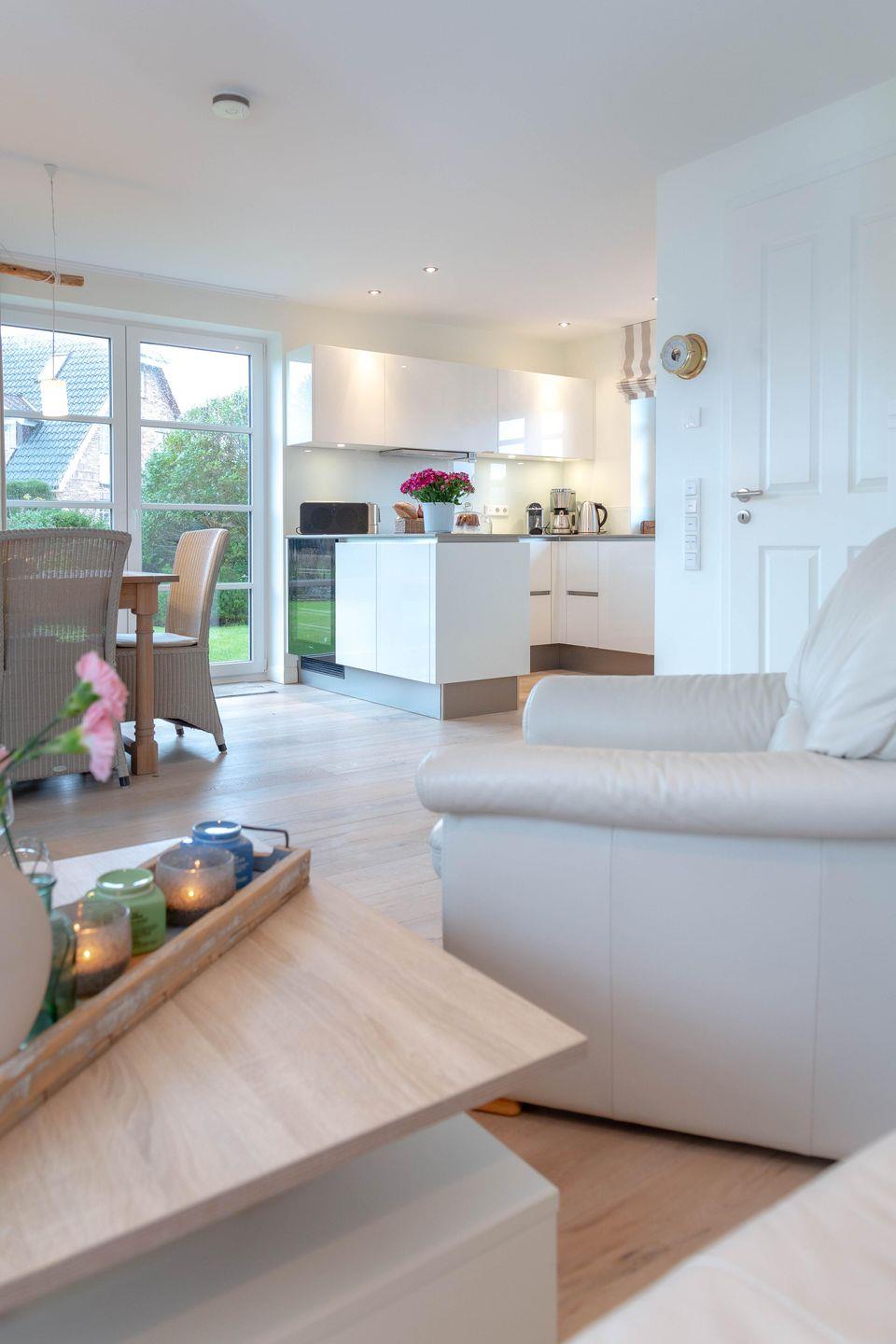 Erleben Sie ein stilvolles Ambiente im modernen Landhausstil, harmonisch ergänzt durch maritime Akzente – eine perfekte Wohlfühloase für Ihren Urlaub. Die großzügigen, lichtdurchfluteten Wohn- und Schlafbereiche laden selbst an Regentagen zum Entspannen ein und bieten viel Platz für gesellige Stunden mit Familie und Freunden.