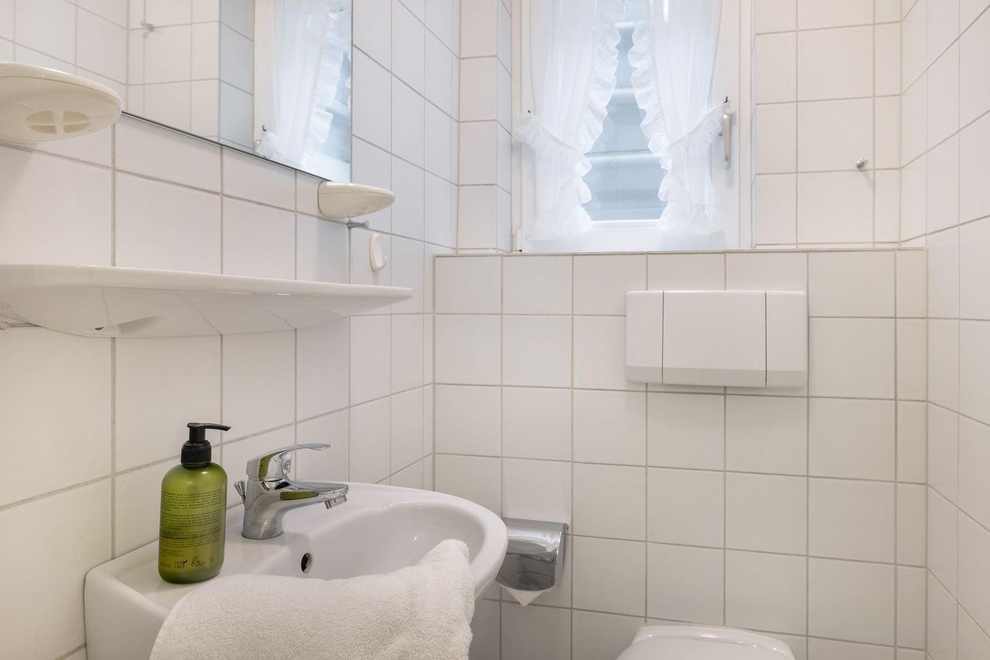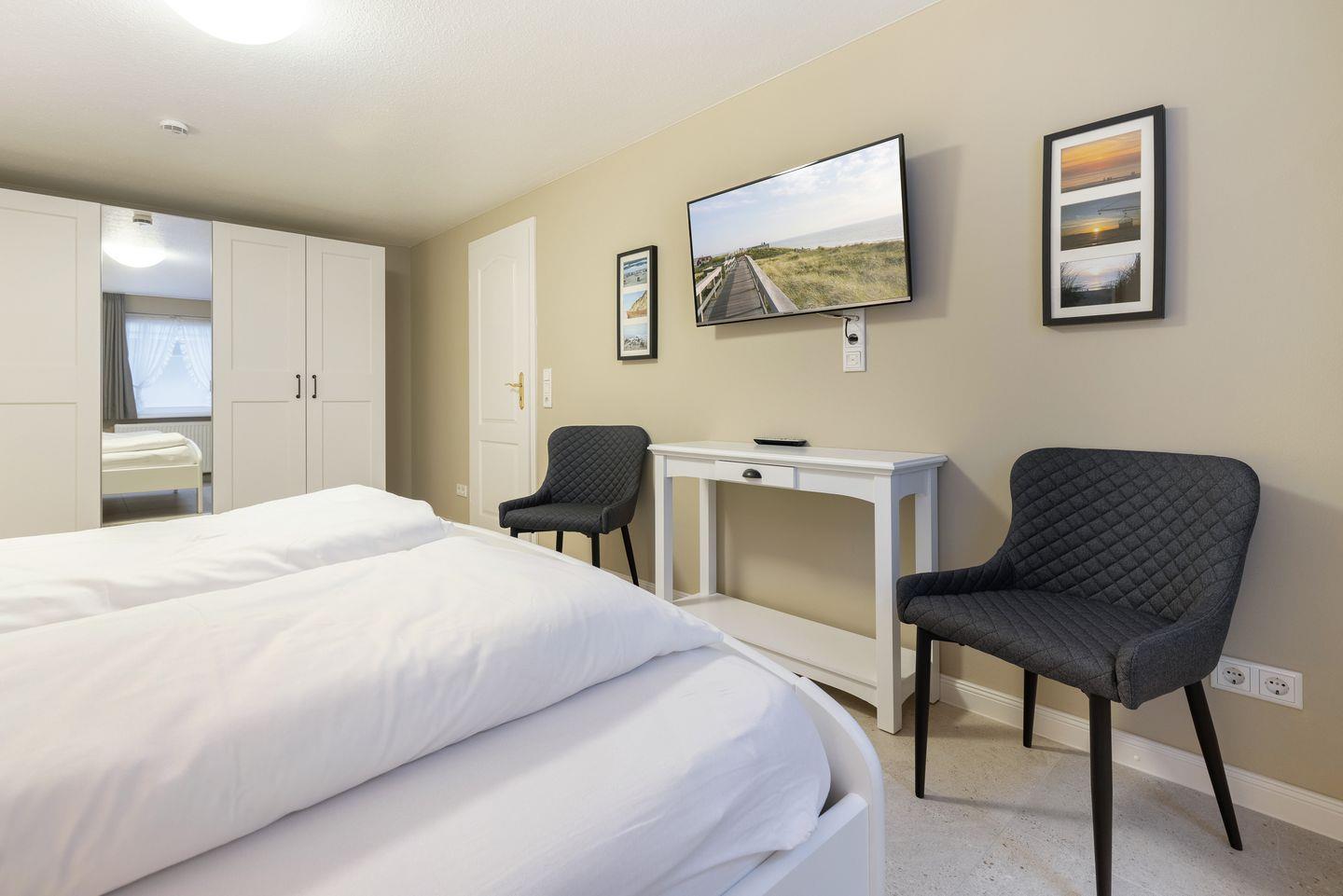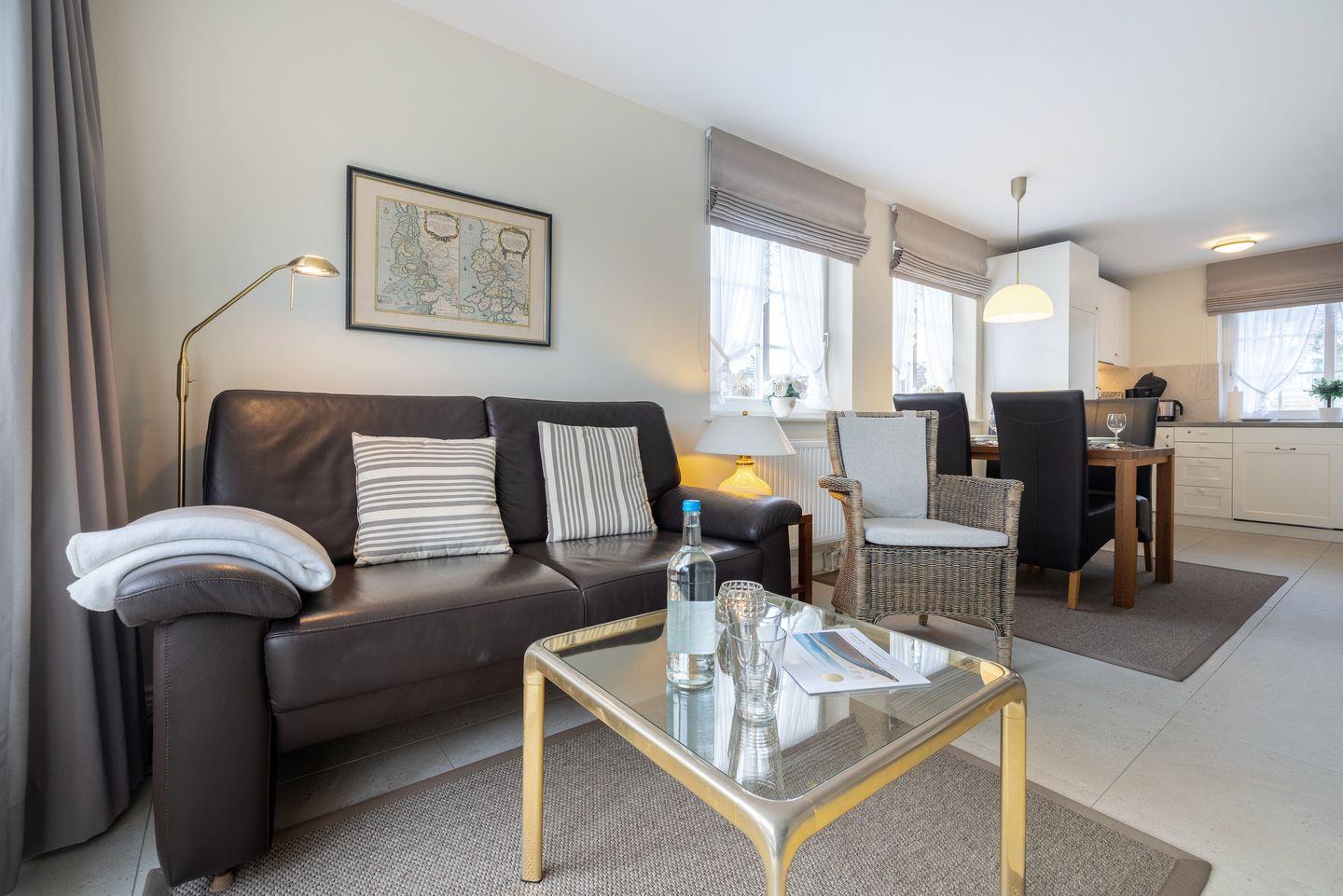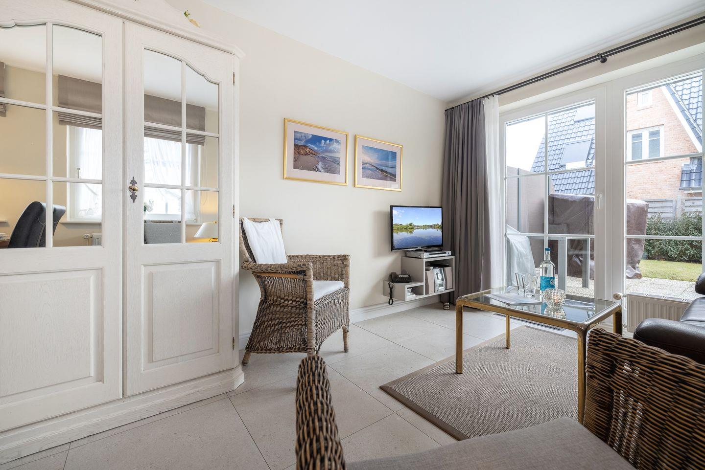 Der Wohnraum des Appartements 3 empfängt Sie mit viel Tageslicht durch die bodentiefen Terrassentüren, die hinaus in den schönen Gärten führen. Durch die Süd-Ausrichtung können Sie auf Ihrer möblierten Terrasse bis in die Abendstunden die Sonne genießen. Der Wohnbereich verfügt außerdem über einen Esstisch für vier Personen sowie über eine offene Küche, die voll ausgestattet ist. Im Souterrain der Wohnung erwartet Sie ein weiterer Raum mit Doppelbett und Flatscreen-TV sowie ein weiterer Raum mit zwei Einzelbetten und viel Schrankplatz. Auf gleicher Ebene finden Sie ein Badezimmer mit Dusche und WC sowie ein kleines Gäste-WC.