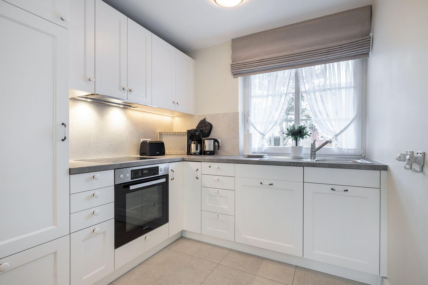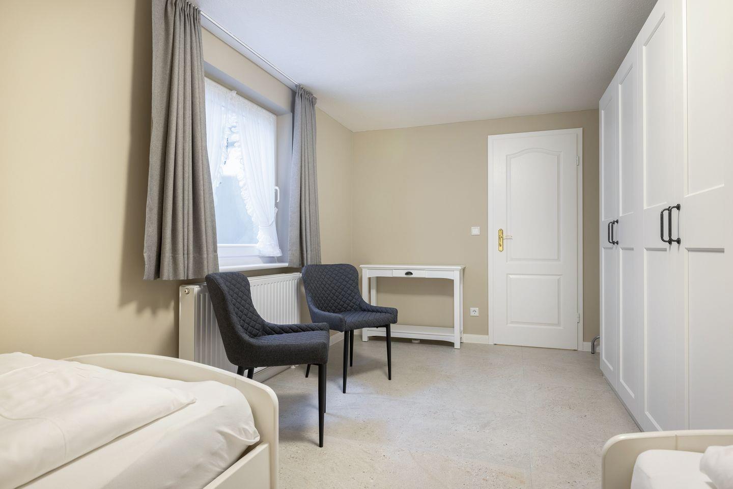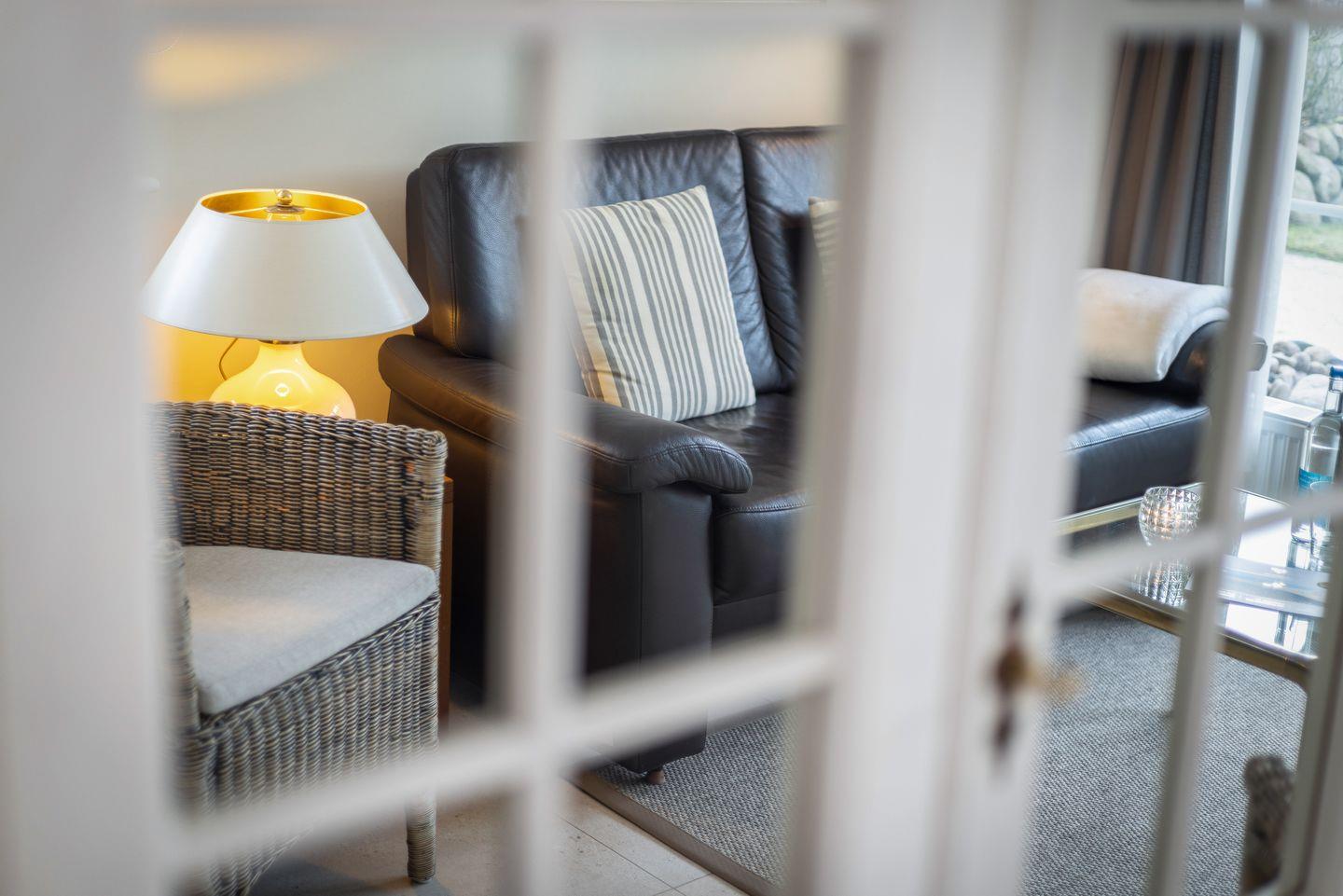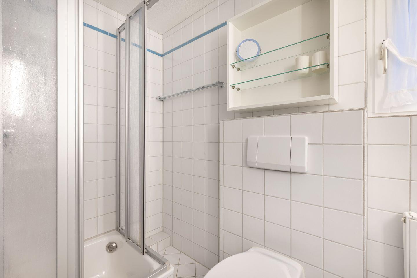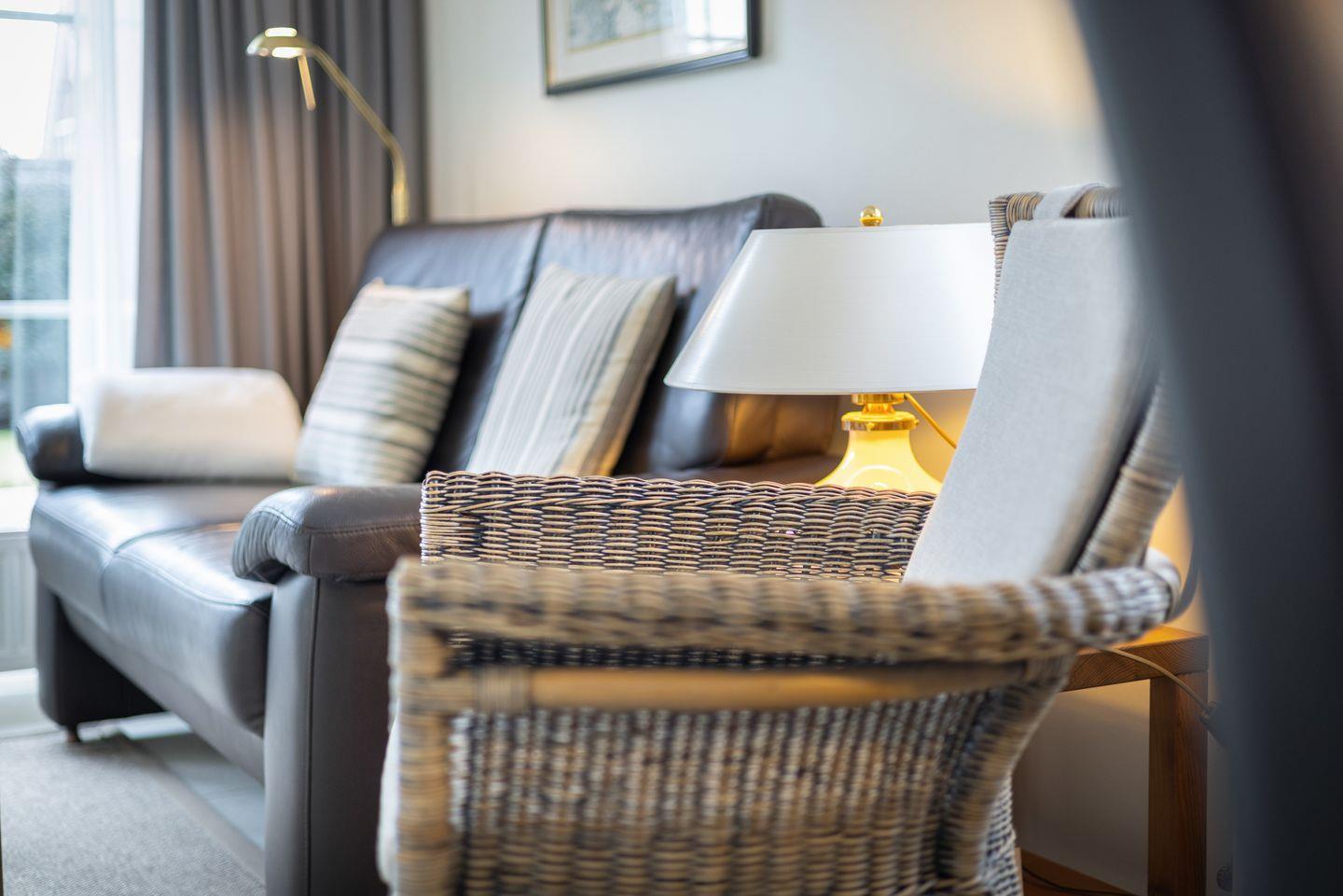Der Wohnraum des Appartements 3 empfängt Sie mit viel Tageslicht durch die bodentiefen Terrassentüren, die hinaus in den schönen Gärten führen. Durch die Süd-Ausrichtung können Sie auf Ihrer möblierten Terrasse bis in die Abendstunden die Sonne genießen. Der Wohnbereich verfügt außerdem über einen Esstisch für vier Personen sowie über eine offene Küche, die voll ausgestattet ist. Im Souterrain der Wohnung erwartet Sie ein weiterer Raum mit Doppelbett und Flatscreen-TV sowie ein weiterer Raum mit zwei Einzelbetten und viel Schrankplatz. Auf gleicher Ebene finden Sie ein Badezimmer mit Dusche und WC sowie ein kleines Gäste-WC.