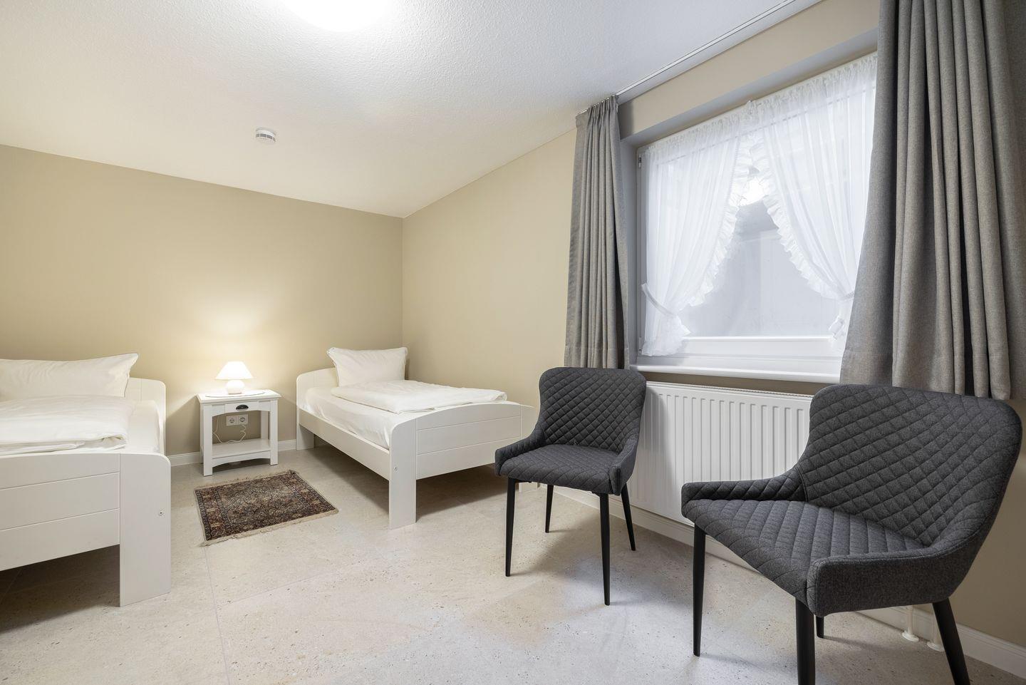 UG: 1 Raum mit Doppelbett (90x200cm) und Flatscreen-TV, ein weiterer Raum mit zwei Einzelbetten (90x200cm), Gäste-WC, Badezimmer mit Dusche und WC