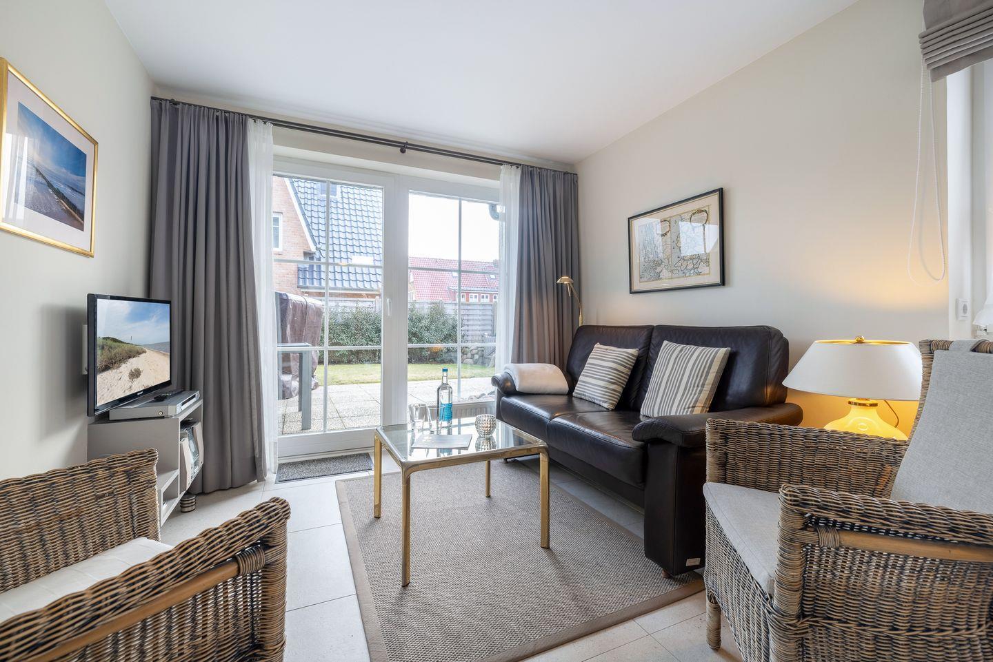 EG: Wohnraum mit Flatscreen-TV, DVD-Player, Hifi-Anlage, Telefonflatrate ins deutsche Festnetz und Radio, integrierte Küche im Friesenstil mit Geschirrspülmaschine, Backofen und Kaffeemaschine, Süd-Terrasse mit Strandkorb (möbliert ca. April bis Oktober)