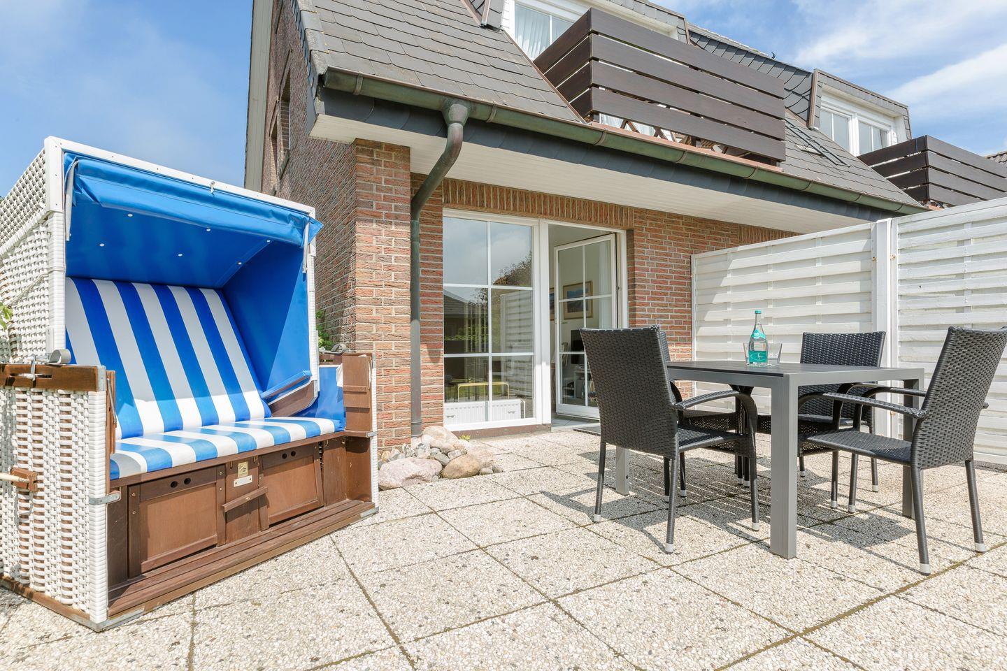 Gemütliches Apartment Rosenkamp auf Sylt mit Terrasse, Gartenmöbeln und moderner Ausstattung für erholsame Urlaubstage.