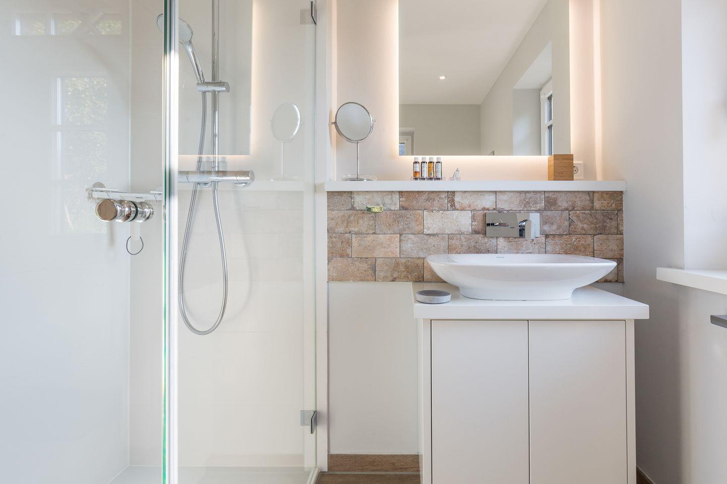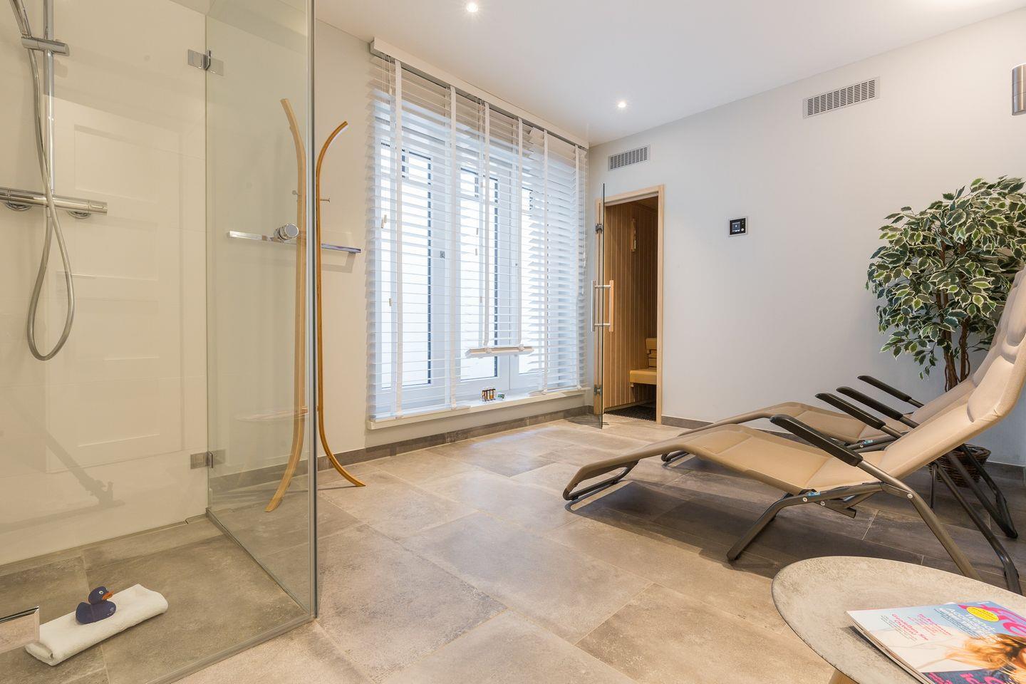 Als besonderes Highlight empfängt Sie in Ihrem "Wohnen und Mee(h)r im Souterrainbereich eine kleine Wellnessoase. Hier stehen Ihnen sowie Ihrem Domizilnachbarn im Obergeschoss (dieses Domizil ist also auch optimal für einen Urlaub zusammen mit einer befreundeten Familie oder Paar) eine wirklich großzügige Sauna und Duschbereich sowie eine kleine Waschküche zur Verfügung.