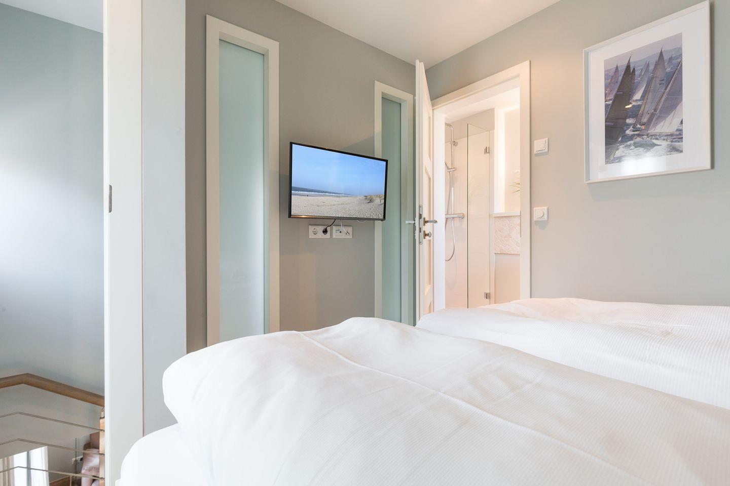 Über Ihre Design-Treppe "wandeln" Sie in den Obergeschossbereich, der nicht minder besonders gestaltet wurde. Hier steht Ihnen ebenfalls eine Räumlichkeit mit Doppelbett (160x200cm) sowie ein Wohlfühlbad mit Dusche zur Verfügung.