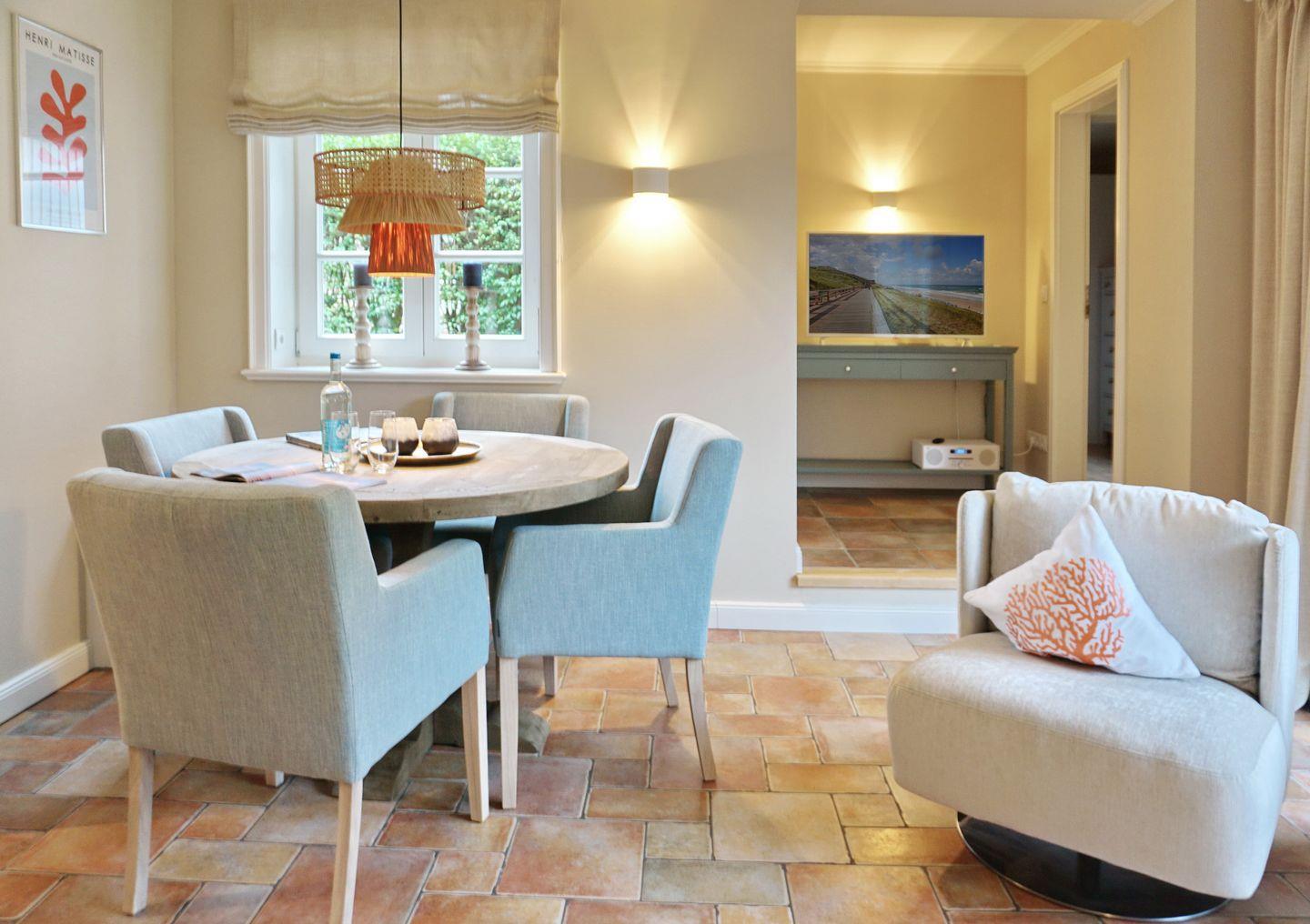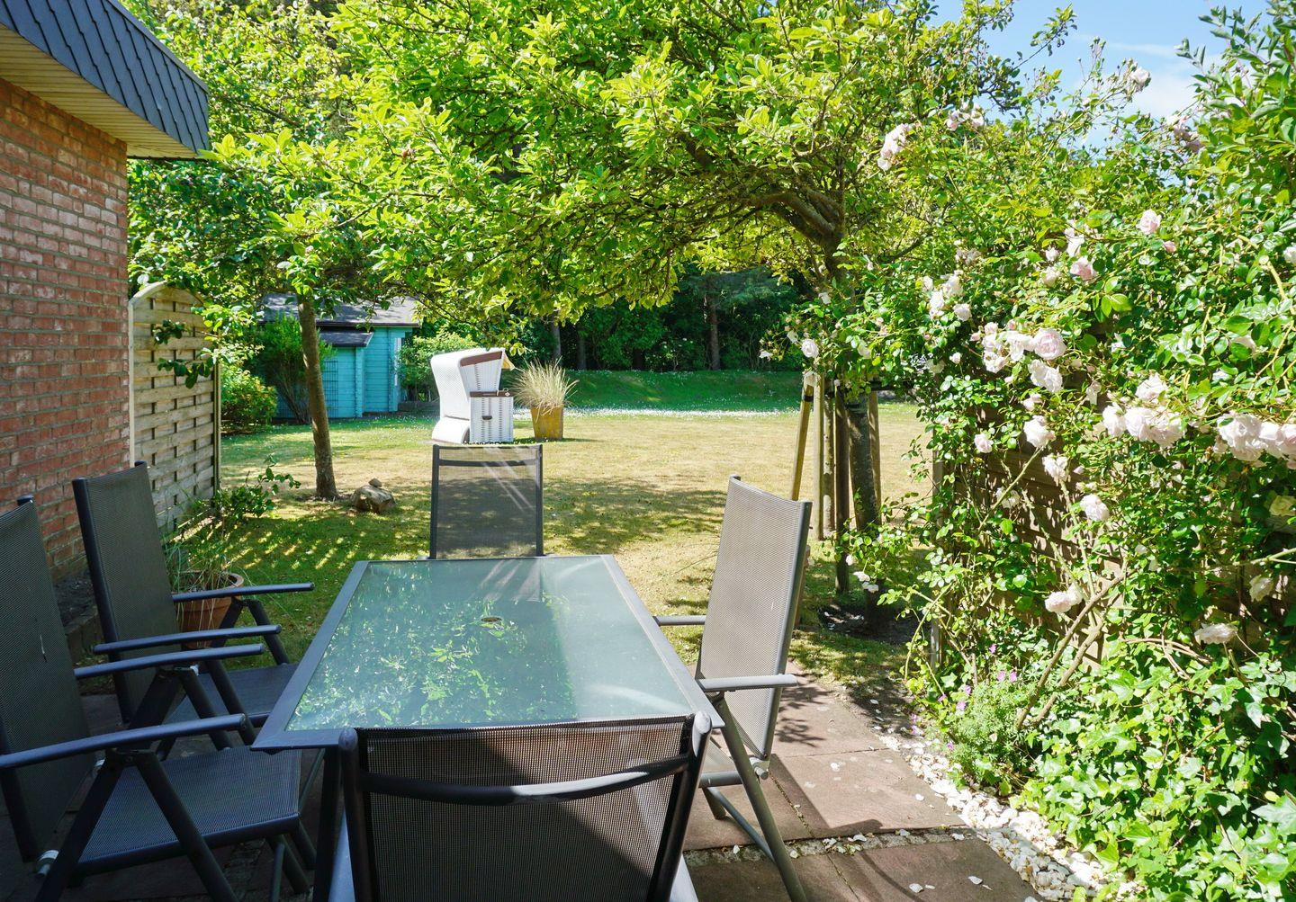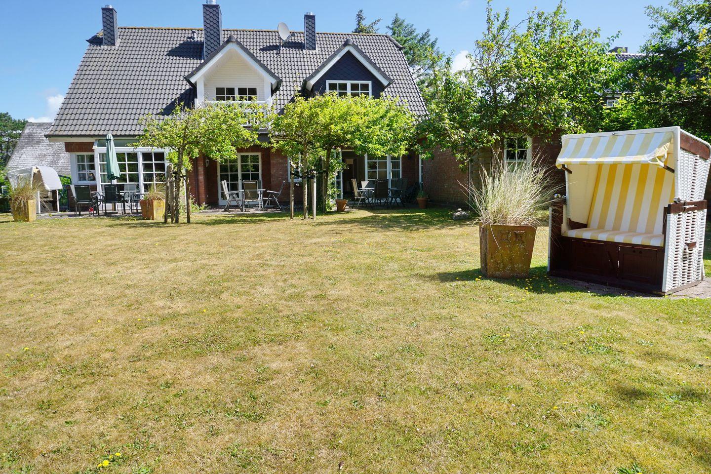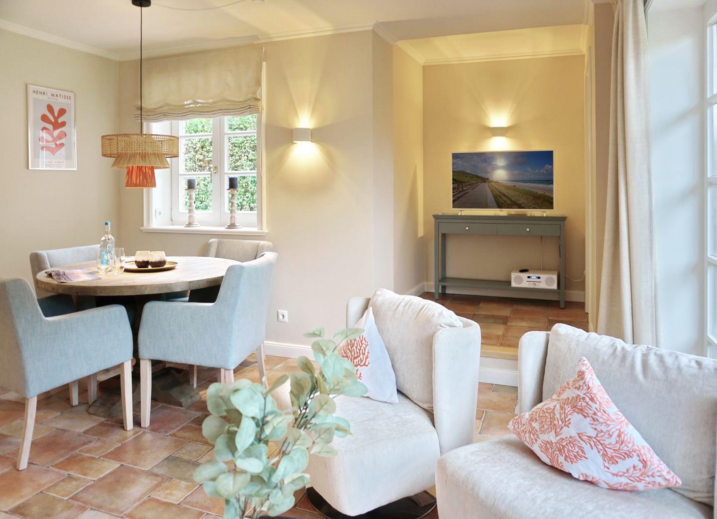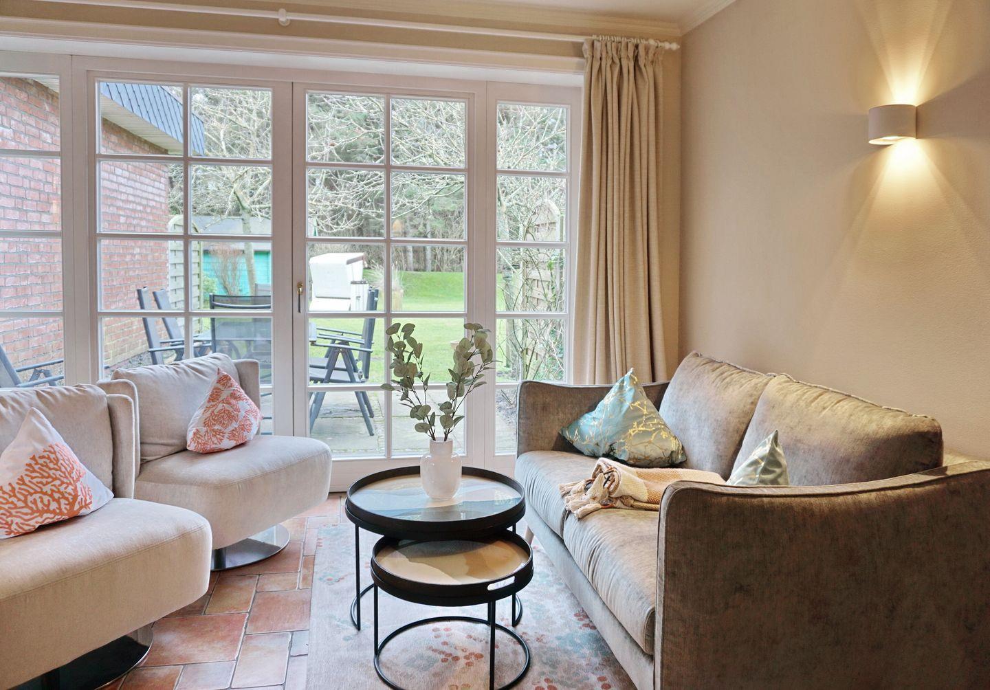 Stilvolle 3-Zimmer-Wohnung auf Sylt mit Terrasse, Kamin und Gartenblick für erholsamen Urlaub an der Nordsee.