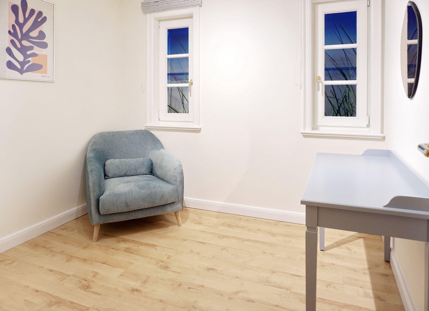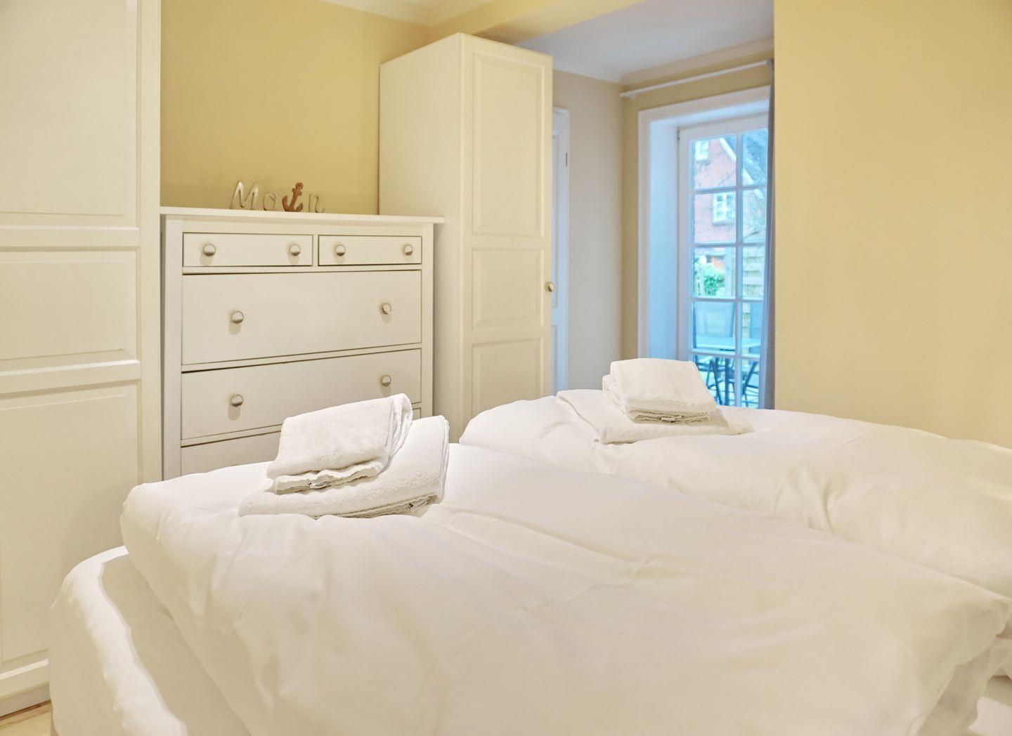 EG: Wohnraum mit Flatscreen-TV, Bluetooth-Radio, CD-Player, W-Lan und Kamin. Küche mit Essbereich (u.a. mit Backofen, Mikrowelle, Geschirrspülmaschine, 1x Nespresso-Kapselmaschine, 1x Filtermaschine, Toaster, Wasserkocher, sowie Kühlschrank mit kl. Gefrierfach.) Ein Gäste WC, sowie Dusche/WC mit Fön und Schminkspiegel. Ein Schlafzimmer mit Doppelbett (1,80x2,00m). Terrasse mit Alu-Terrassenmöbeln, sowie ein Gemeinschaftsgarten mit Strandkorb.