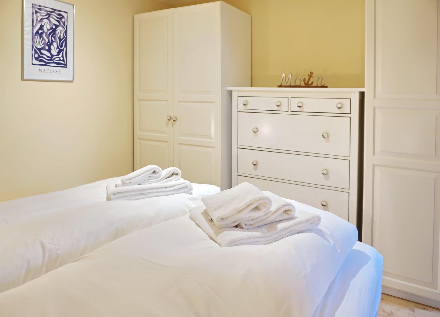 UG: ein Schlafraum mit Flatscreen-TV, mit Doppelbett (1,80x2,00m), einem Ankleidezimmer, sowie ein Bad mit Duschwanne/WC. (Fön und Schminkspiegel)
