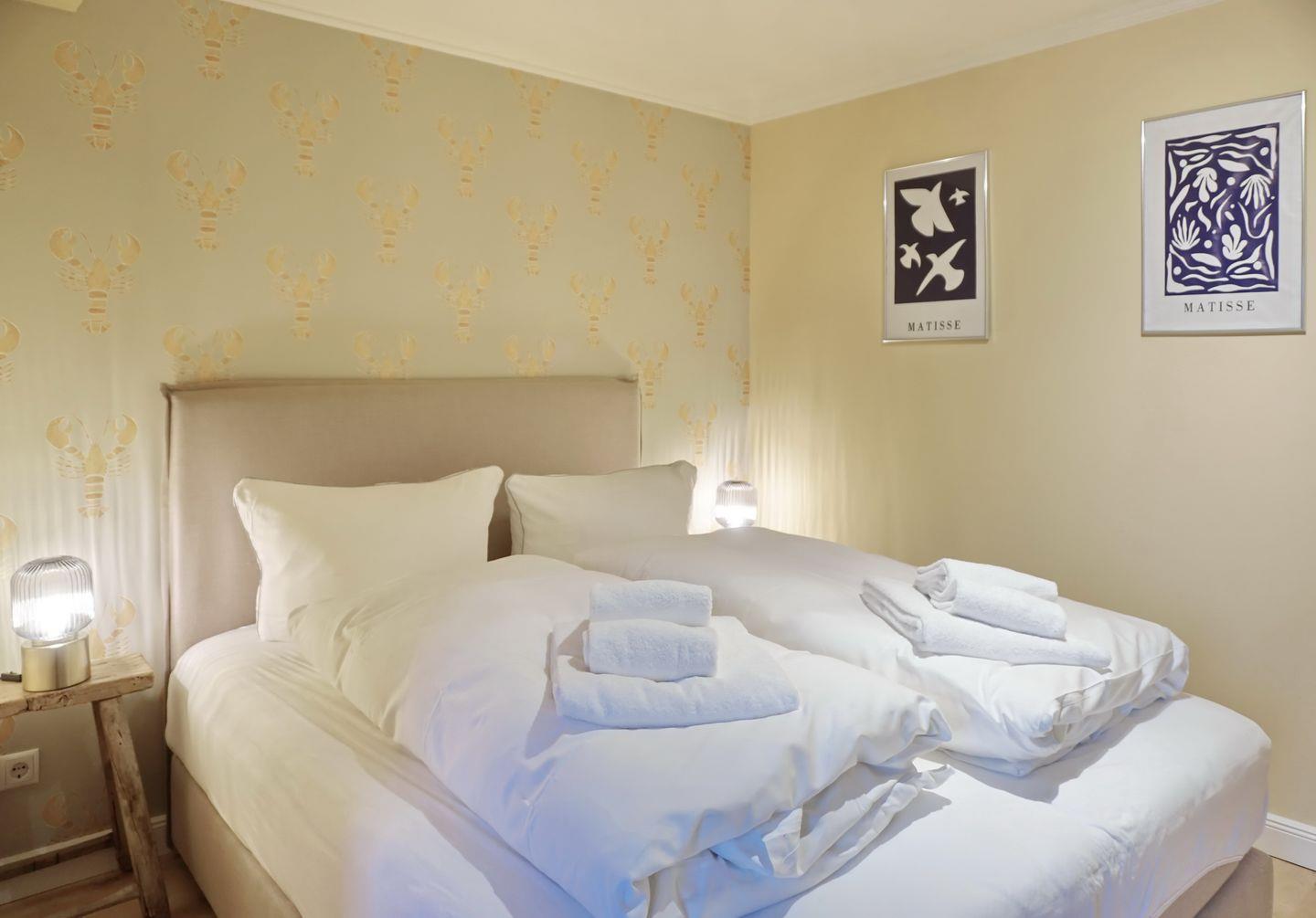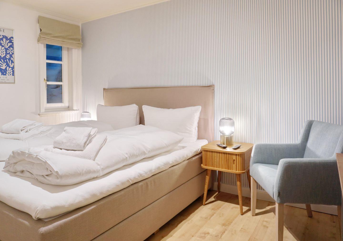 Ebenerdig befindet sich hier ein Schlafzimmer mit komfortablen Boxspringbett (1,80x2,00m), sowie eine Dusche mit WC. Die sichtbare Sauna ist bis auf weiteres nicht nutzbar.