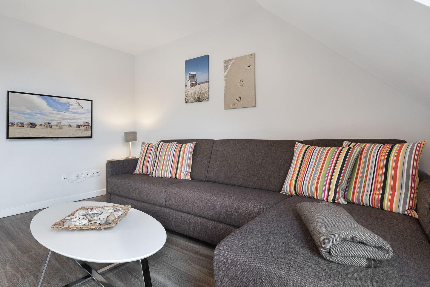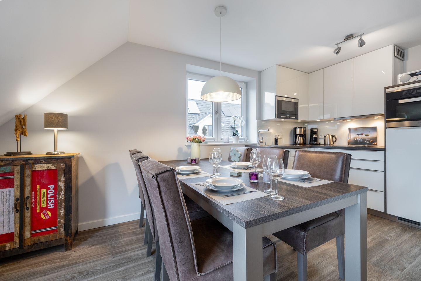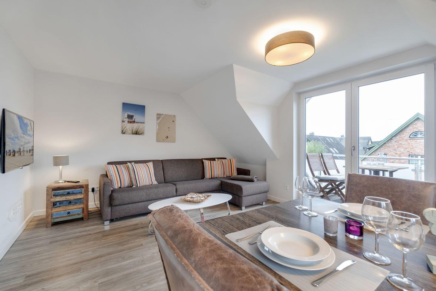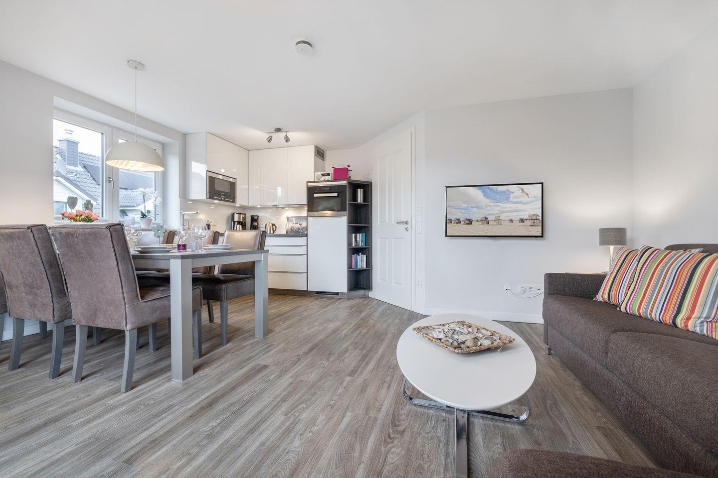 Im Wohnraum des Appartements finden Sie eine gemütliche Sofaecke und einen Essbereich. Von hier aus erreichen Sie außerdem Ihren möblierten Balkon, auf dem Sie die Nordseeluft genießen können. Die Küchenzeile verfügt über einen Induktionsherd und Backofen sowie eine Geschirrspülmaschine, sodass Sie sich hier problemlos ein leckeres Urlaubsessen zubereiten können. Auf gleicher Ebene des Appartements finden Sie ein Schlafzimmer mit Doppelbett und Flatscreen-TV sowie ein Tageslichtbad mit Dusche und Waschmaschine.
