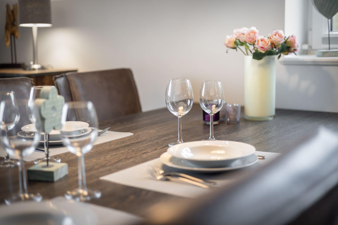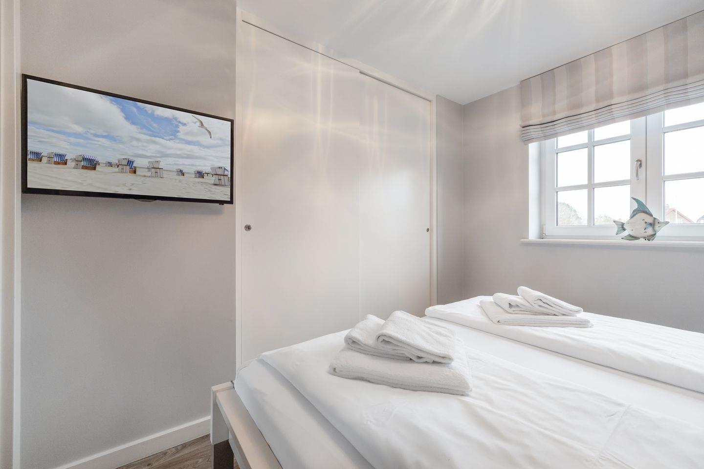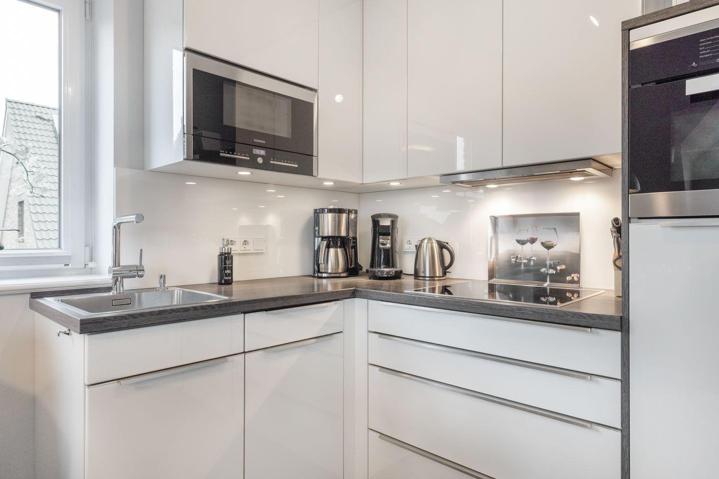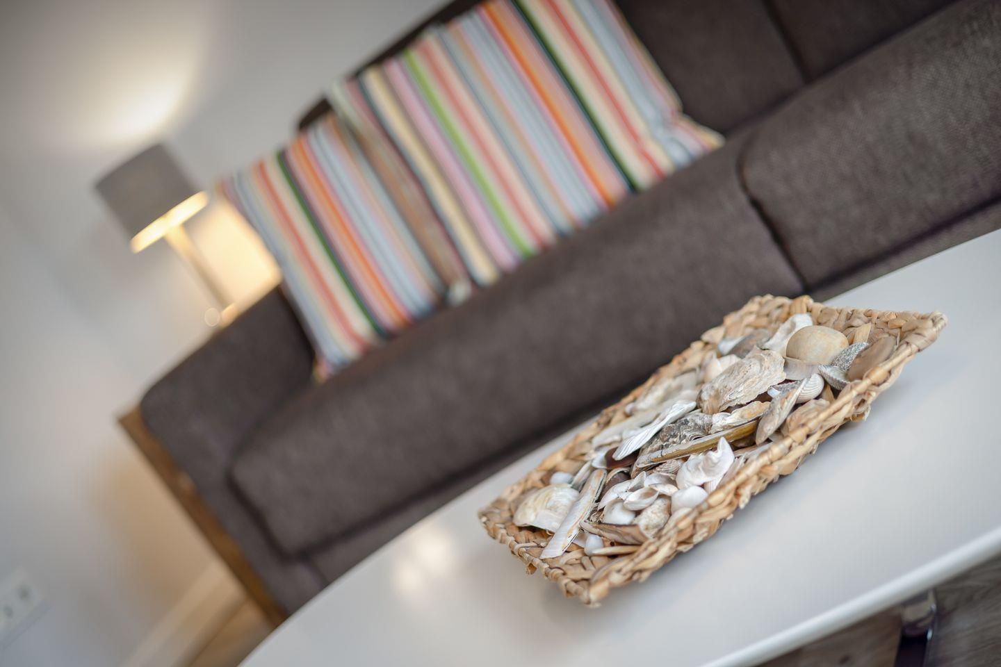 Im Wohnraum des Appartements finden Sie eine gemütliche Sofaecke und einen Essbereich. Von hier aus erreichen Sie außerdem Ihren möblierten Balkon, auf dem Sie die Nordseeluft genießen können. Die Küchenzeile verfügt über einen Induktionsherd und Backofen sowie eine Geschirrspülmaschine, sodass Sie sich hier problemlos ein leckeres Urlaubsessen zubereiten können. Auf gleicher Ebene des Appartements finden Sie ein Schlafzimmer mit Doppelbett und Flatscreen-TV sowie ein Tageslichtbad mit Dusche und Waschmaschine.