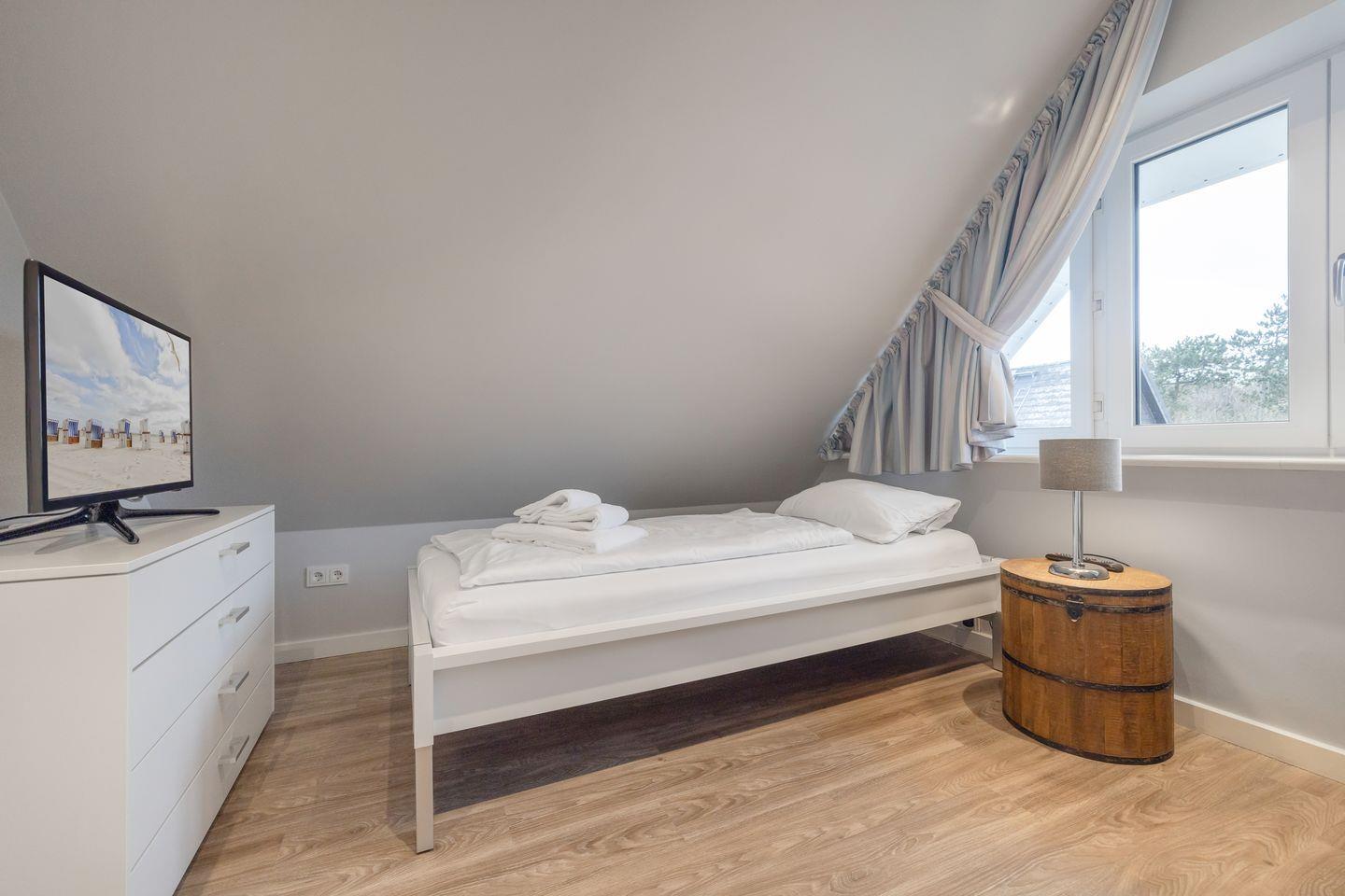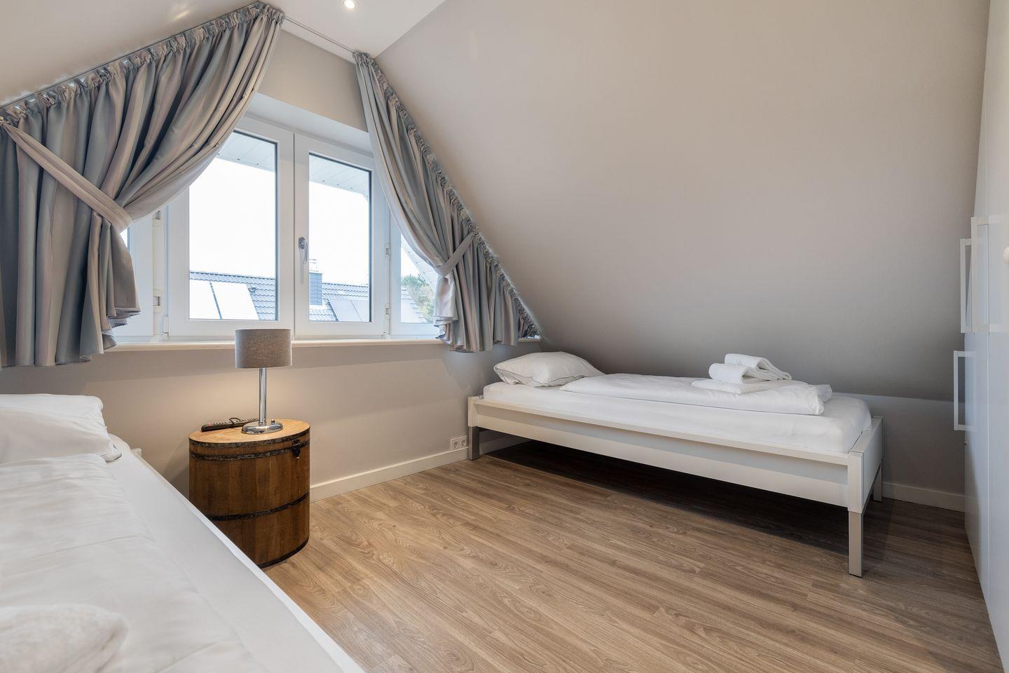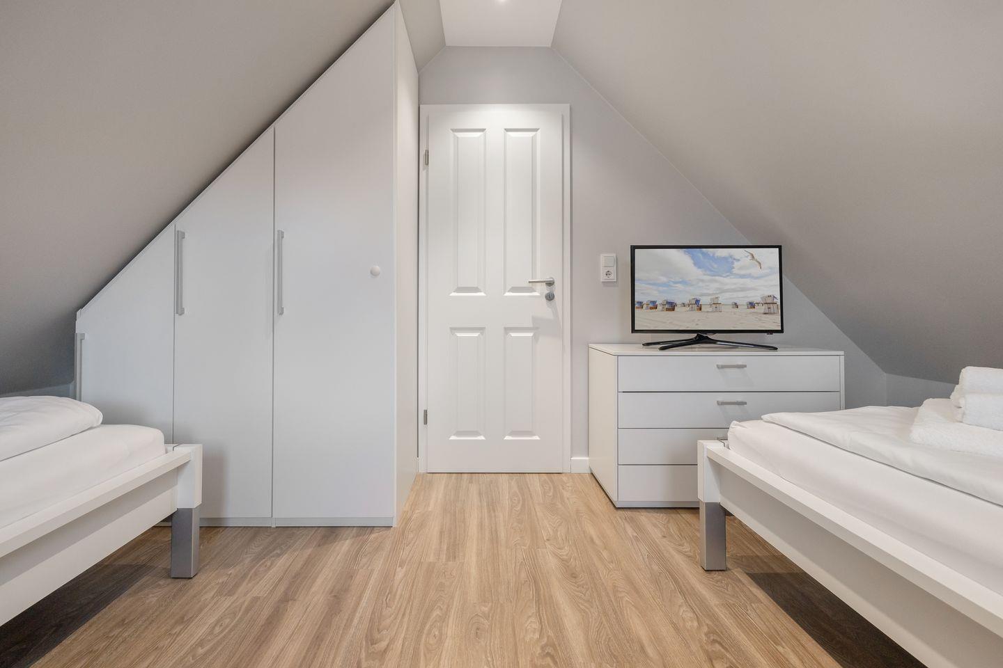 Im Dachgeschoss des Hauses erwartet Sie ein weiterer Raum mit zwei Einzelbetten und Flatscreen-TV. Auch auf dieser Ebene finden Sie ein weiteres Badezimmer mit Dusche und WC. Auch an unsere kleinen Gäste wurde hier gedacht - an jeder Treppe wurden Treppensicherungen installiert. Ein Kinderbett und einen Hochstuhl finden Sie ebenfalls schon direkt im Domizil.