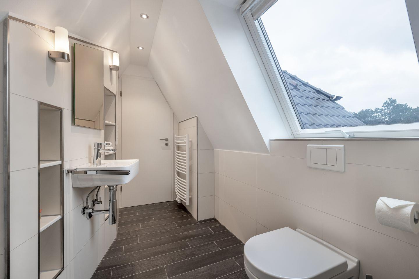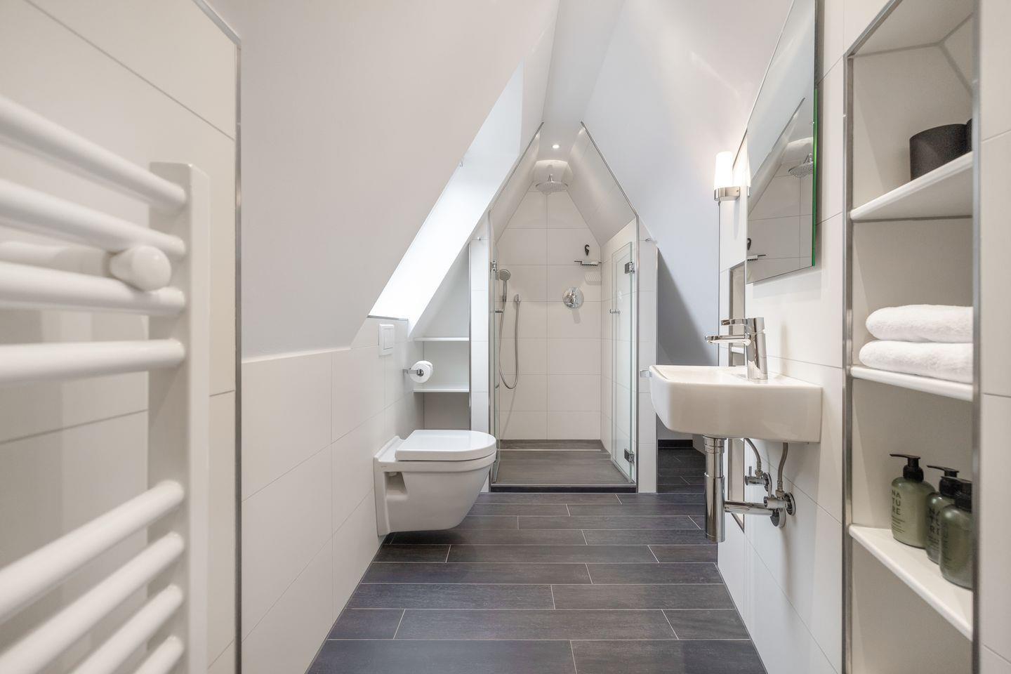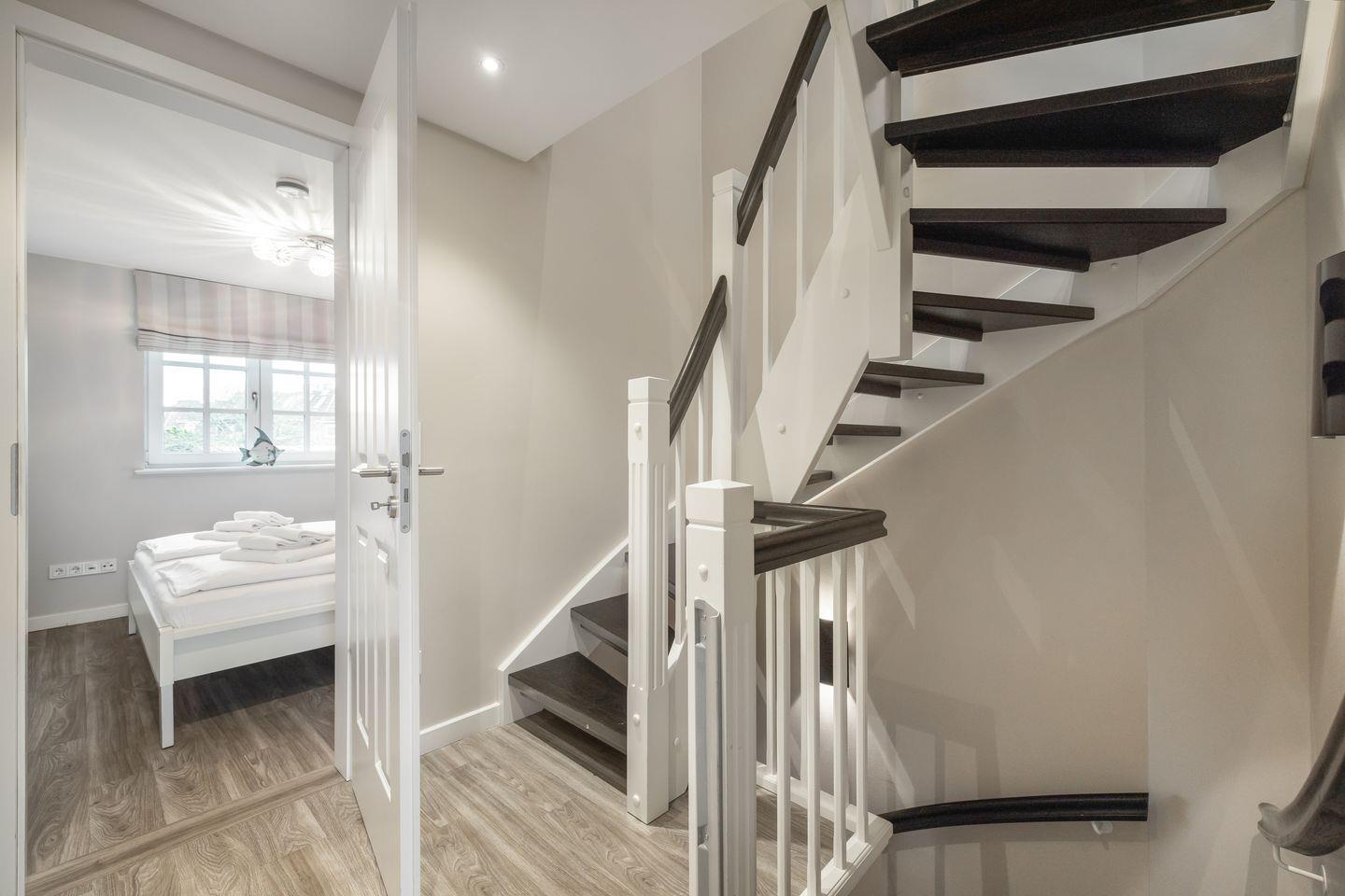 Im Dachgeschoss des Hauses erwartet Sie ein weiterer Raum mit zwei Einzelbetten und Flatscreen-TV. Auch auf dieser Ebene finden Sie ein weiteres Badezimmer mit Dusche und WC. Auch an unsere kleinen Gäste wurde hier gedacht - an jeder Treppe wurden Treppensicherungen installiert. Ein Kinderbett und einen Hochstuhl finden Sie ebenfalls schon direkt im Domizil.
