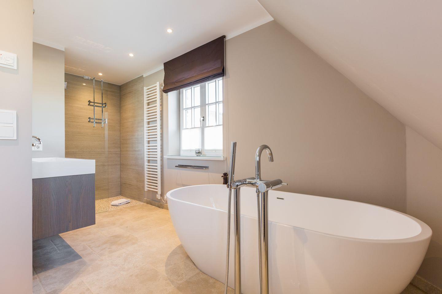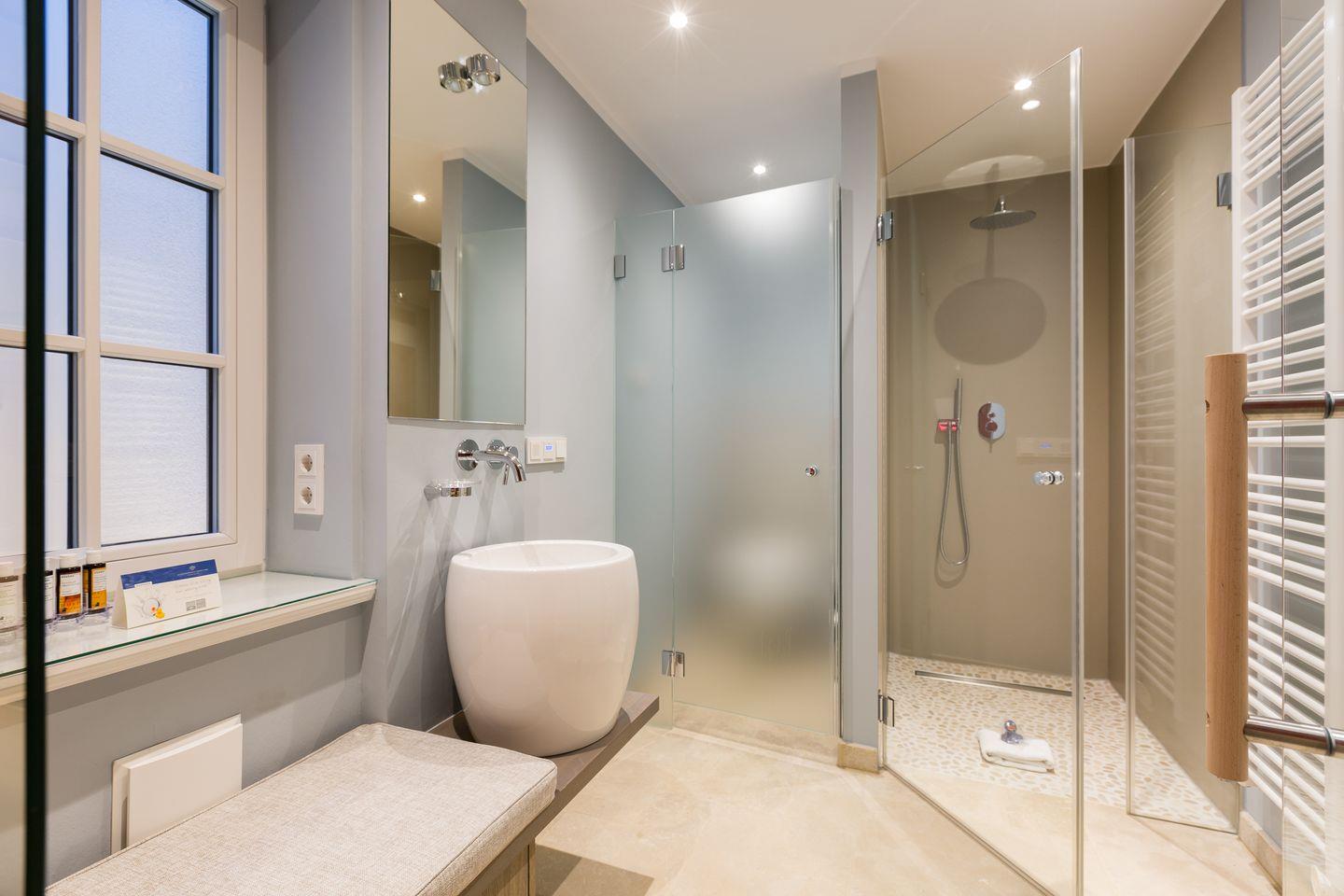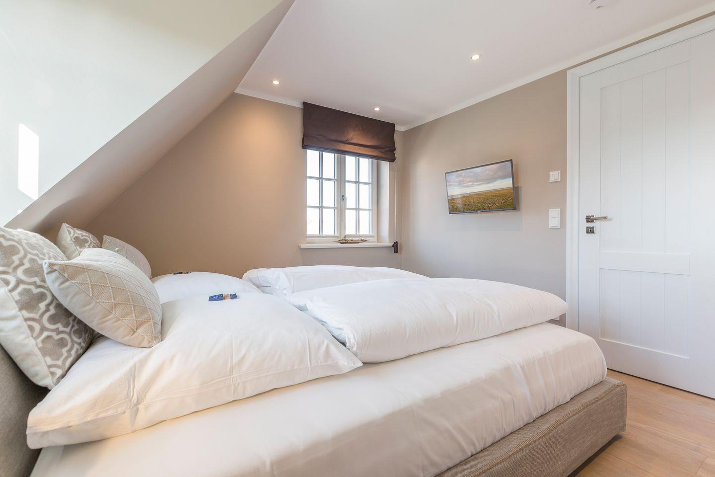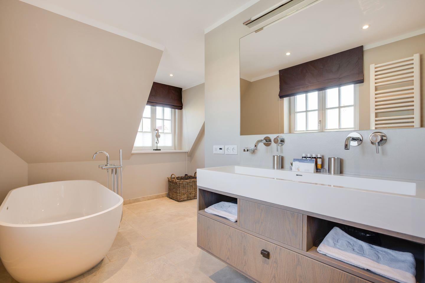 Obergeschoss: 1 Schlafraum mit Doppelbett (180x200cm), Flatscreen-TV, großes Bad mit separatem WC, einer großen Dusche mit Rainshower und freistehender Badewanne