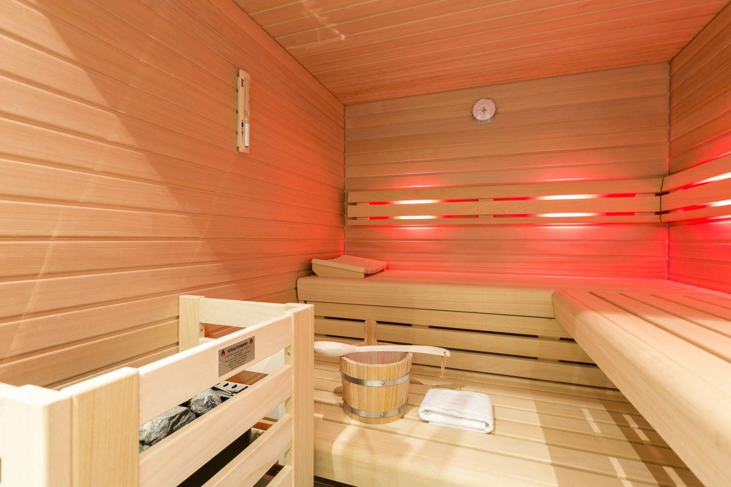 Untergeschoss: 1 Raum mit Doppelbett (180x200cm), Flatscreen-TV, Bad mit WC und großer Dusche mit Rainshower, frontverglaste Sauna, Waschmaschine und Wäschetrockner