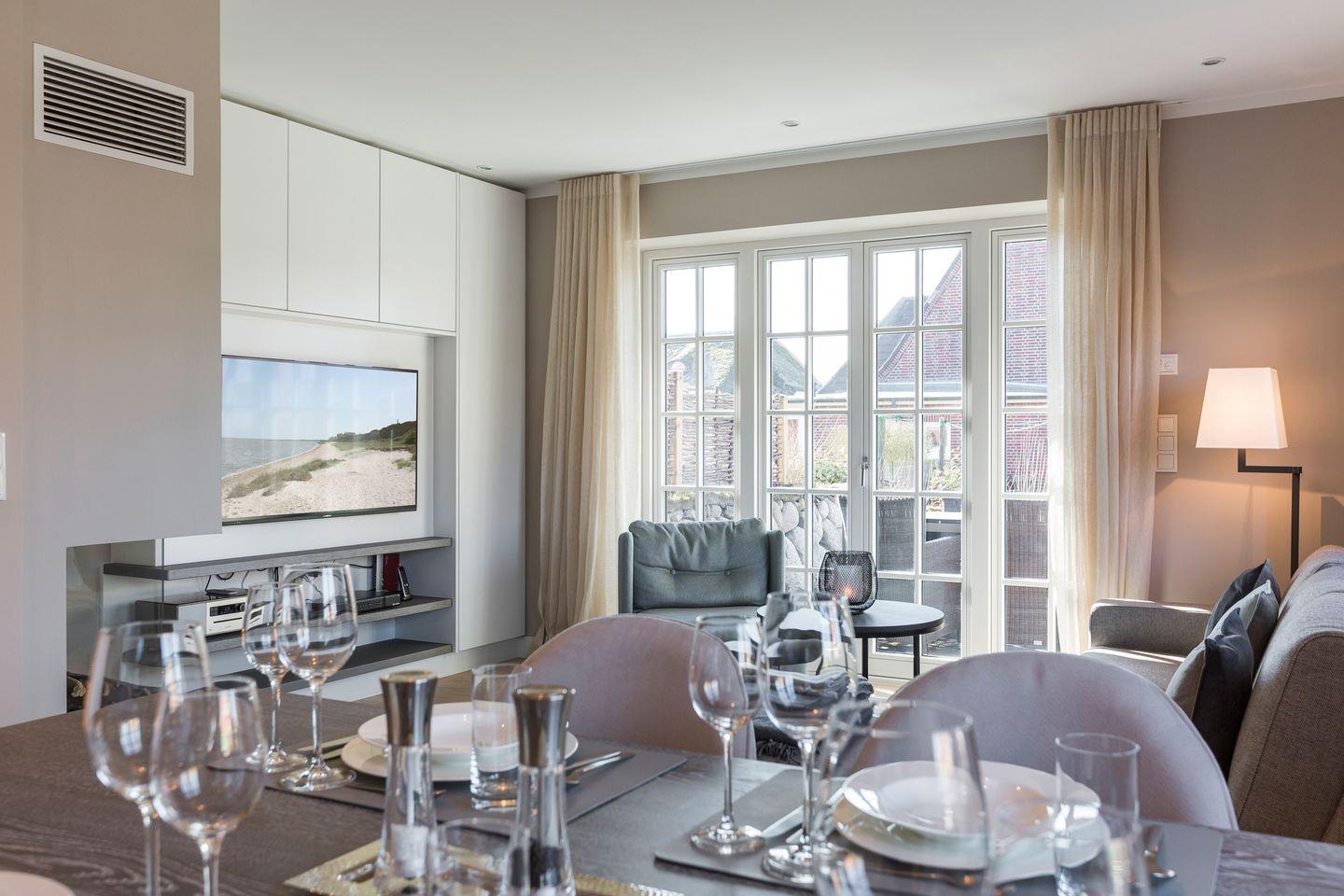 Erdgeschoss: Wohn- und Esszimmer mit Gaskamin, Flatscreen-TV, Blu-Ray-Player, WLAN, Sonoro Hifi-Anlage, integrierte Küchenzeile mit Induktionsherd, Geschirrspüler, kombinierte Mikrowelle/Backofen, Gäste-WC, Westterrasse mit Gartenmöbeln und Strandkorb.
