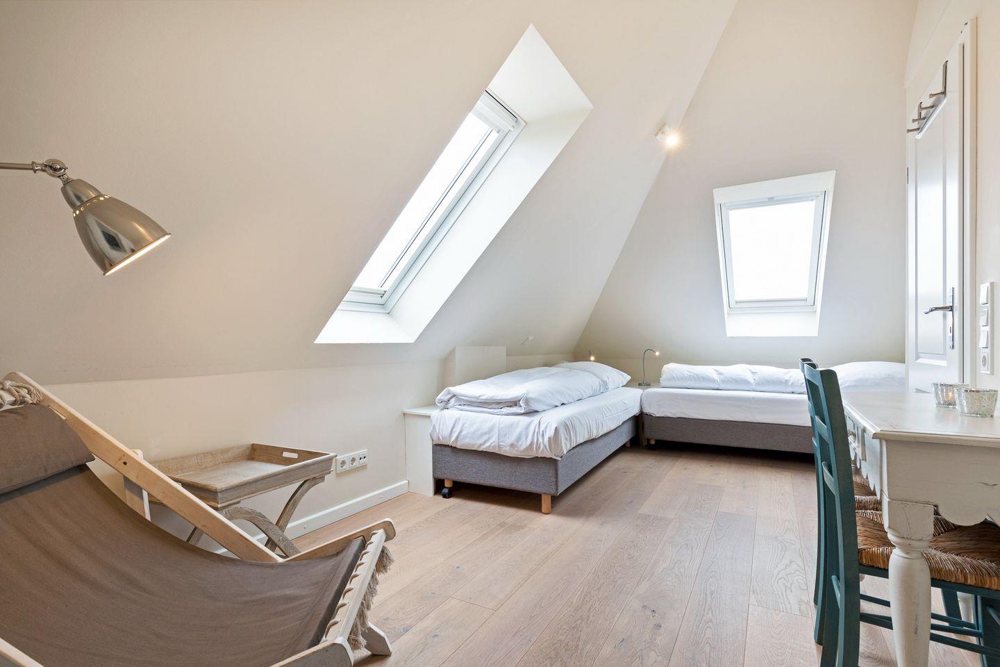 Im Obergeschoss befindet sich der Wohnraum mit Flatscreen-TV, Telefon, DVD-Player, Radio-CD und die integrierte Küche mit Backofen, Geschirrspüler. Der Schlafraum mit Doppelbett (180x200) ist großzügig und gemütlich. Ihr Wohlfühlbad mit Dusche/WC befindet sich auf derselben Etage. Im Dachgeschoss befindet sich ein weiterer Raum mit 2 Einzelbetten (90x200cm) und Flatscreen-TV, sowie ein weiteres Bad mit Wanne und WC. 1 kleiner Raum mit Wasch/Trockner ist ebenfalls vorhanden.