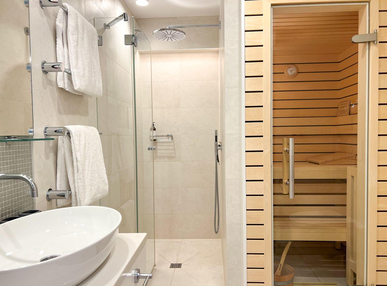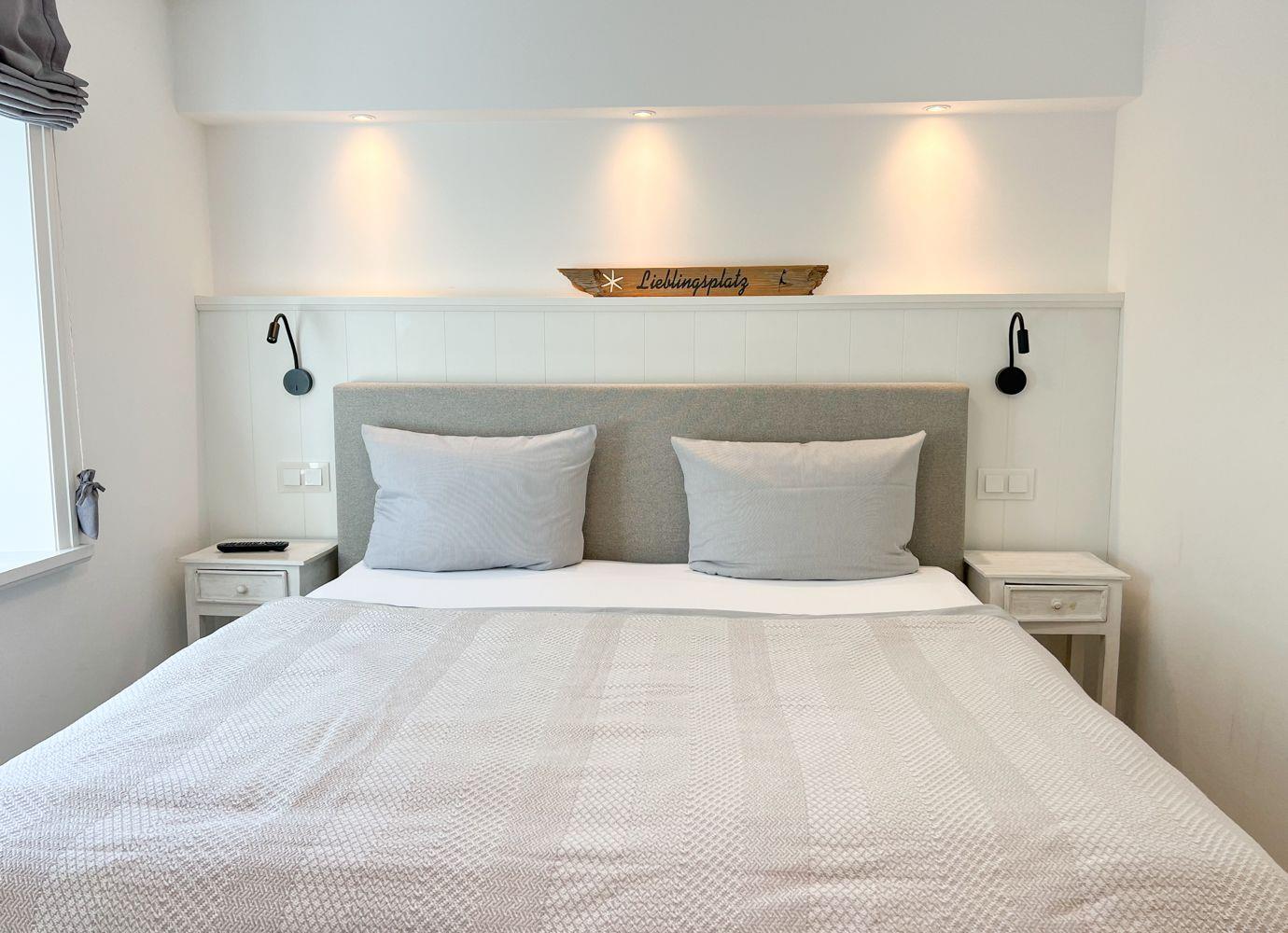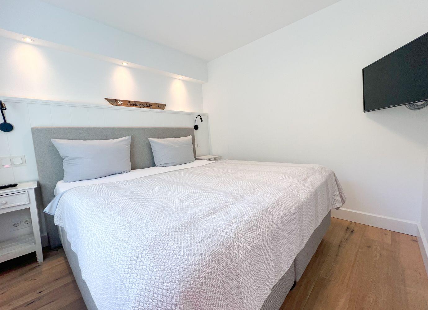 Nach einer ausgedehnten Radtour oder einem Spaziergang durch die Insel lädt die private Sauna im modernen Bad zum Wohlfühlen ein. Die bodengleiche Dusche, ein Handtuchheizkörper und stilvolle Details runden das Wellnessgefühl ab. Im angrenzenden Schlafzimmer erwartet Sie ein hochwertiges Doppelbett (180 × 200 cm), ein zweiter Flatscreen-TV und ausreichend Stauraum.