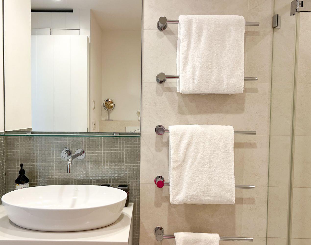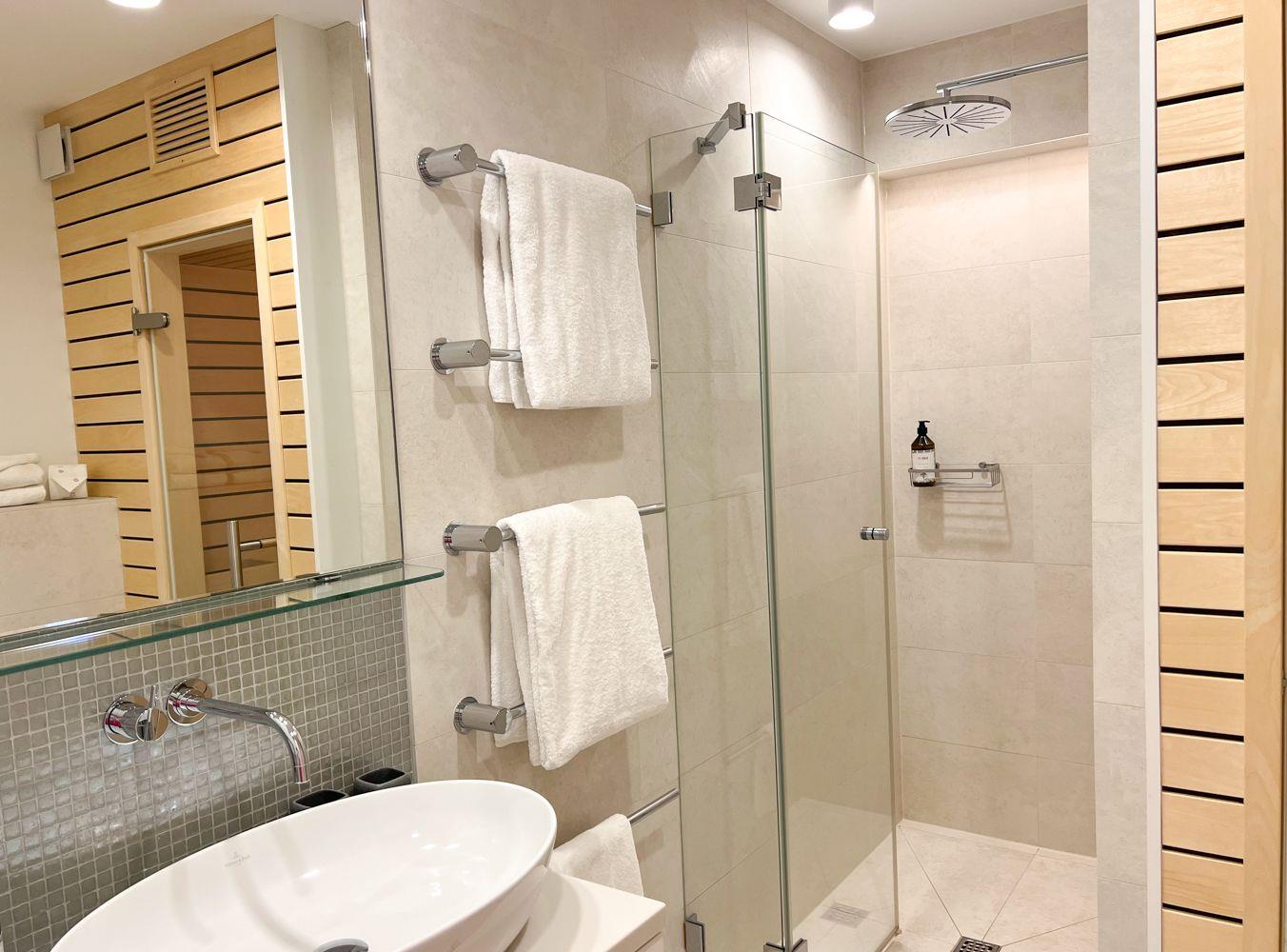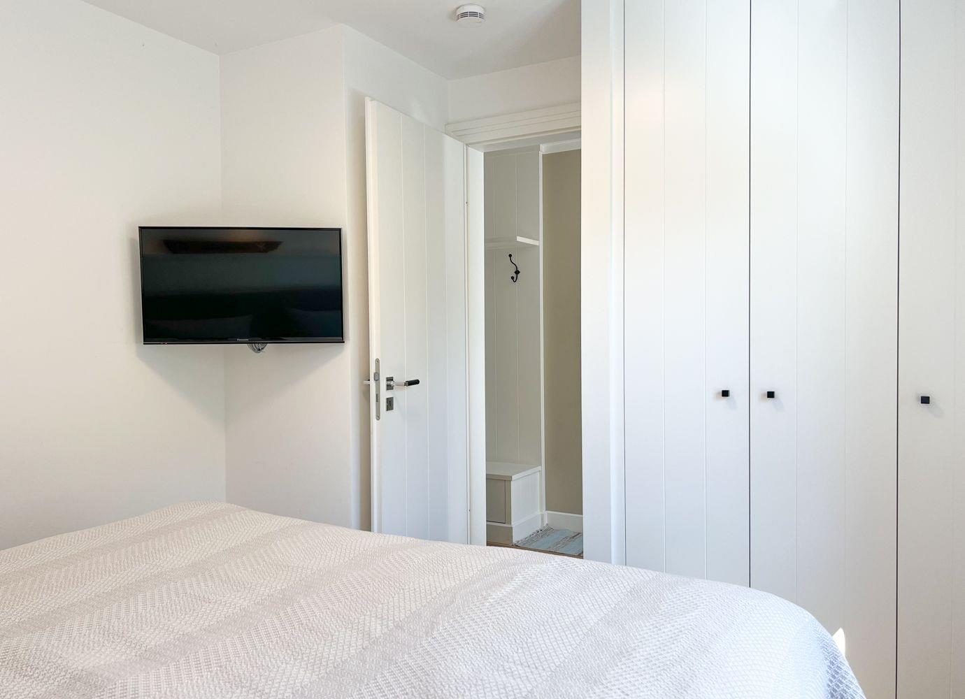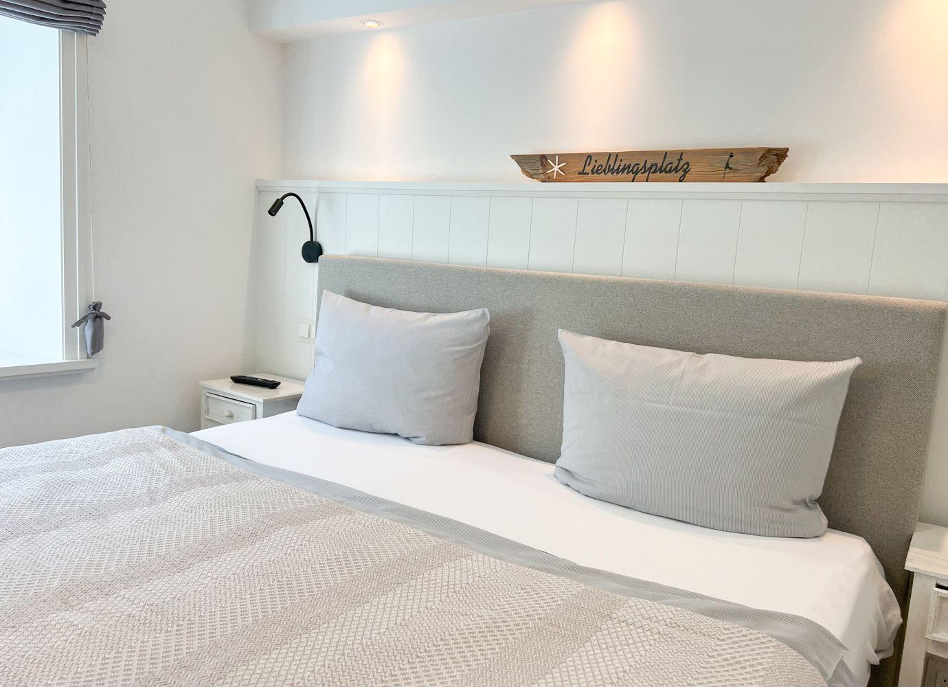Nach einer ausgedehnten Radtour oder einem Spaziergang durch die Insel lädt die private Sauna im modernen Bad zum Wohlfühlen ein. Die bodengleiche Dusche, ein Handtuchheizkörper und stilvolle Details runden das Wellnessgefühl ab. Im angrenzenden Schlafzimmer erwartet Sie ein hochwertiges Doppelbett (180 × 200 cm), ein zweiter Flatscreen-TV und ausreichend Stauraum.