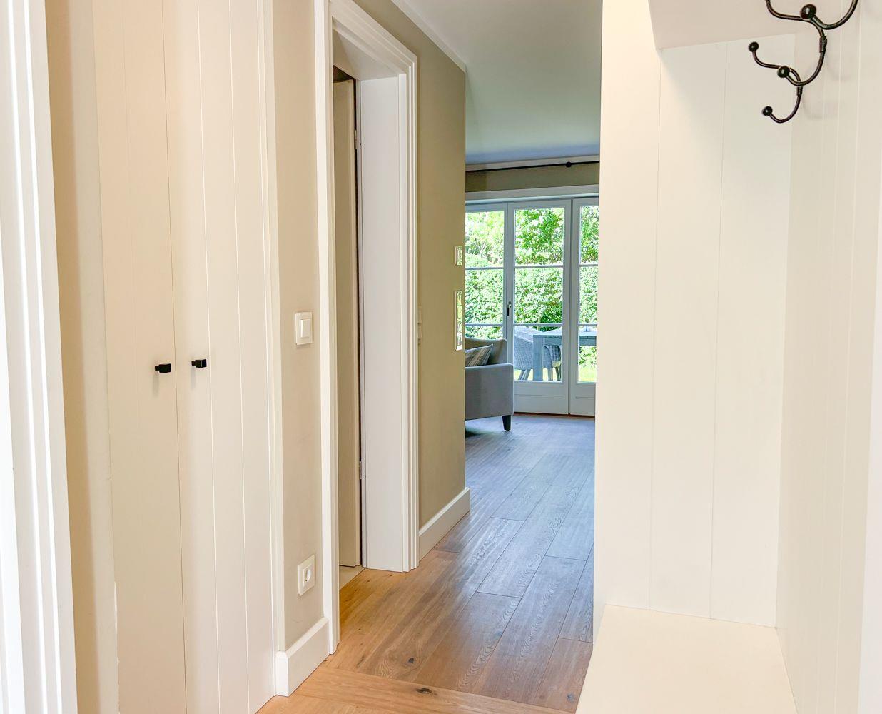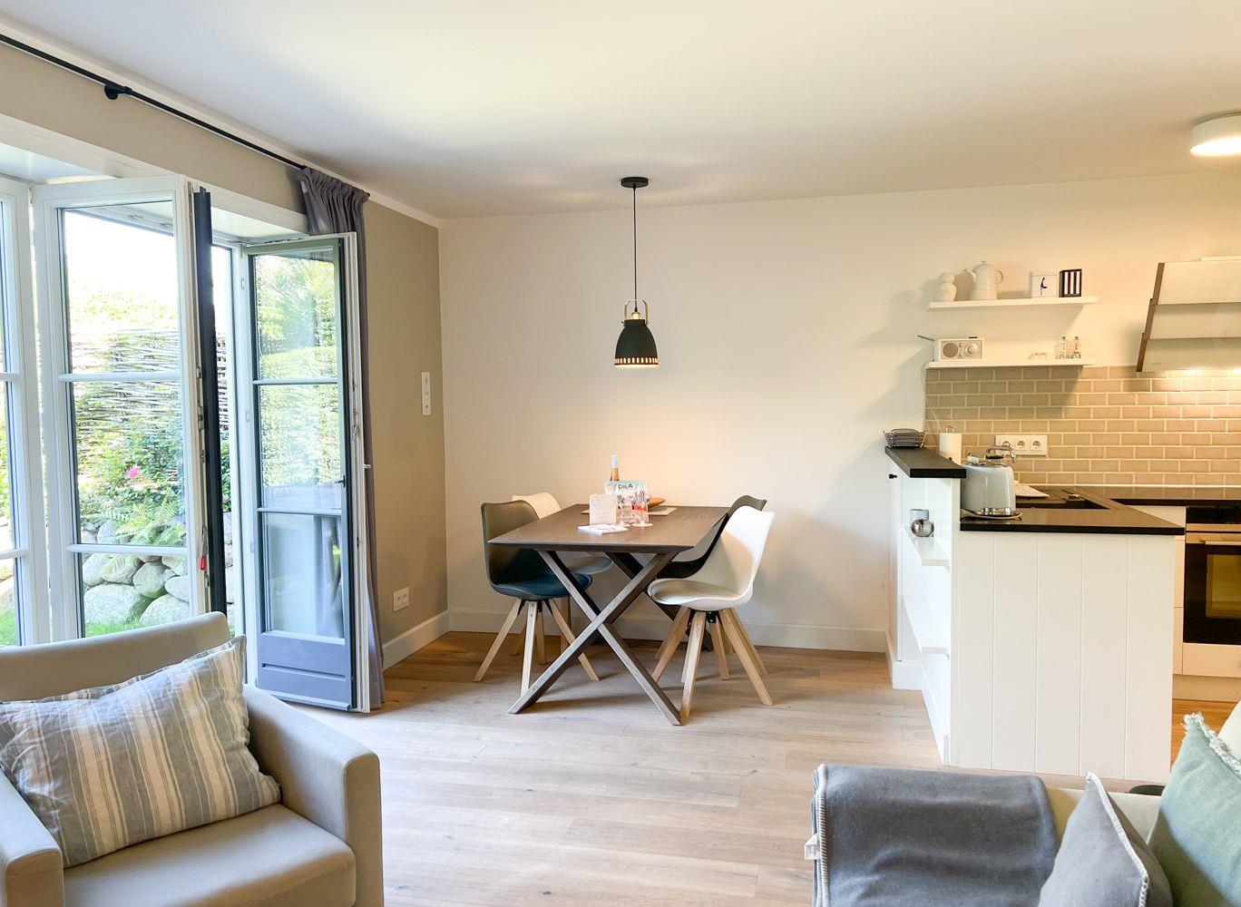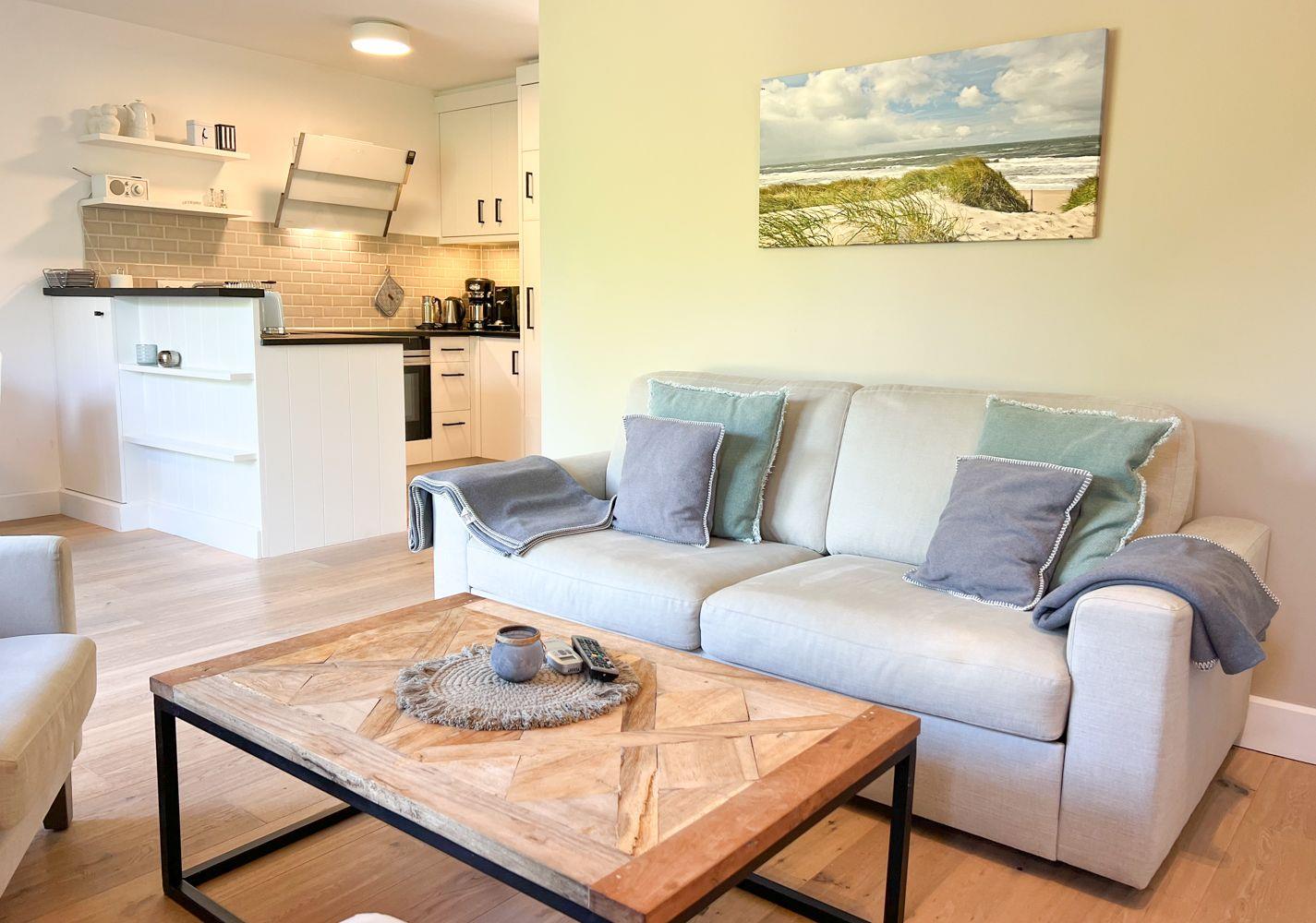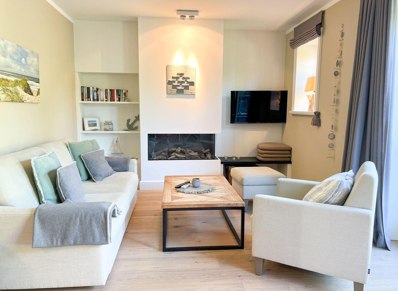 Das helle Wohnzimmer besticht durch maritimen Charme, hochwertige Möbel und gemütliche Details. Große Terrassentüren öffnen den Blick ins Grüne und lassen viel Licht herein. Ein Gaskamin sorgt für stimmungsvolle Abende, das Schlafsofa bietet eine komfortable zusätzliche Schlafmöglichkeit. Ob mit einem guten Buch, einem Film oder Musik über das Bluetooth-Dock – hier lässt es sich wunderbar entspannen.