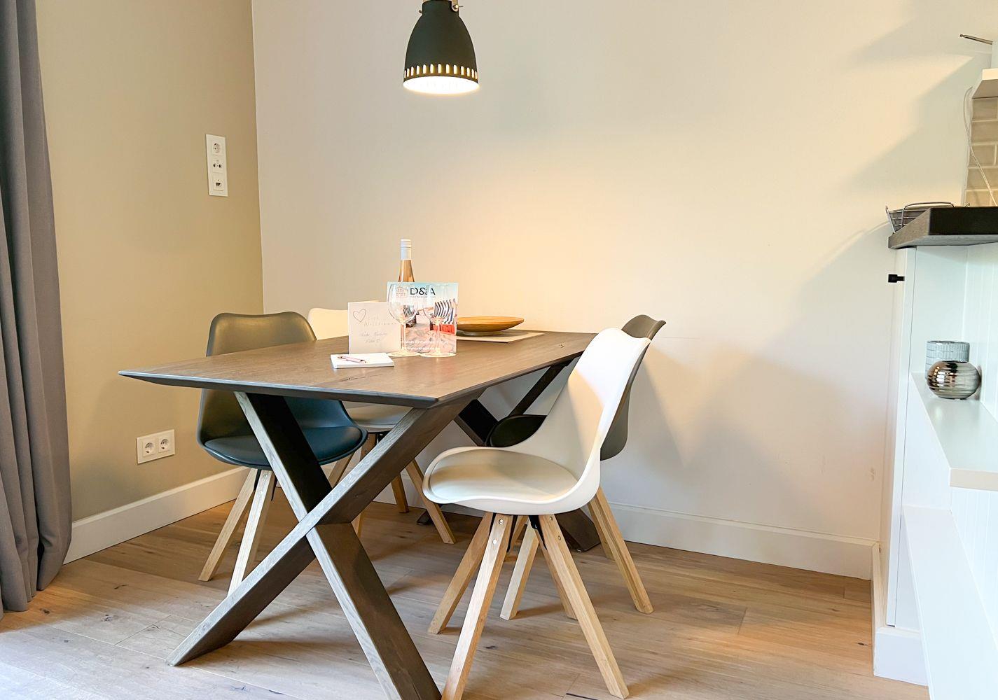 Weitere Pluspunkte: Fußbodenheizung in der gesamten Wohnung, WLAN, ein eigener Privatparkplatz direkt vor der Tür sowie die Allergikerfreundlichkeit der Unterkunft. Wer mit Freunden oder Großeltern reist, kann die benachbarte Ferienwohnung „Wellenbrecher“ im selben Haus dazubuchen – perfekt für den gemeinsamen, aber dennoch individuellen Urlaub.