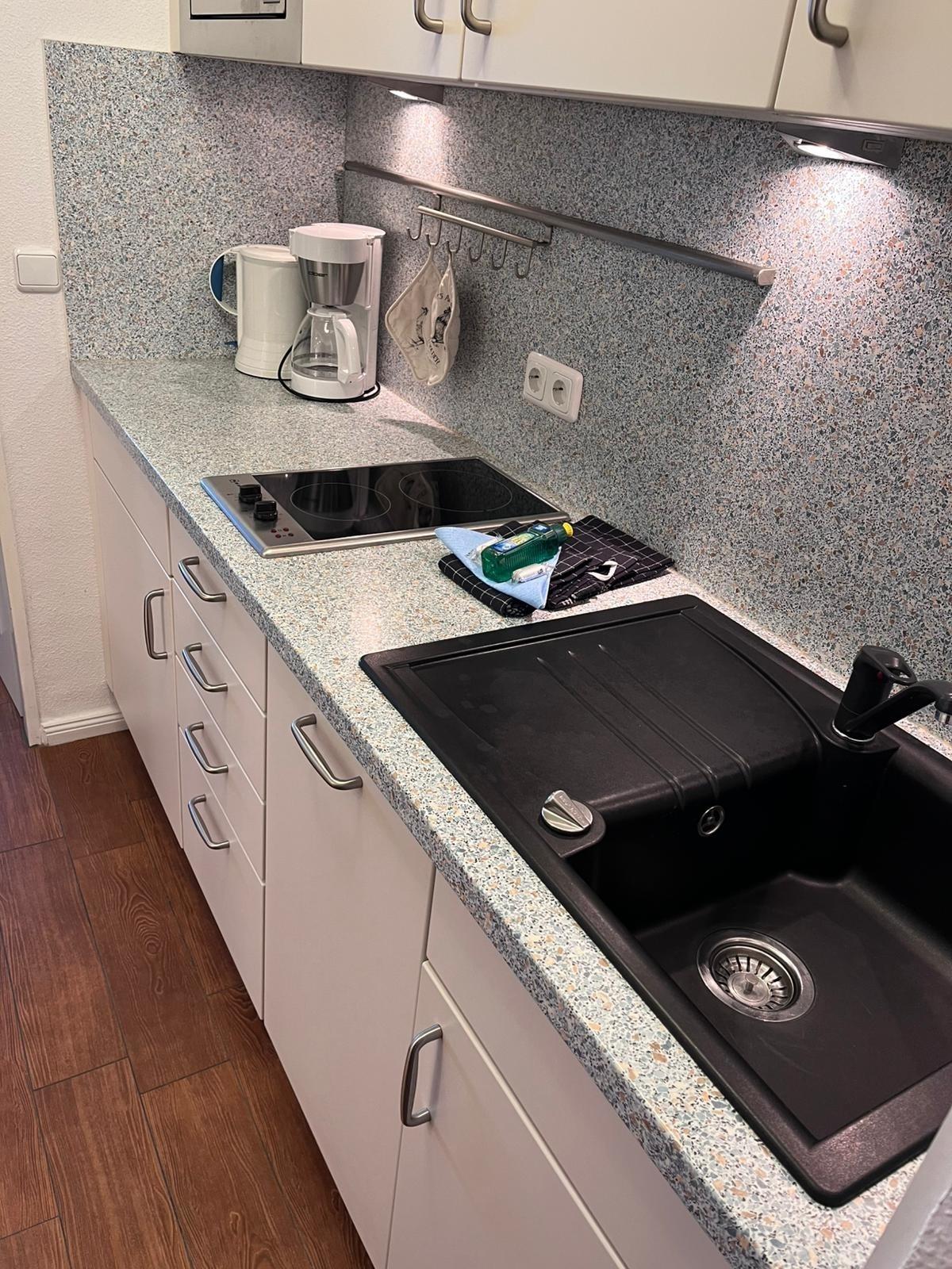 Vorflur mit moderner neuer Küchenzeile mit Geschirrspüler, modernes renoviertes helles Duschbad/WC, heller modern eingerichteter Wohn-/Schlafraum mit einem Doppelschrankbett, Sitzgarnitur, Essplatz am Fenster, Flachbildfernseher, CD-Player mit Radio, hauseigenes freies WLAN. Ein Balkon rundet dieses schöne, hell und freundlich eingerichtete ca. 34 qm große Appartement ab. KEIN Teppichboden. Ein Abstellplatz in der Tiefgarage kann hinzugemietet werden. Der Tiefgaragenplatz muss bestellt werden, ansonsten verfällt der Anspruch!