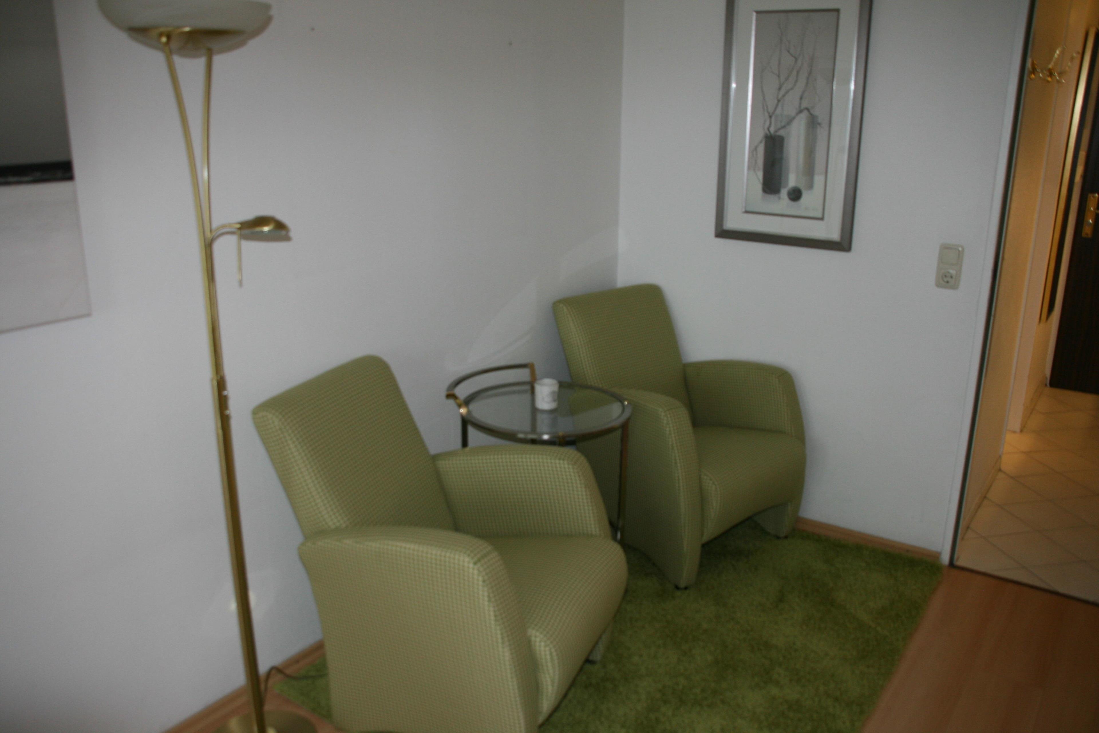 Vorflur mit Küchenzeile, neues helles Duschbad/WC, heller Wohn-/Schlafraum mit einem Doppelschrankbett, kl. Sitzgruppe (2 Sessel), Essplatz am Fenster, Flachbildfernseher, CD-Player mit Radio, hauseigenes freies WLAN.