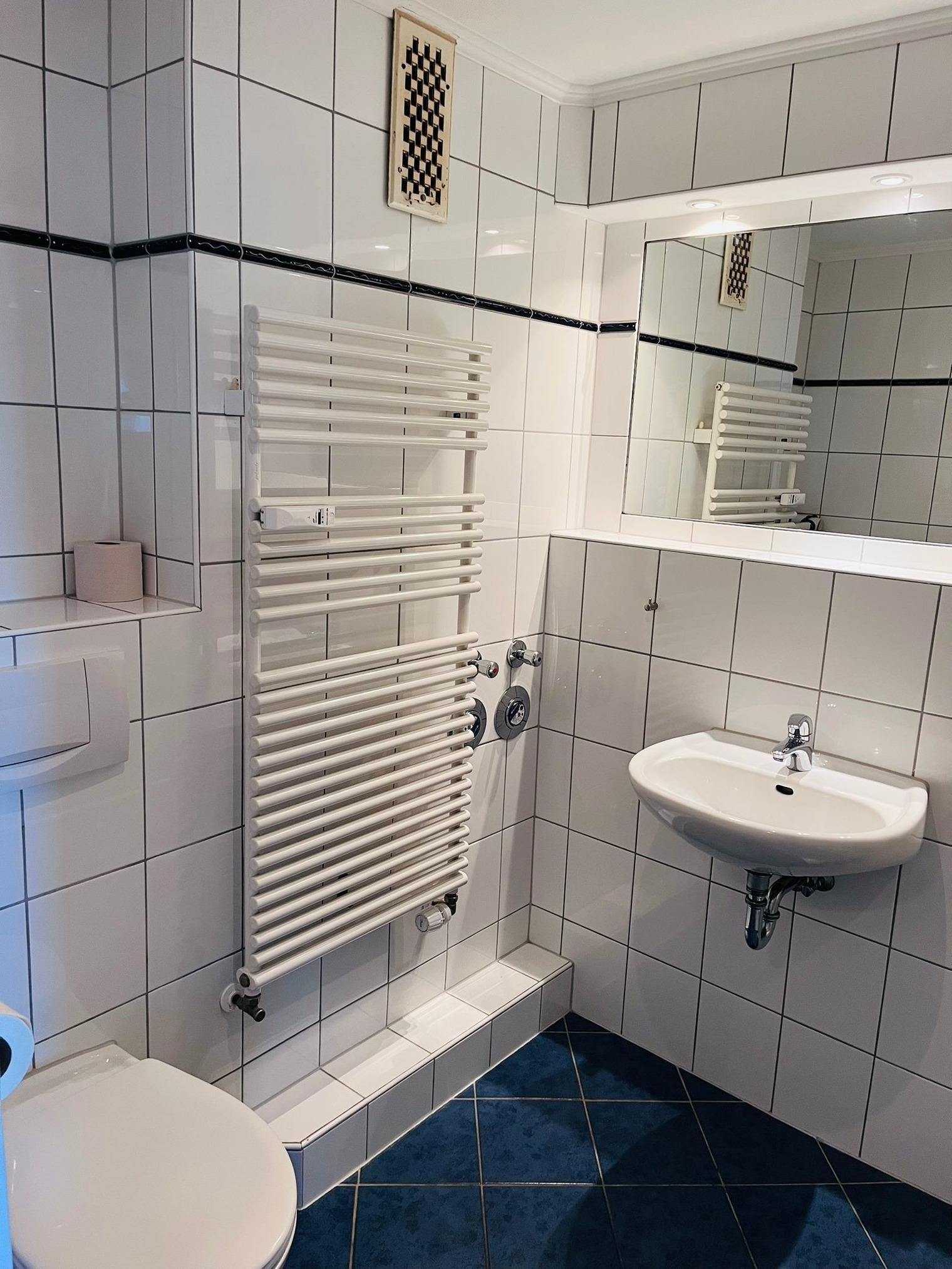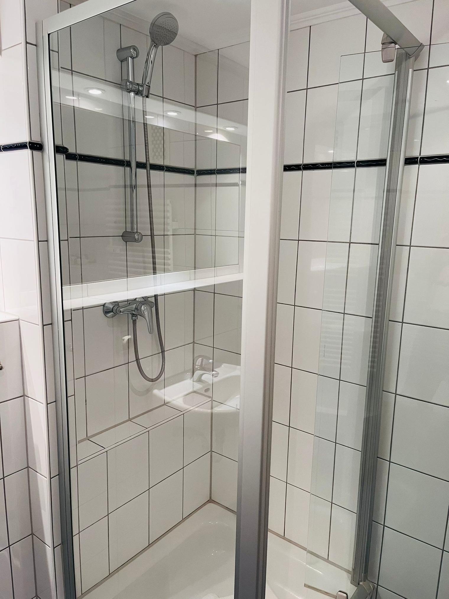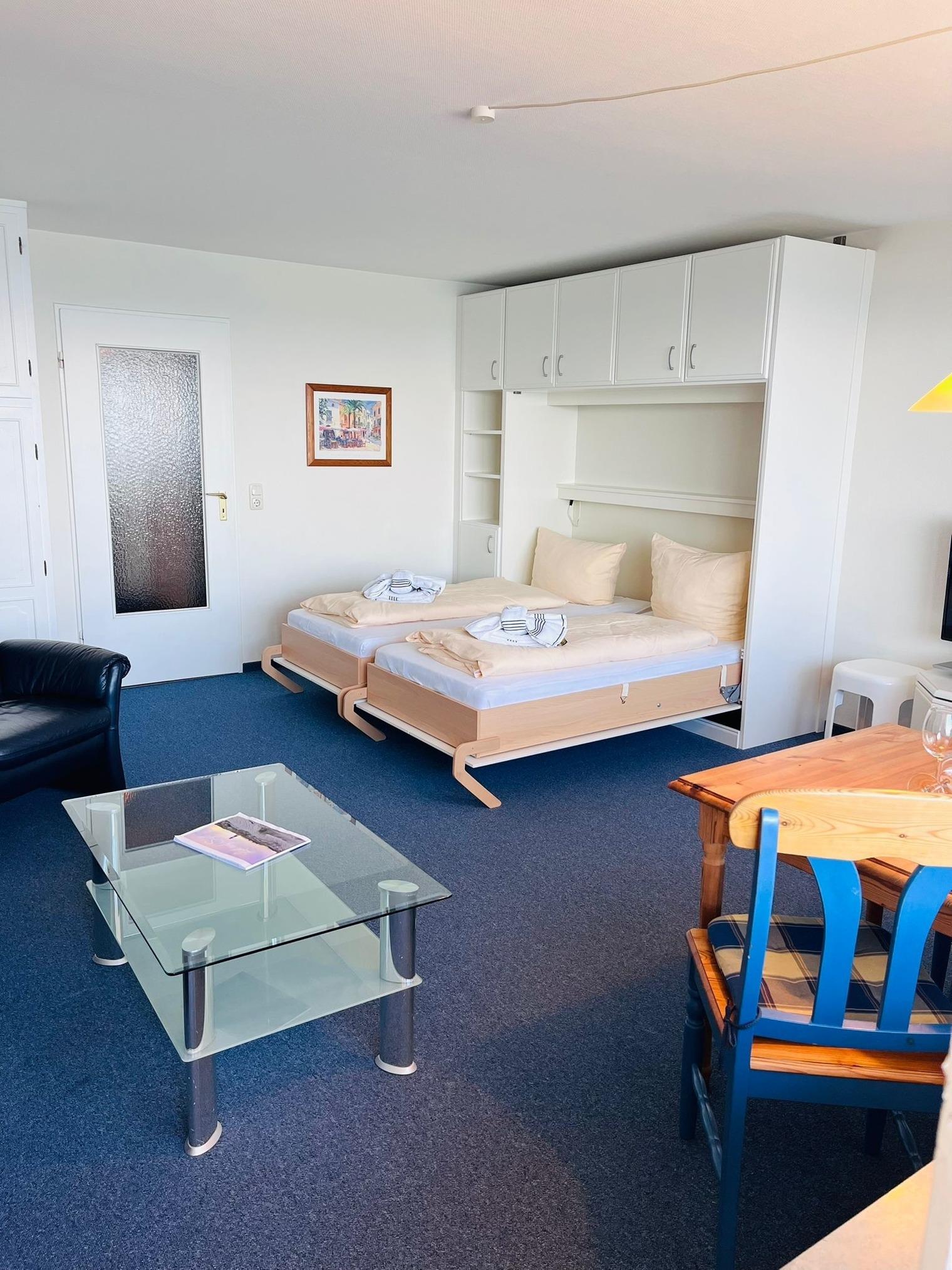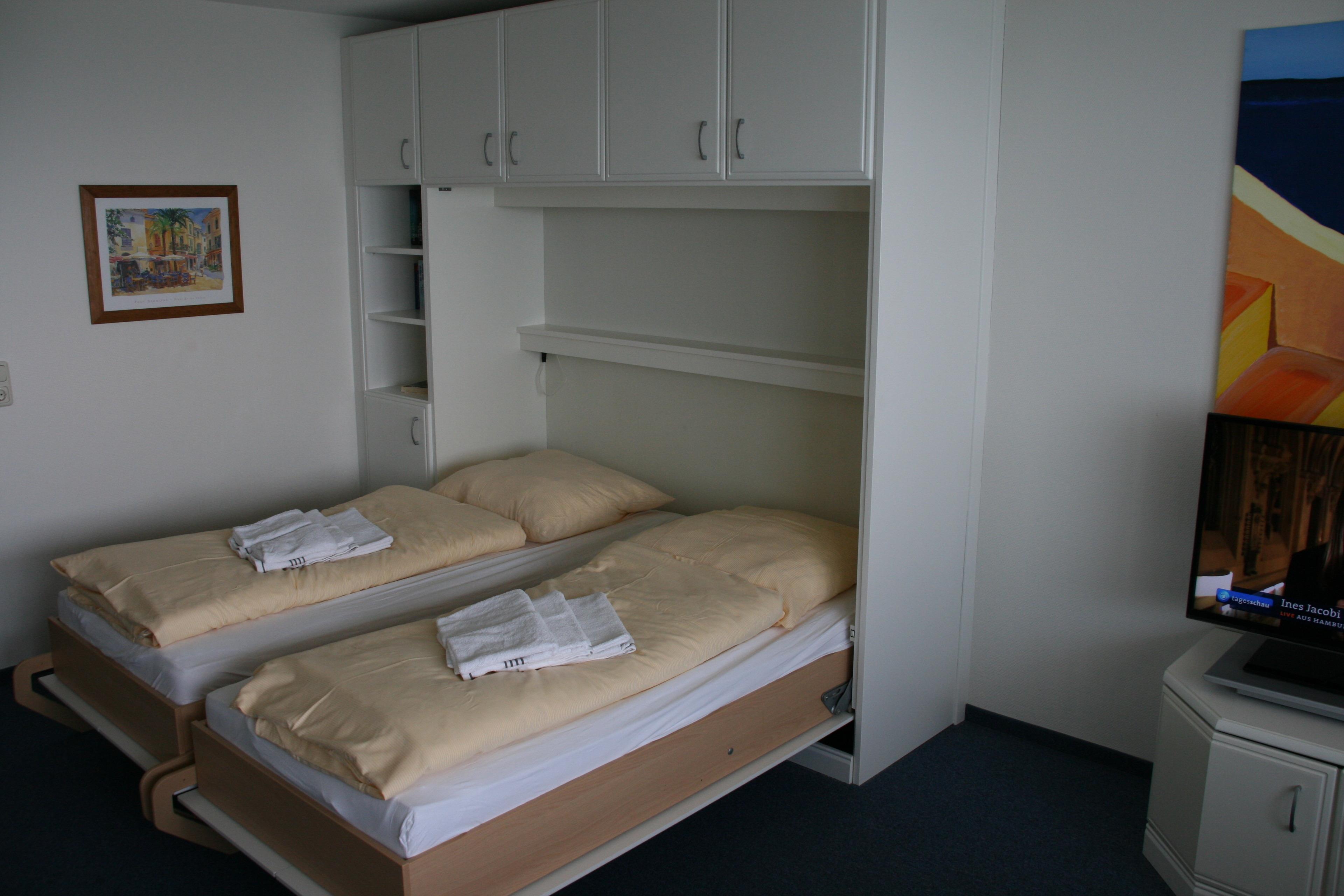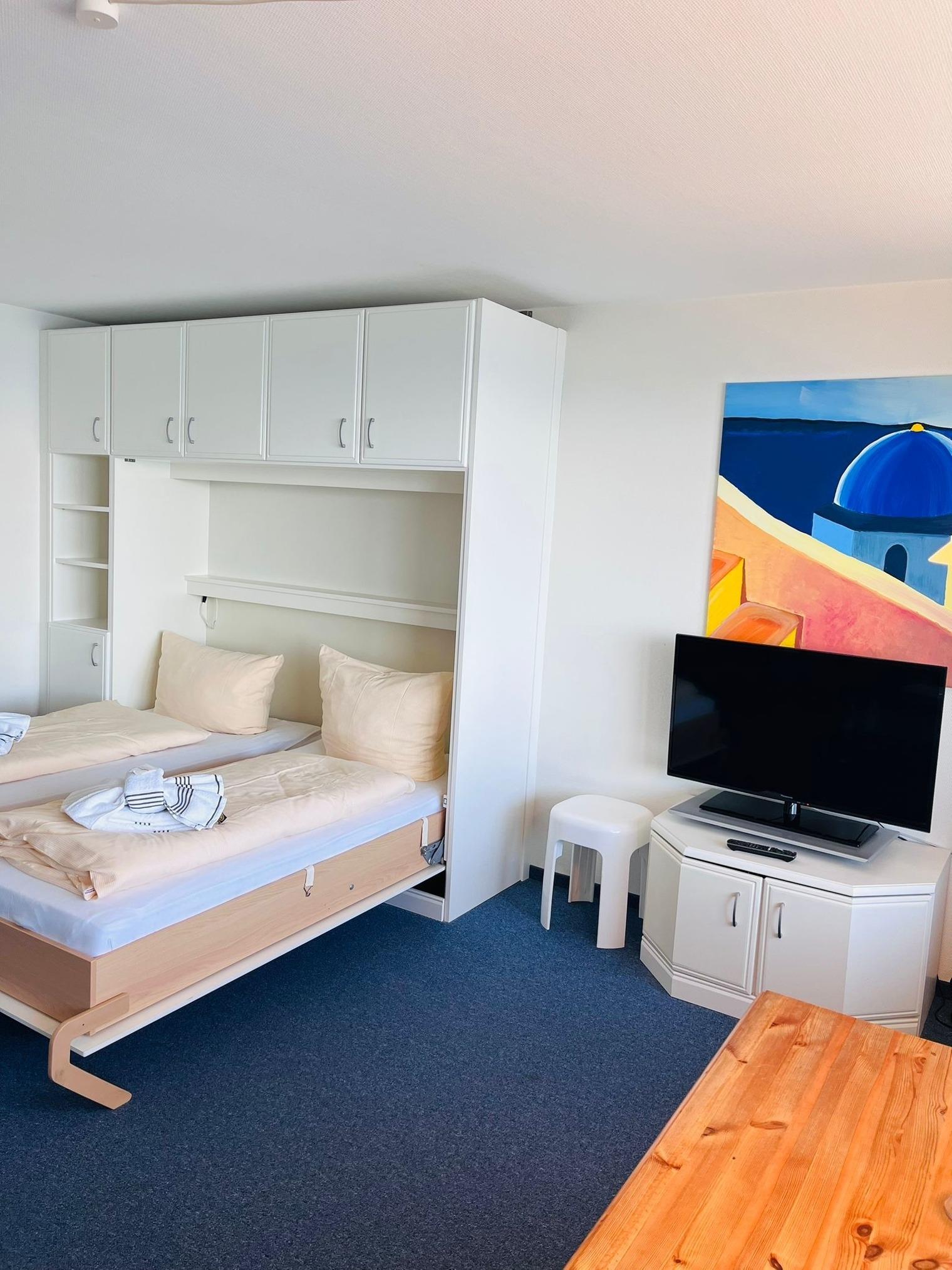 Vorflur, kleine sep. moderne Küche mit Geschirrspüler, helles Duschbad/WC, großer Wohn-/Schlafraum mit einer moderen Schrankwand mit zwei Einzelschrankbetten. Sitzgarnitur (Sofa und Sessel), Essplatz, Flachbildfernseher, Radio / CD-Player. hauseigenes freies WLAN.
