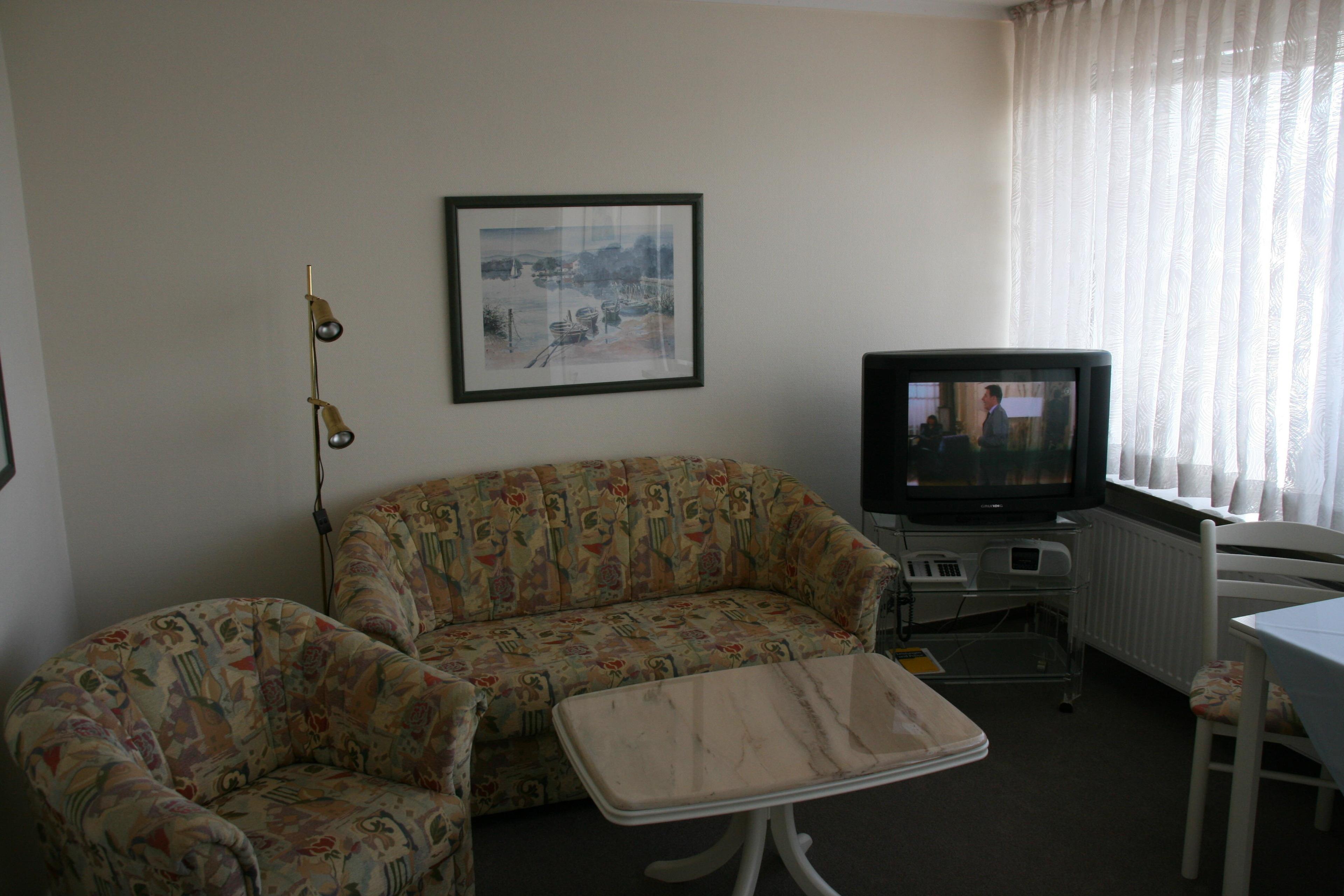 Vorflur, separate kl. Küche, Duschbad / WC, heller Wohn-/Schlafraum mit einem Doppelschrankbett (zwei einzelne Matratzen), Sofa, Sessel, Flachbildfernseher, Radio. Hauseigenes freies WLAN.