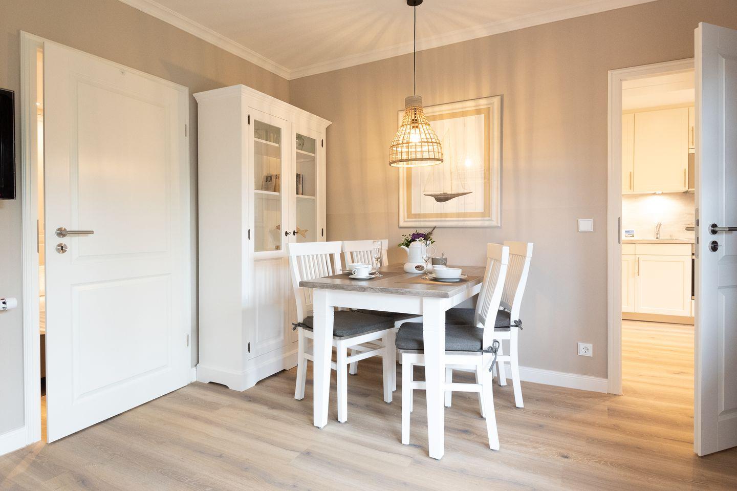 Wohn-/Essbereich: Geräumiger Wohnbereich mit einer gemütlichen Sofaecke (Schlafsofa), welche in sekundenschnelle einen Schlafplatz für 2 Personen ermöglicht. Der schöne Esstisch mit Platz für 4 Personen grenzt direkt an den Wohnbereich sowie an die geschlossene Küche. Ebenfalls haben Sie von hier Zugang zur möblierten Südterrasse mit Strandkorb und Garten.