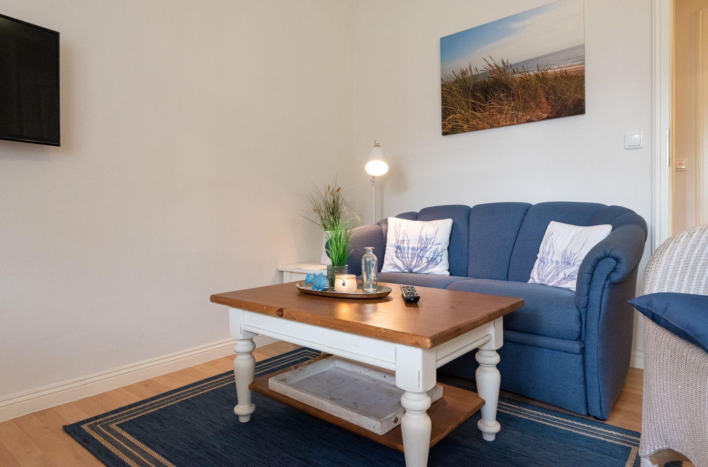Wohn-/Ess- und Schlafbereich: Heller Wohnbereich mit gemütlicher Sitzecke und schönen Essbereich. Die Schrankwand im Wohnbereich bietet Ihnen Sekundenschnelle eine bequeme Schlafstätte für 2 Personen. Ebenfalls haben Sie vom Wohnbereich aus Zugang auf die möblierte Südterrasse mit Strandkorb und Garten.
