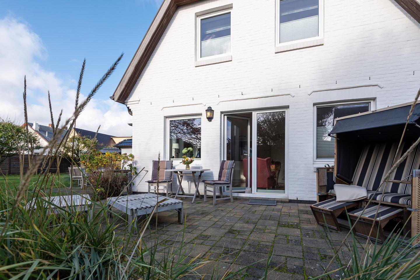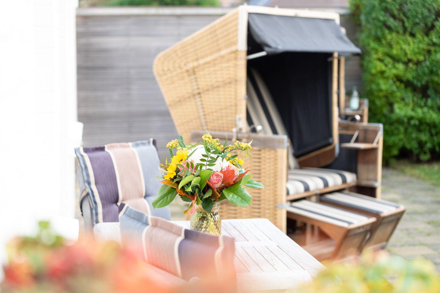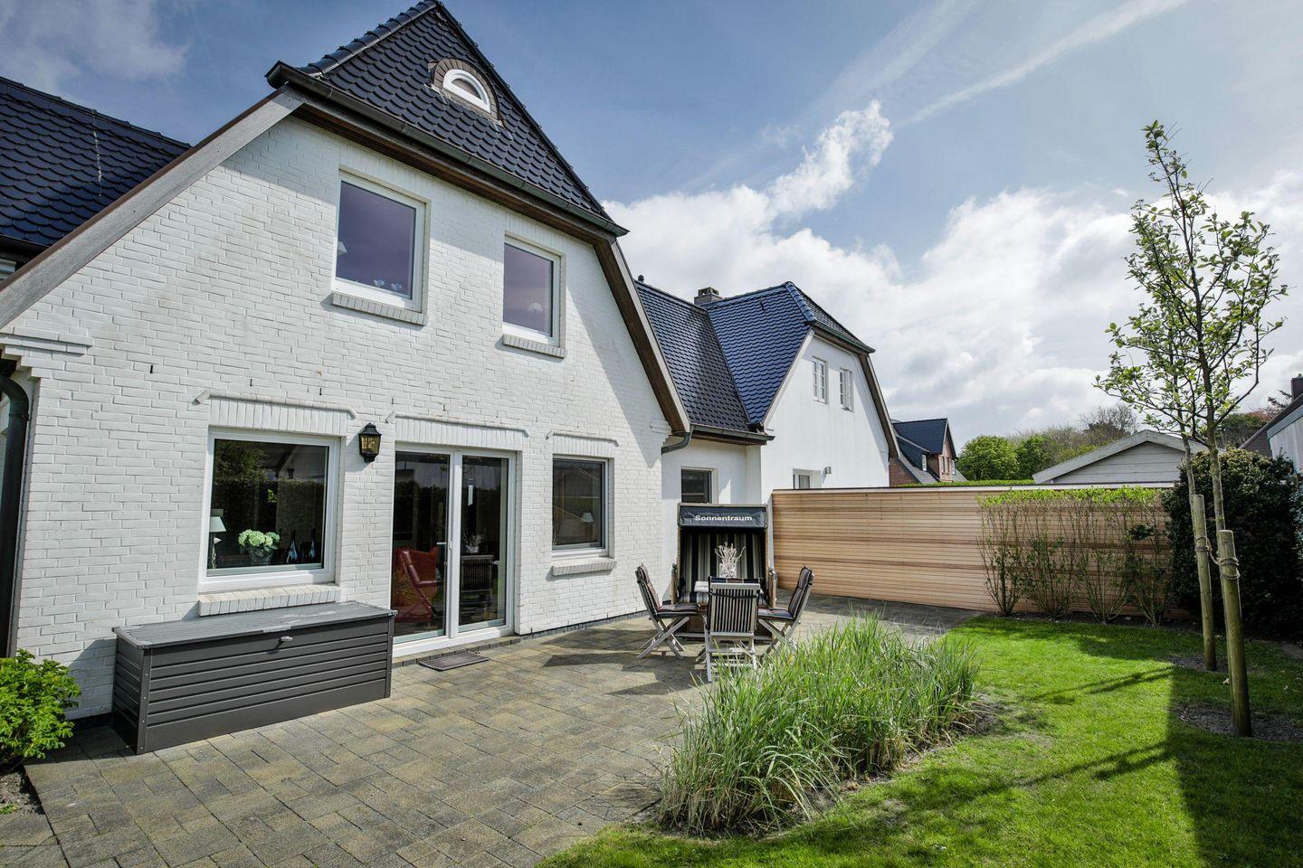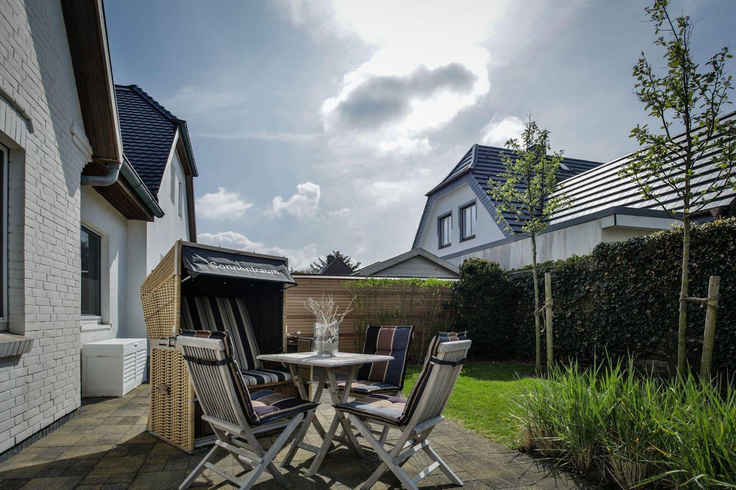Helle 3-Zimmer-Ferienwohnung in ruhiger Lage von Westerland mit Terrasse und Sauna im Gemeinschaftsgarten.