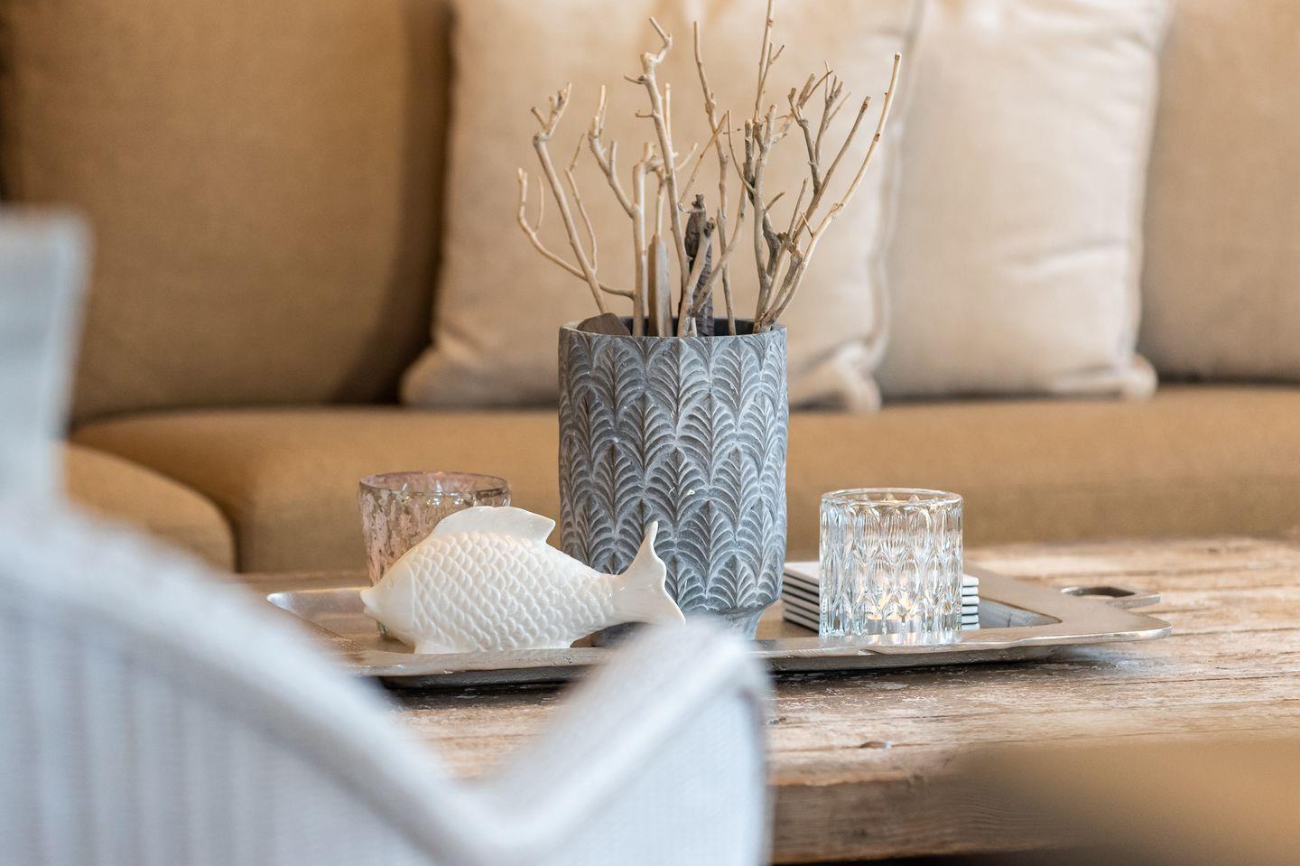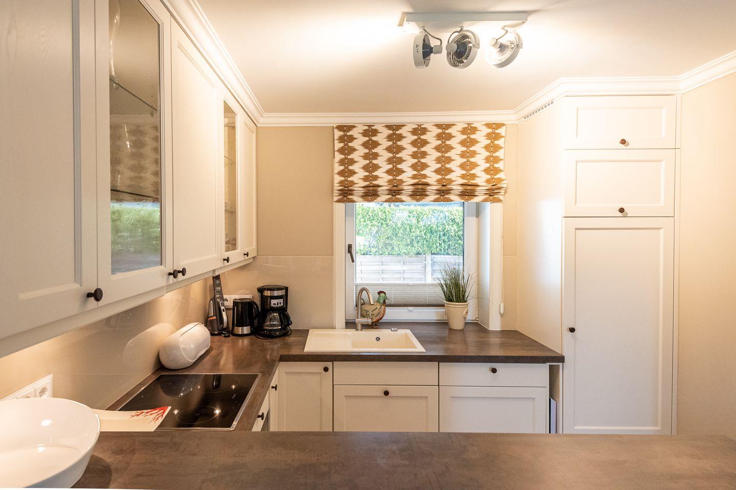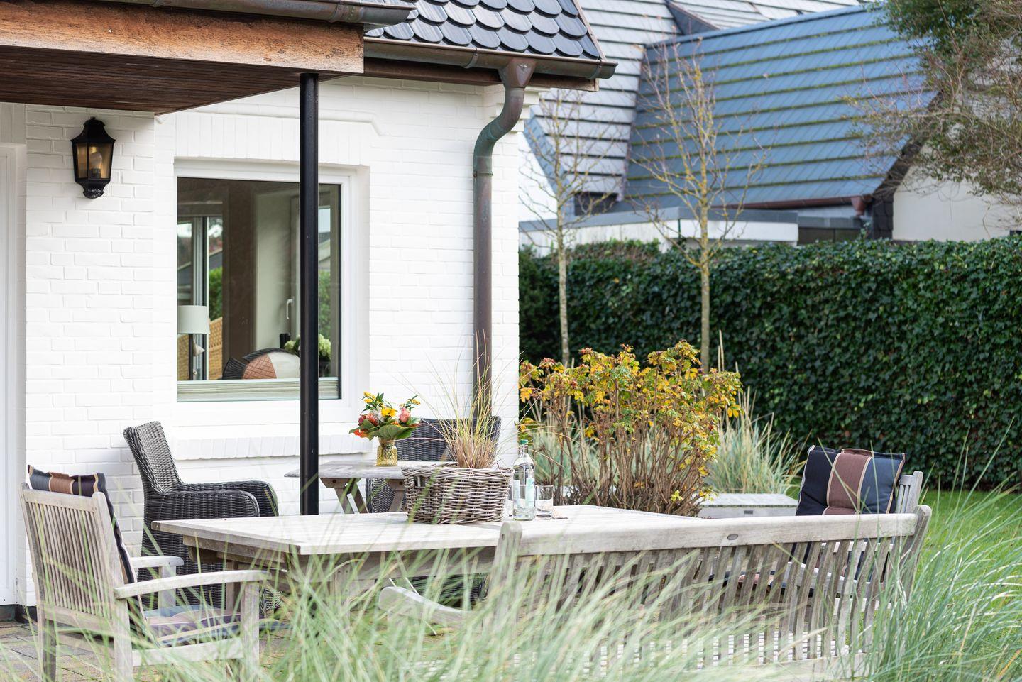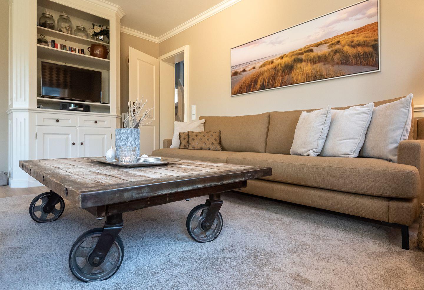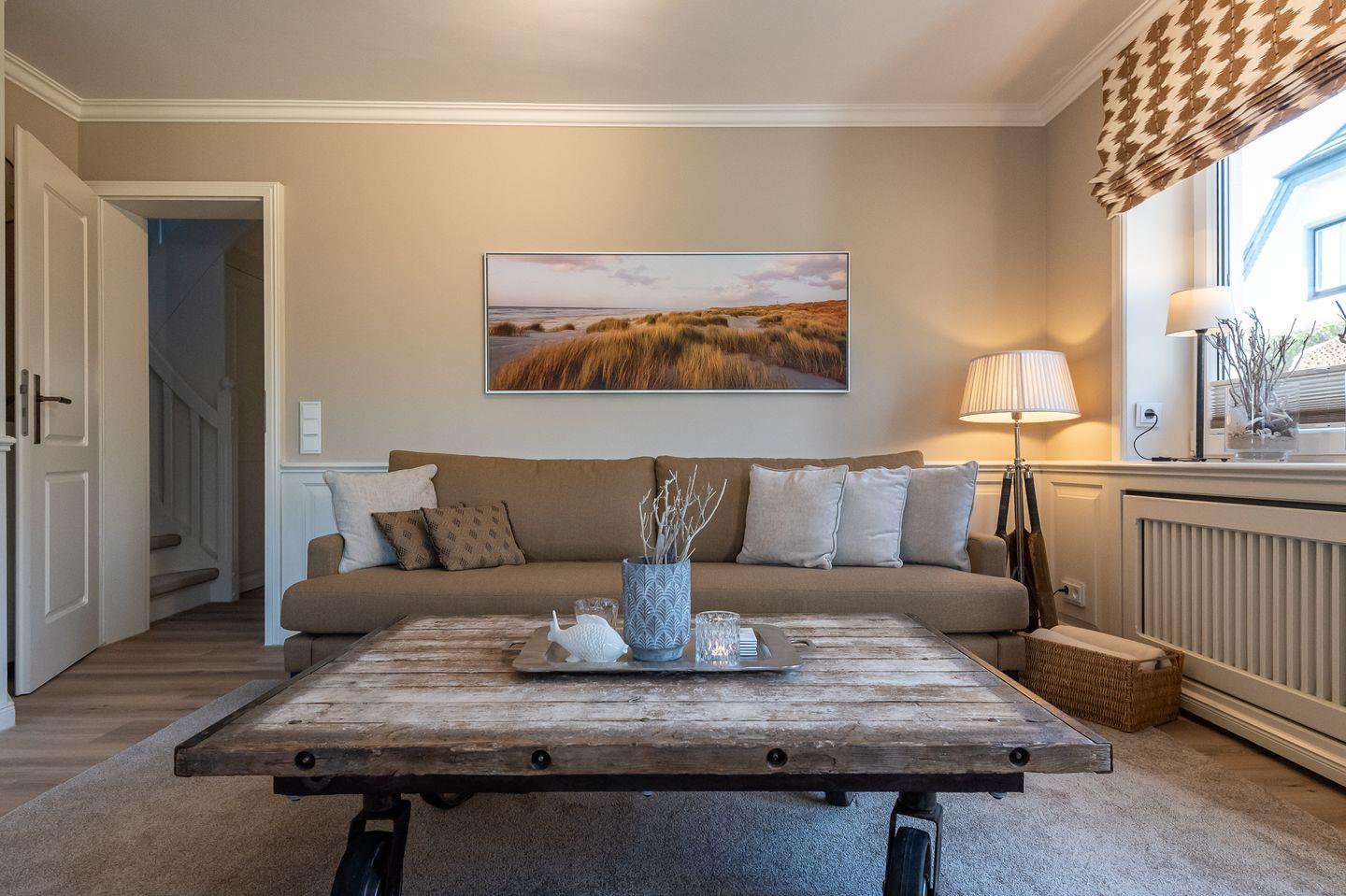 Koch-/Wohn-/Essbereich: Die gut ausgestattete Küche im Landhausstil wird von einem großzügigen Essbereich für bis zu 6 Personen vom Wohnbereich abgegrenzt. Die gemütlichen Polstermöbel und Rattansessel im Wohnbereich laden zum Verweilen ein. Von dem Wohnbereich haben Sie ebenfalls Zutritt auf die mit Gartenmöbeln möblierte West-Terrasse. In Richtung Süden liegt eine weitere Terrasse mit zwei Strandkörben.